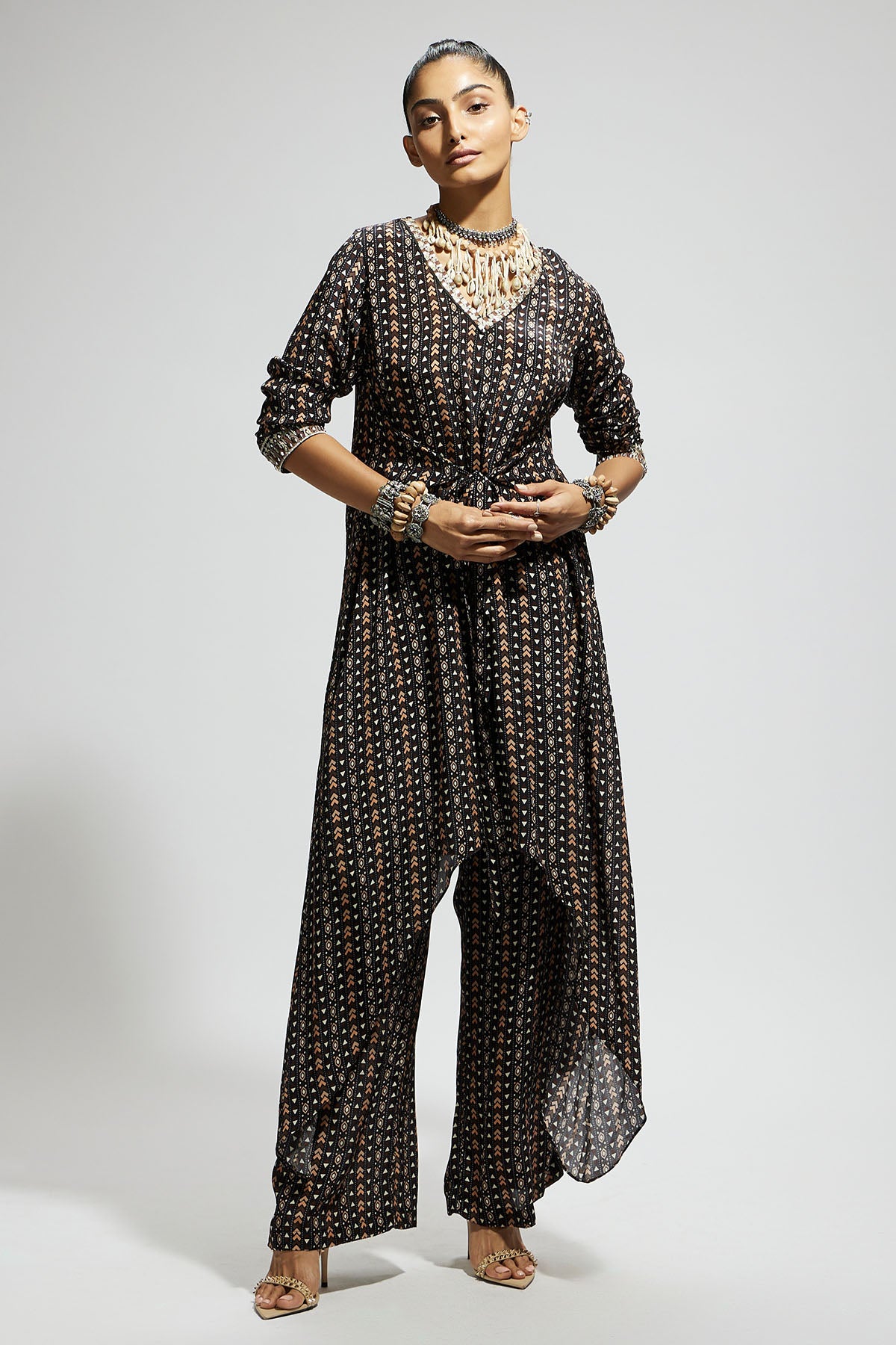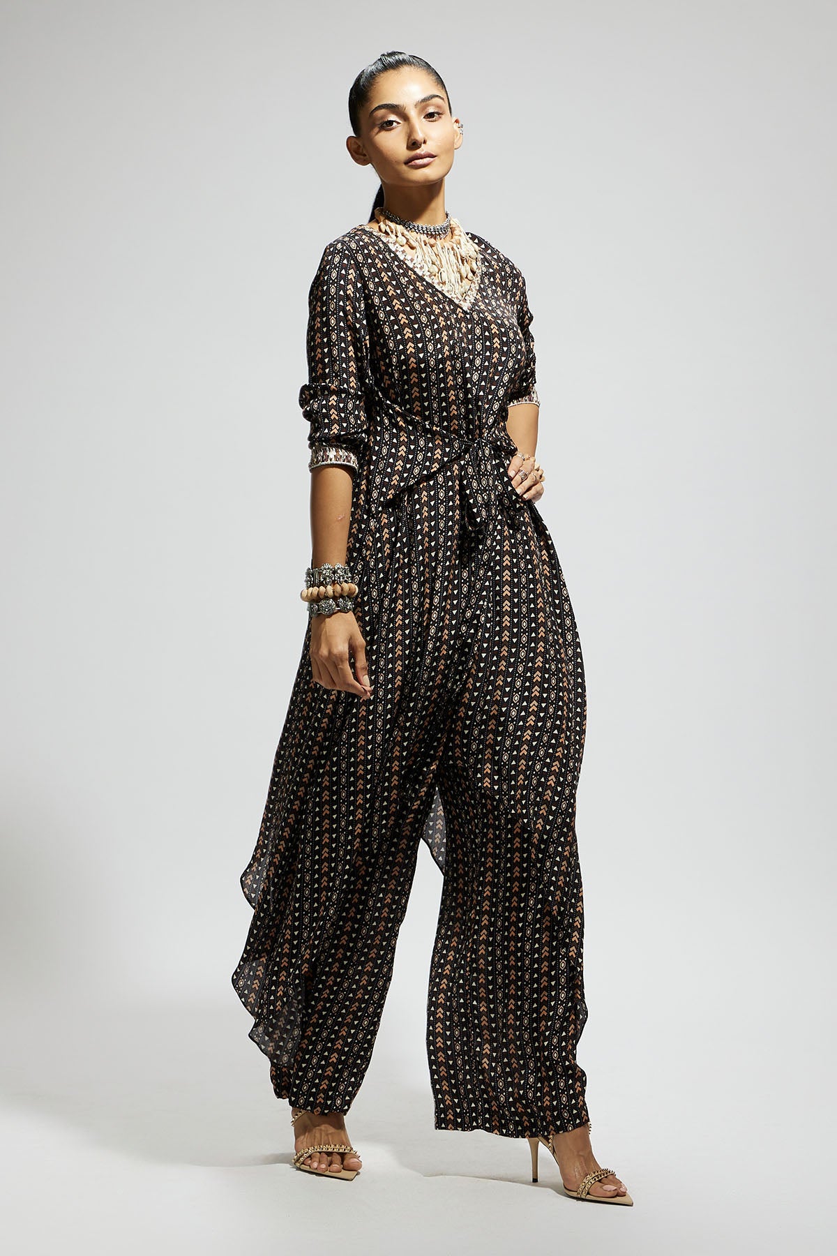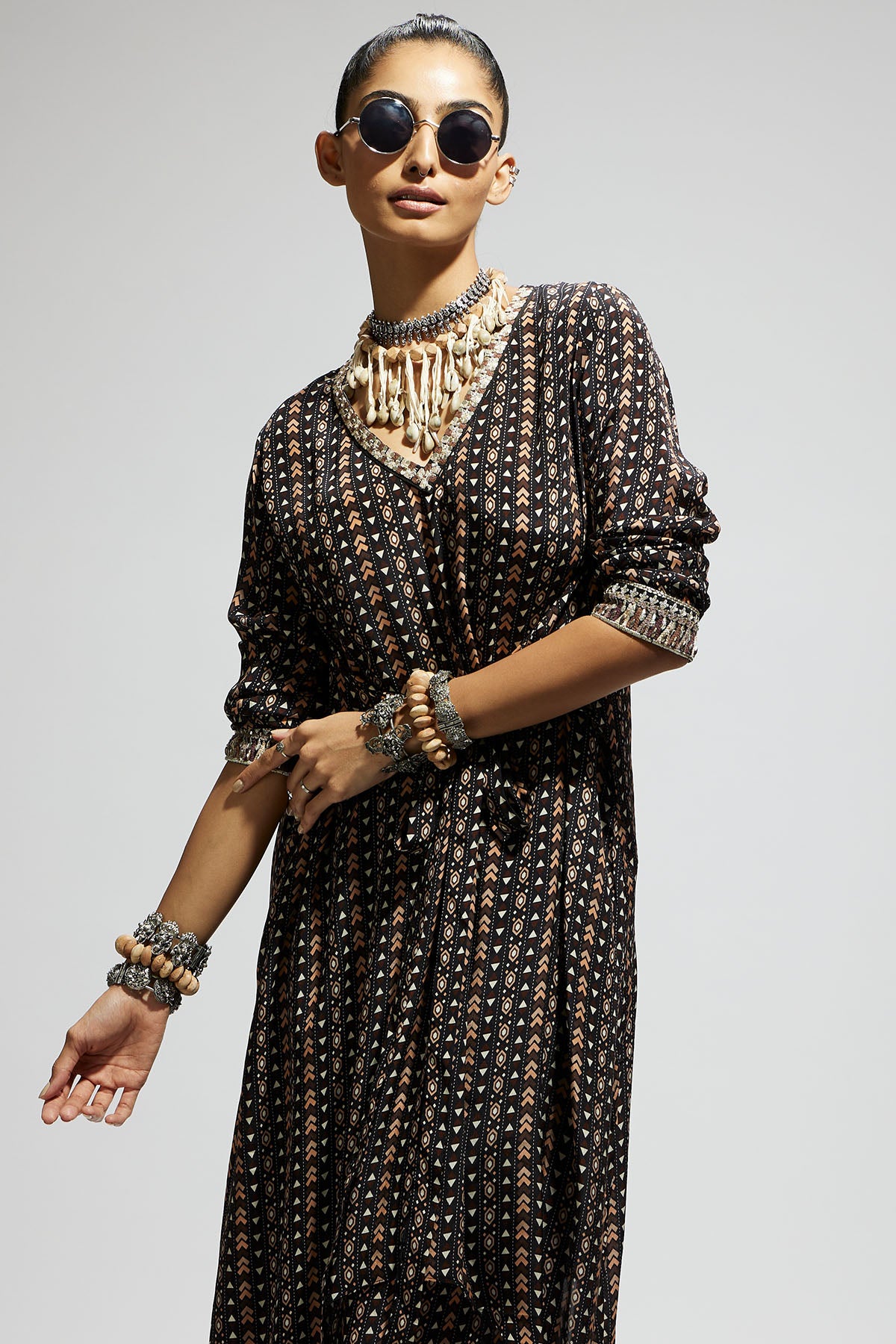 Black Boho Print Front Tie up Tunic