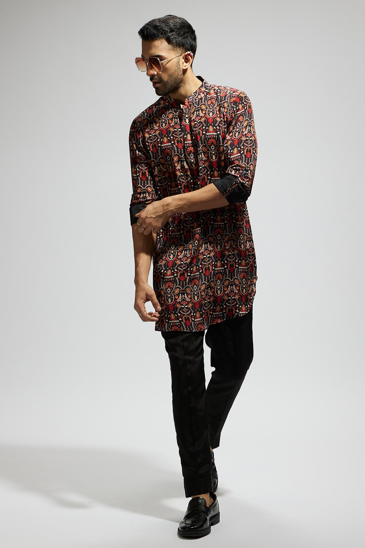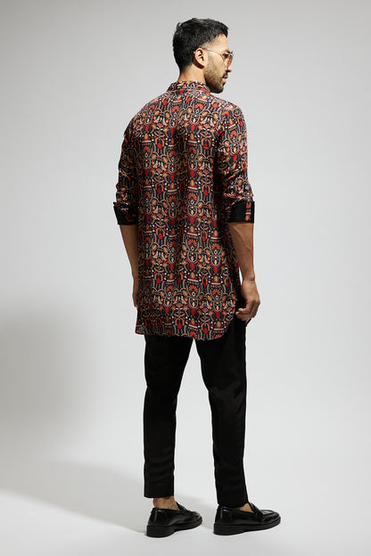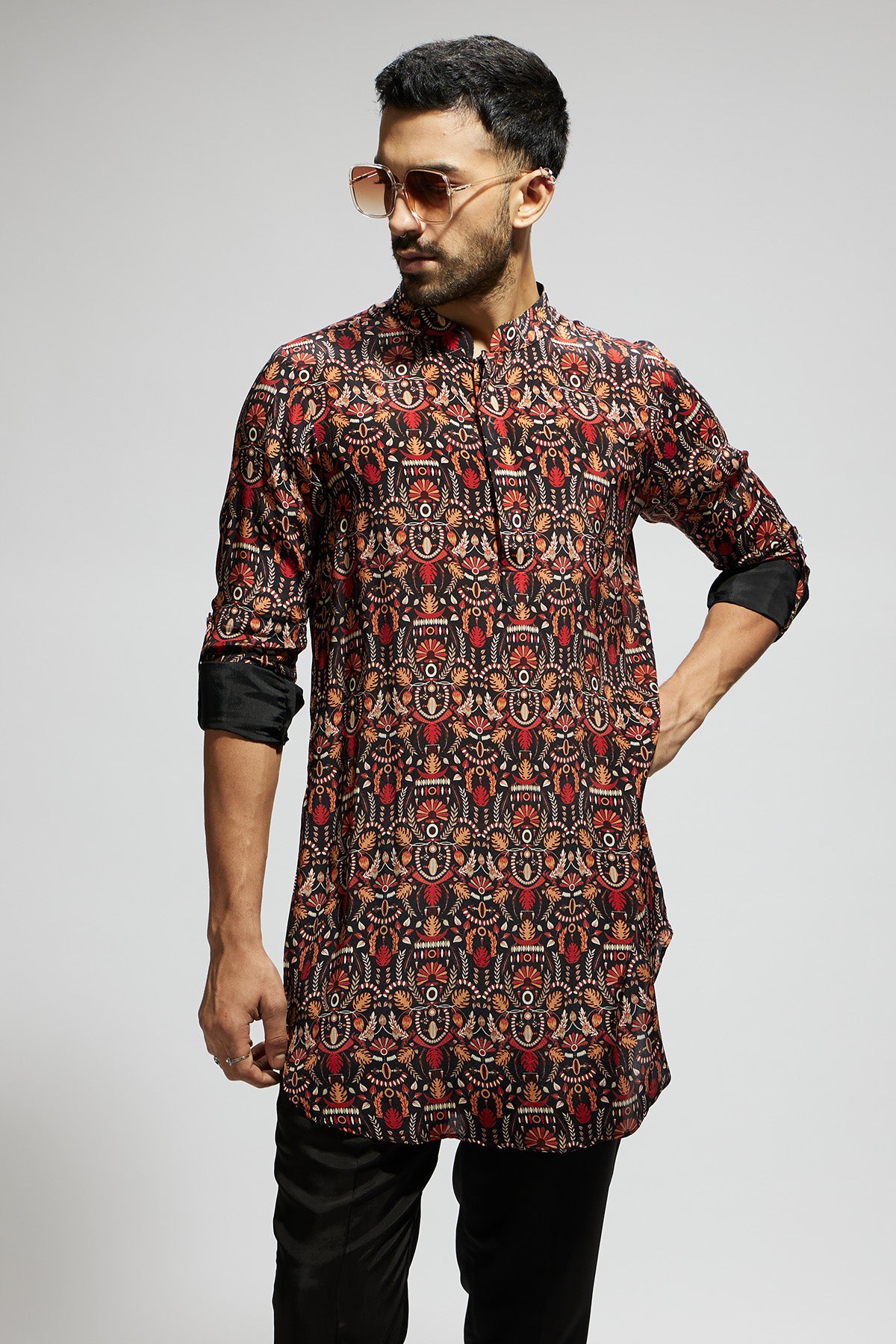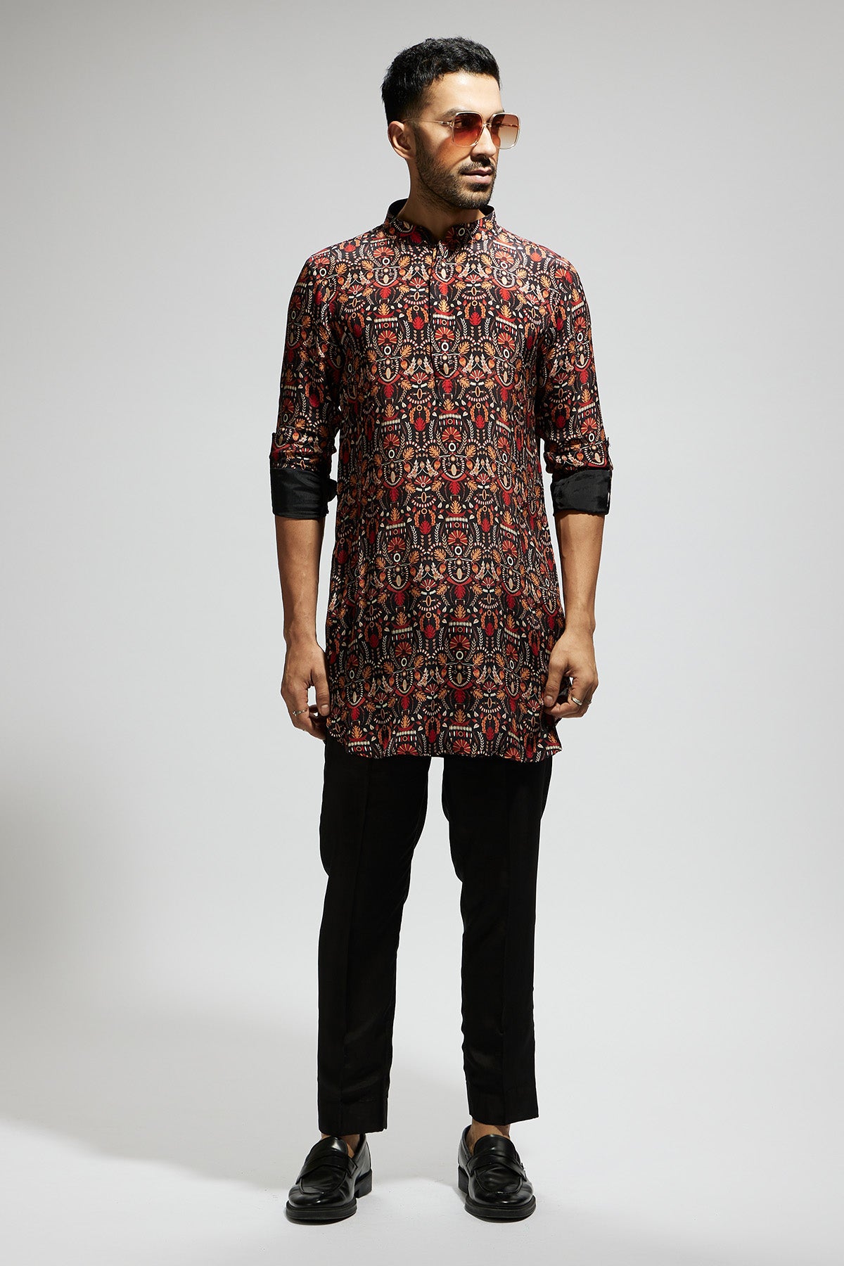Black Leaf Jaal Print Rolled up Sleeves Kurta