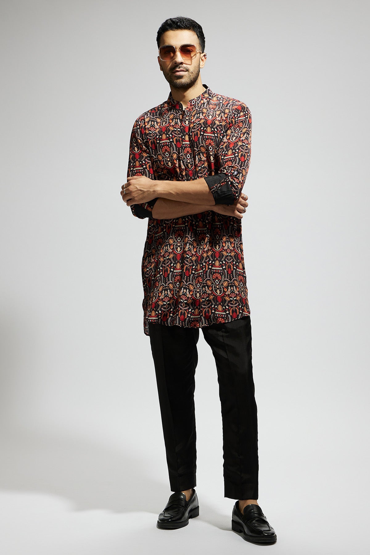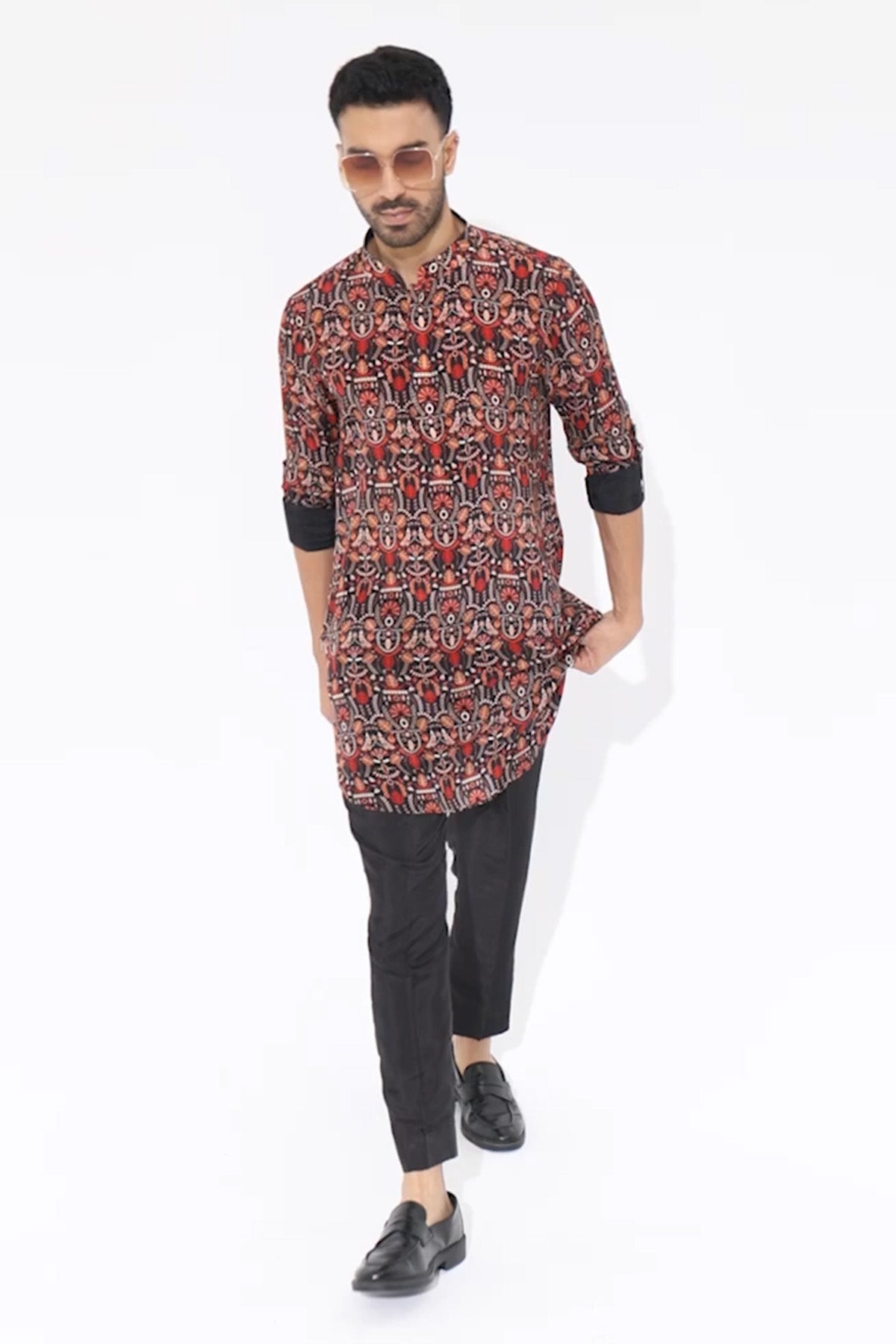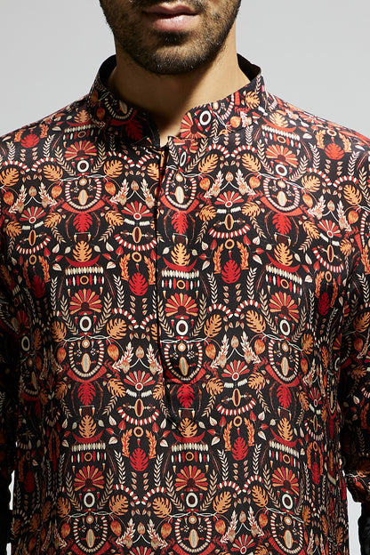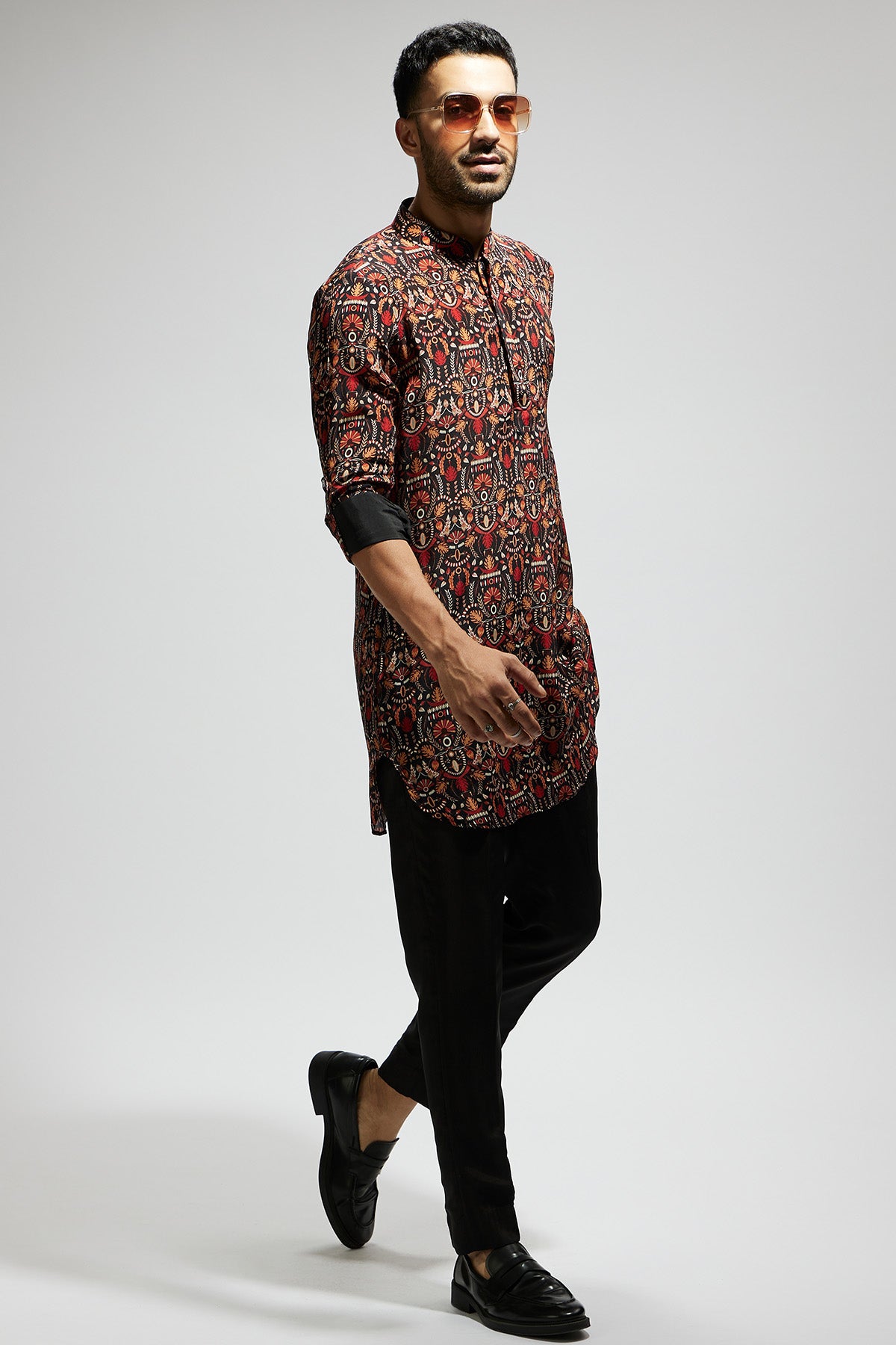 Black Leaf Jaal Print Rolled up Sleeves Kurta