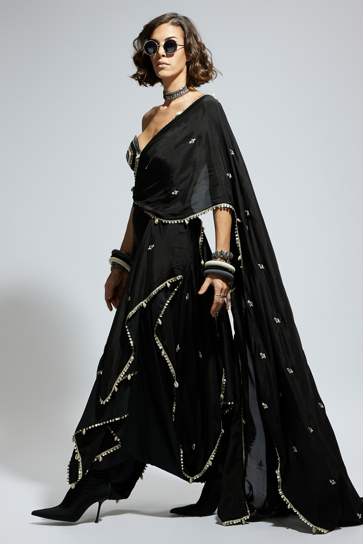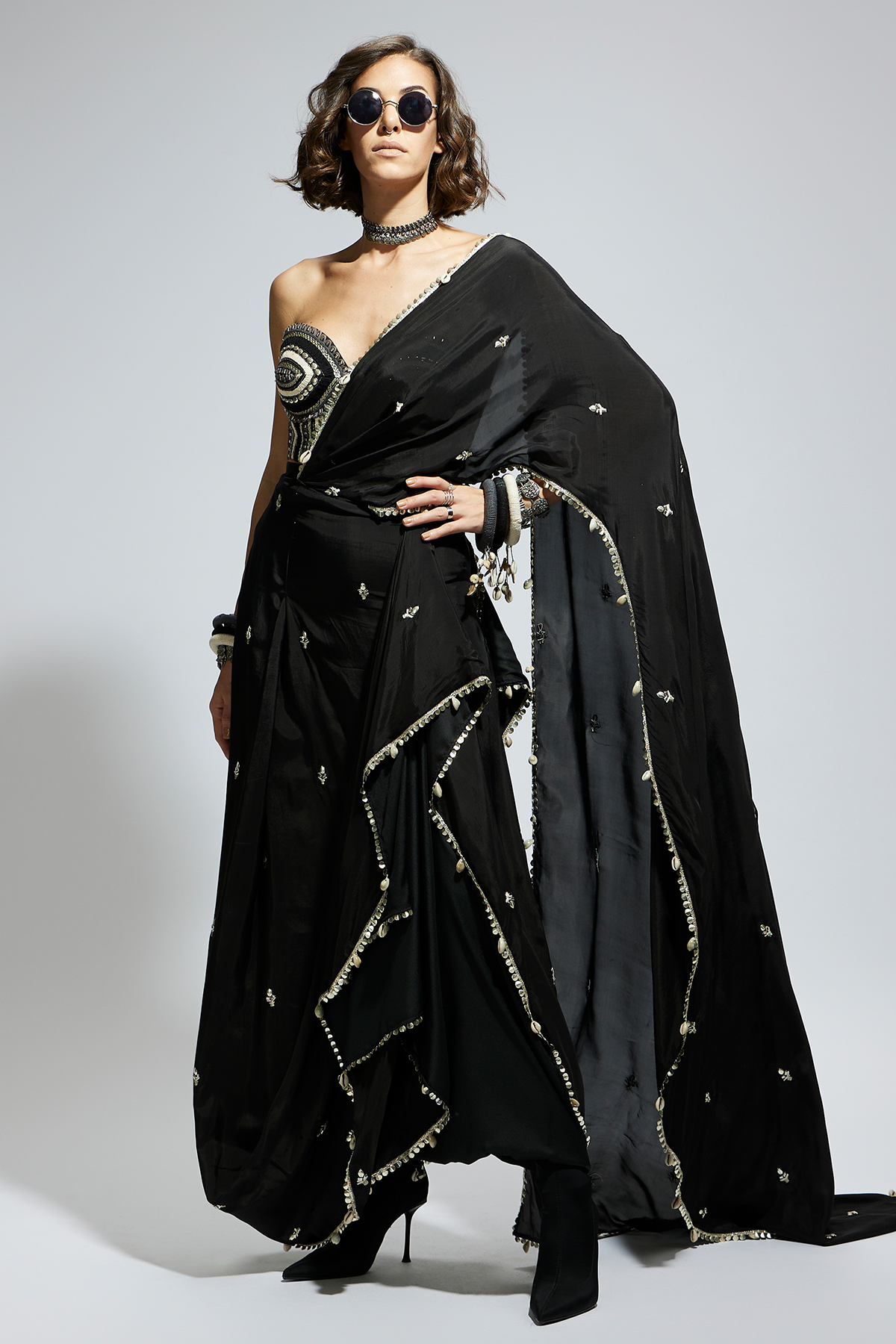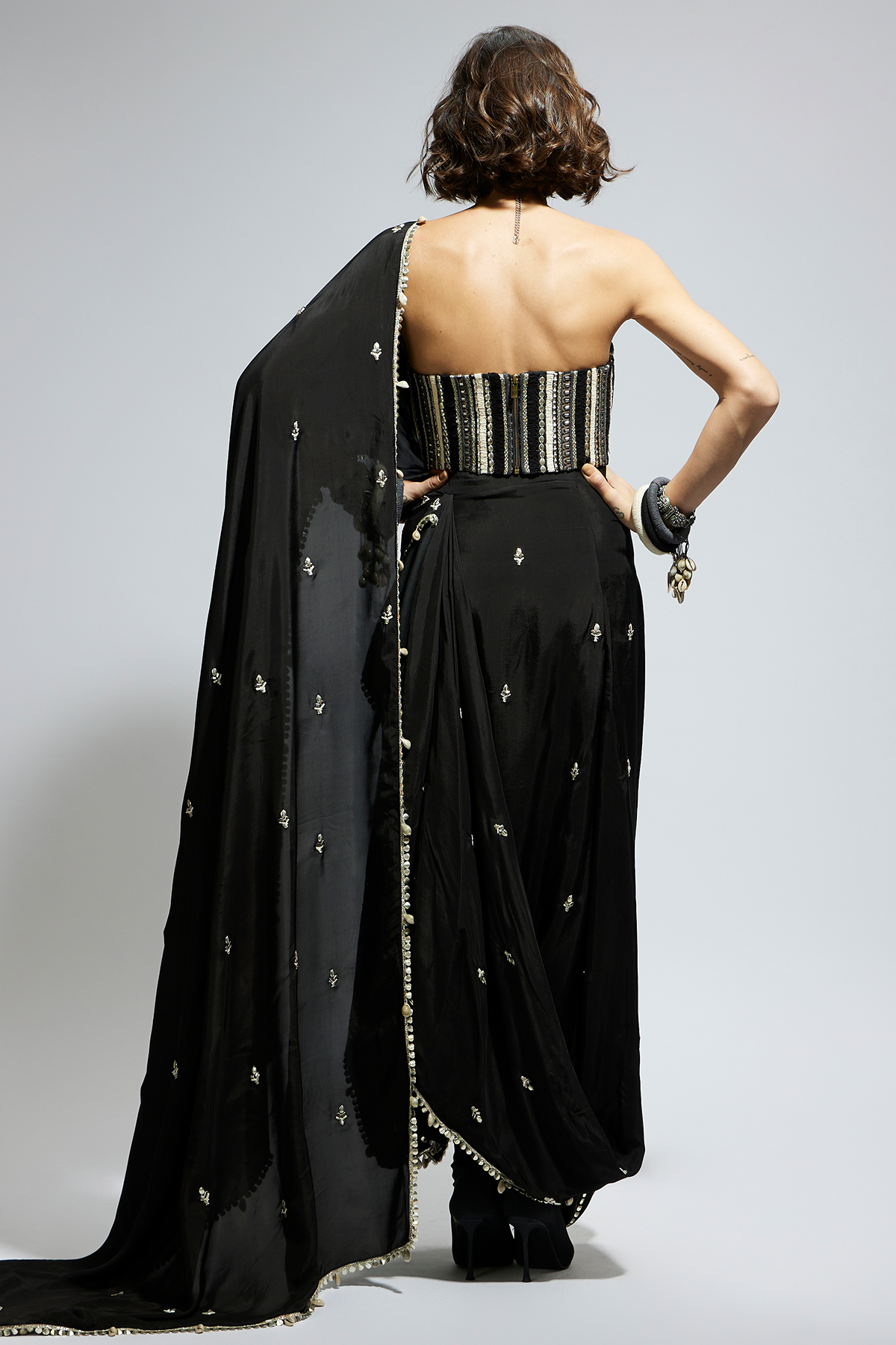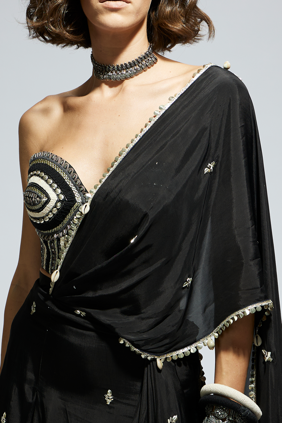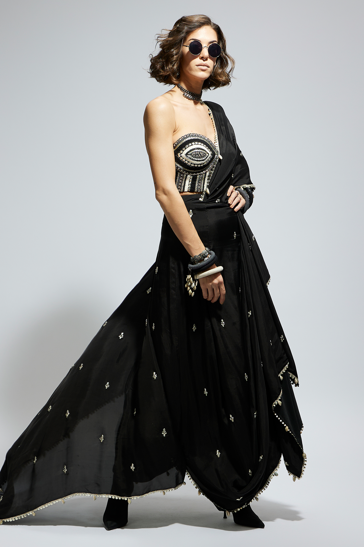 Black Threadwork Corset Paired with Embellished Saree Draped Skirt