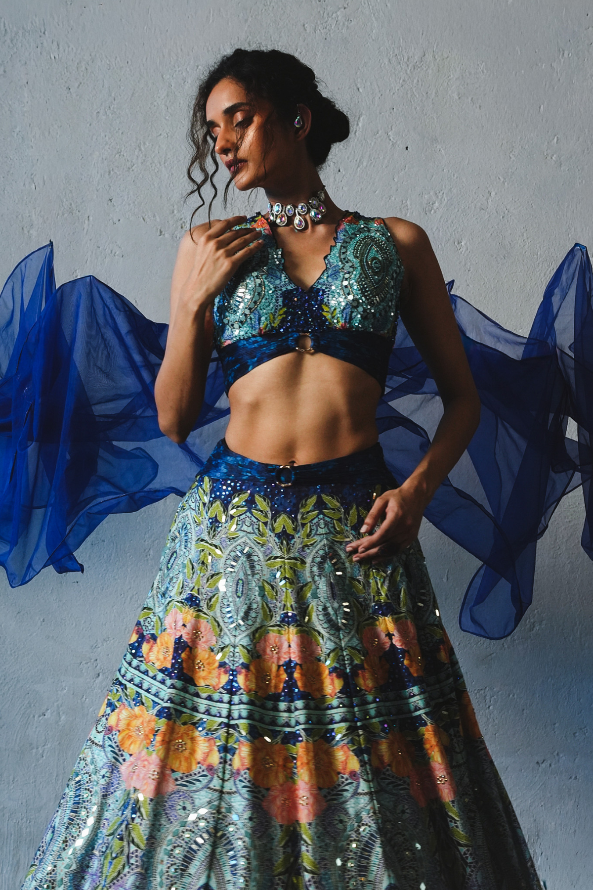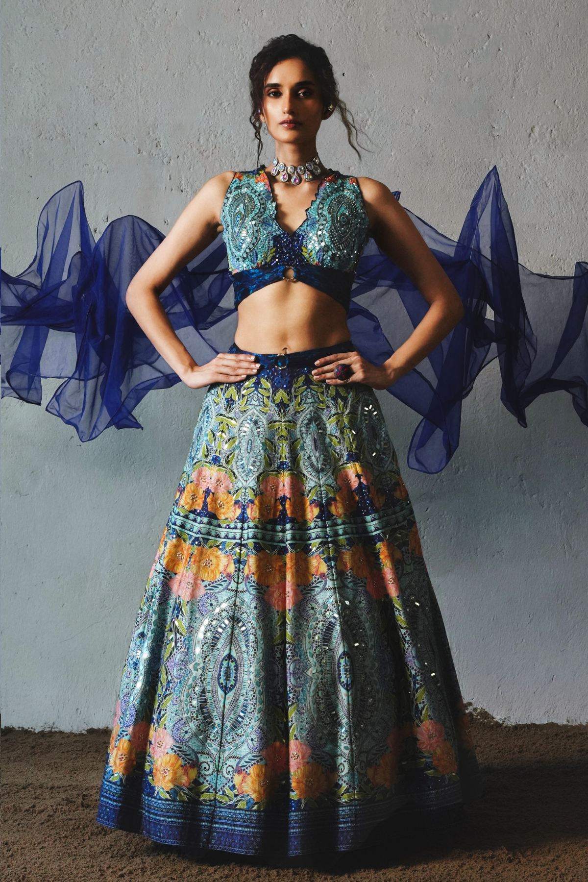 Featuring a bottle green lehenga in chiffon base with hand embellishment. It is paired with a tussar choli and an organza dupatta. Accentuate it with dainty silver earrings and strappy heels for a stylish ensemble, ideal for mehendi functions or daytime celebrations.