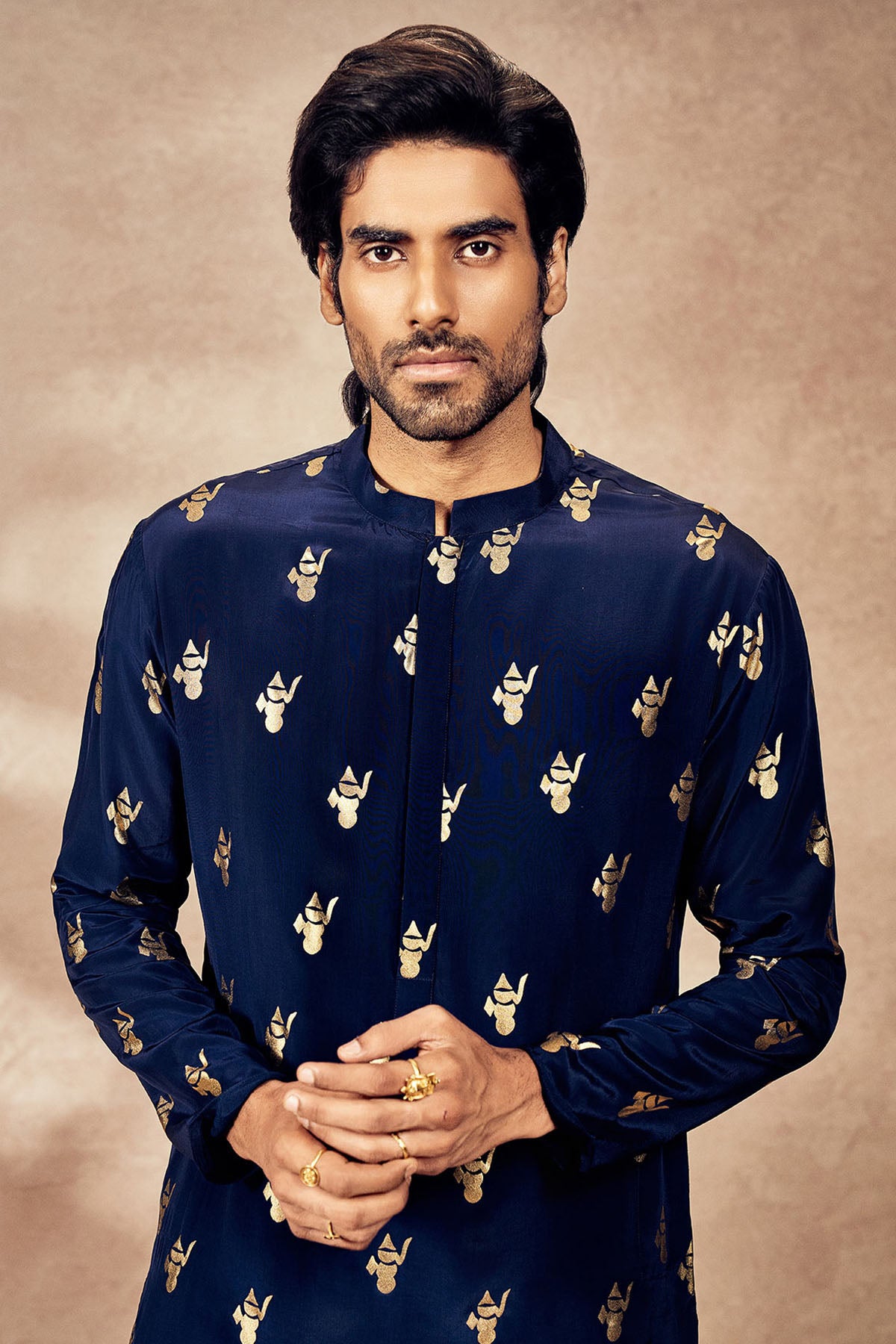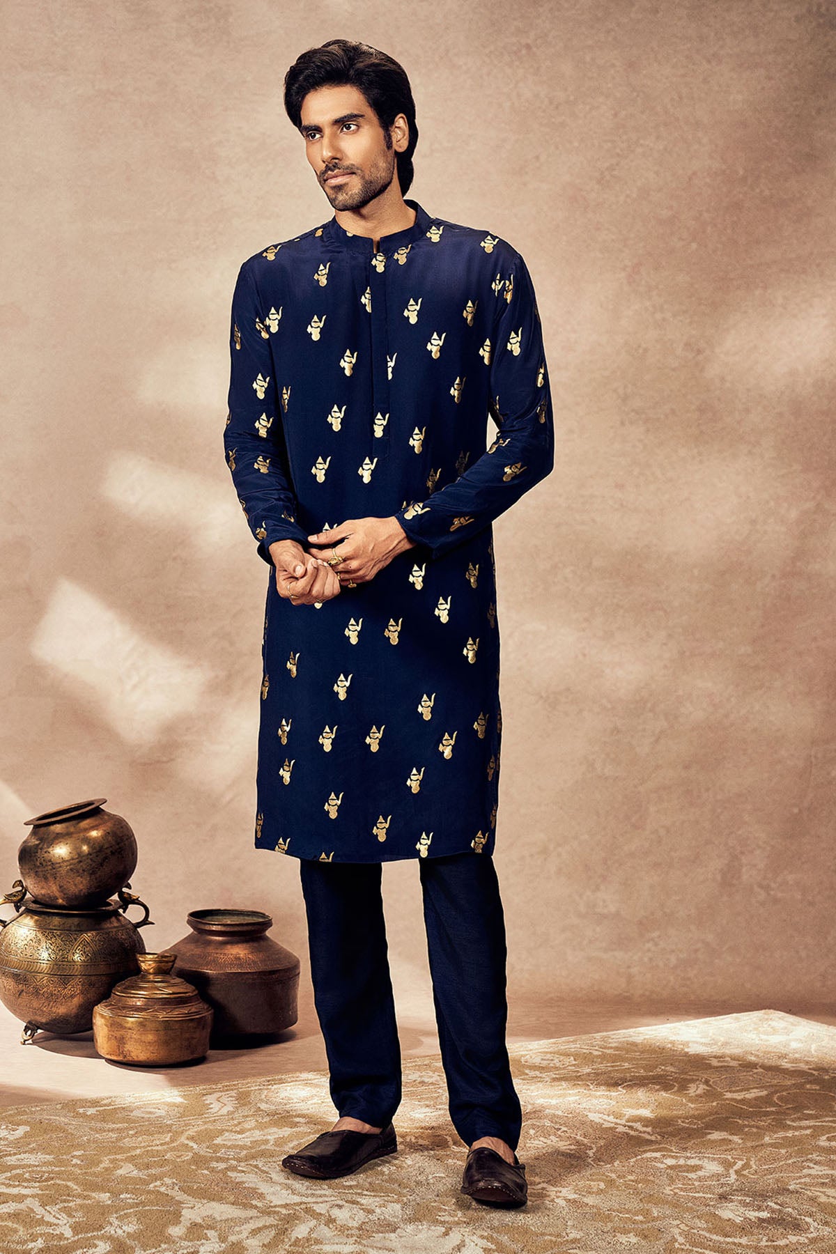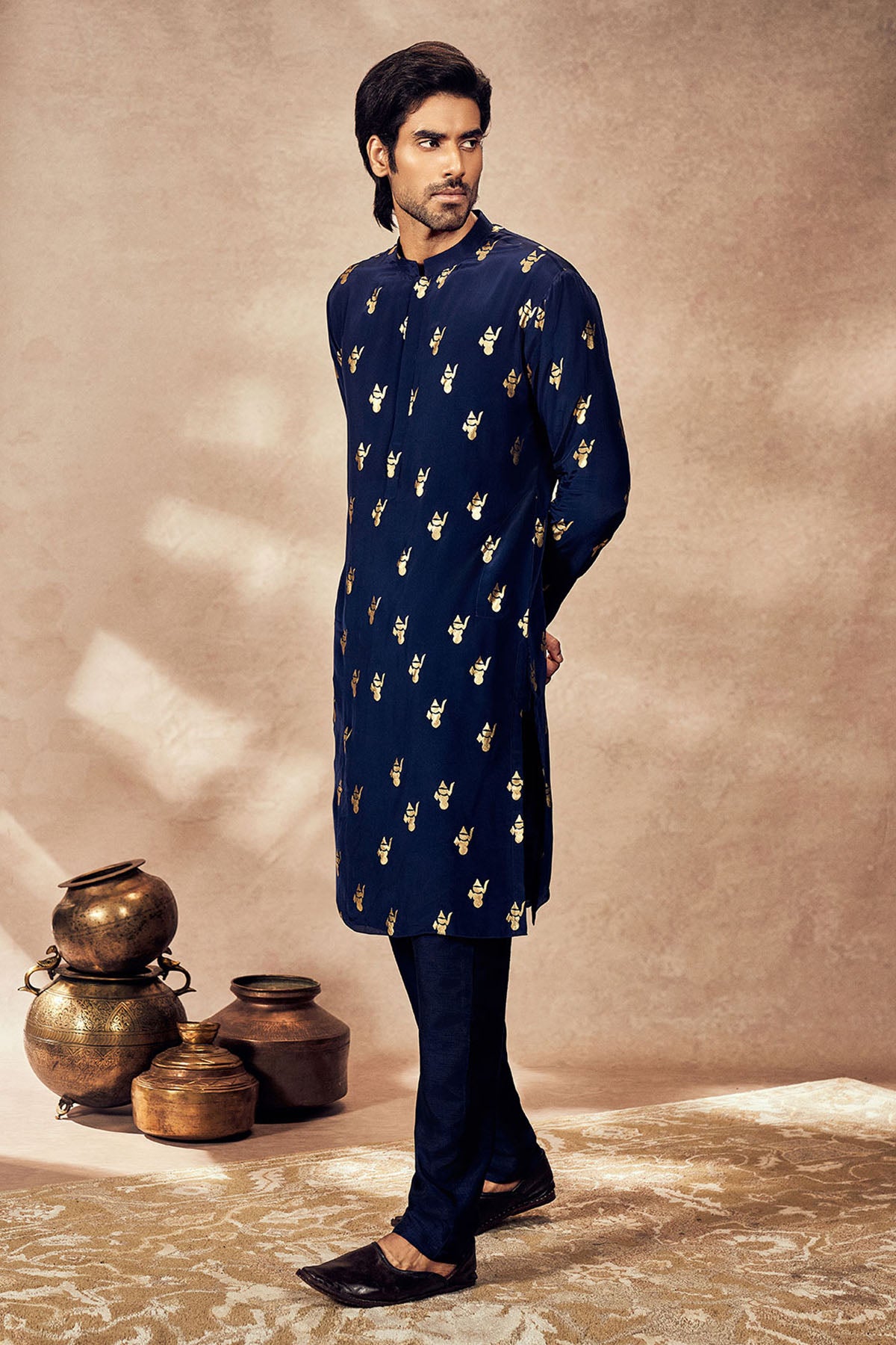 Kurta- All over foil printed kurta | Full sleeves | Mandarin collar | Pocket detail | Concealed placket Pant- Straight pants with pocket
