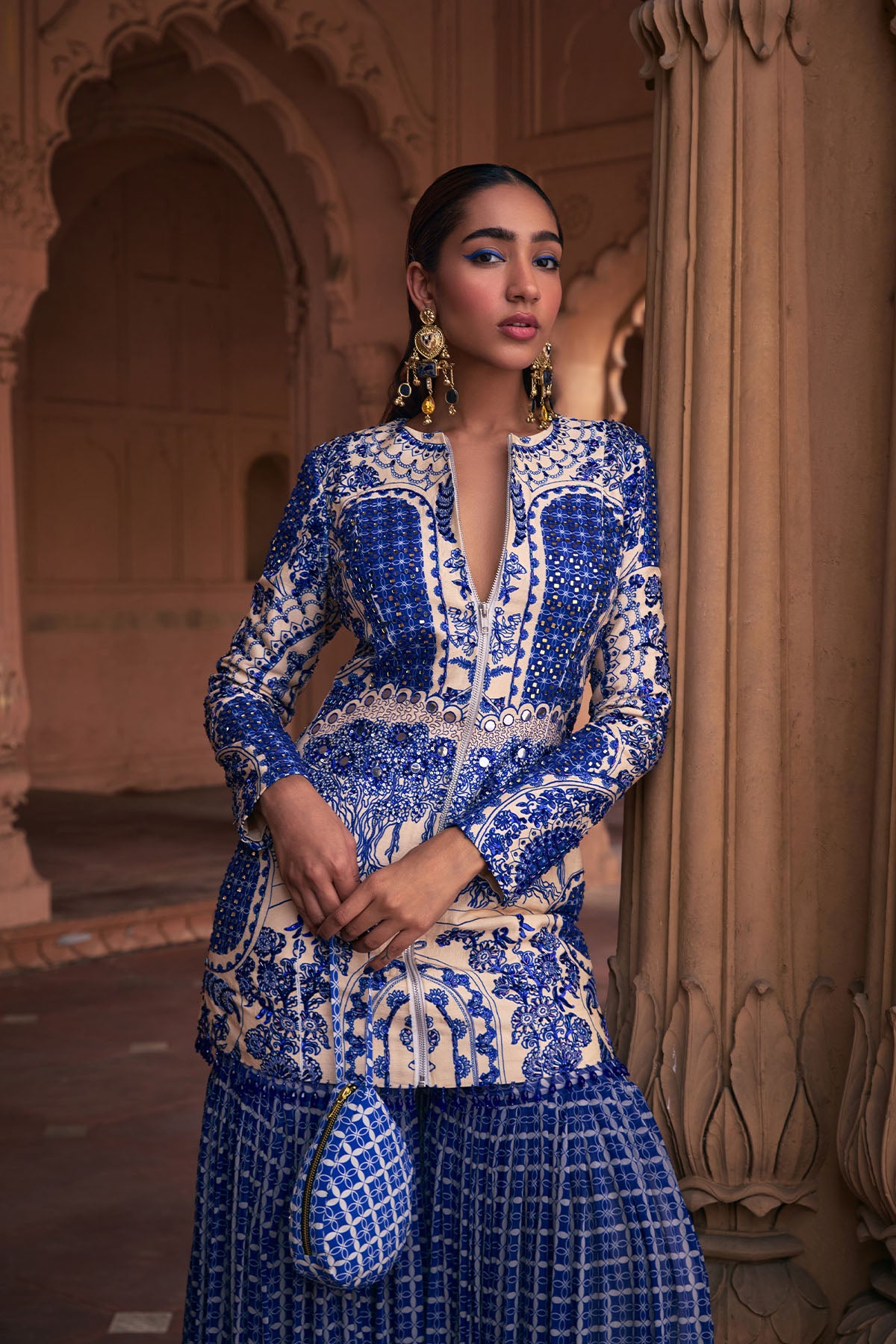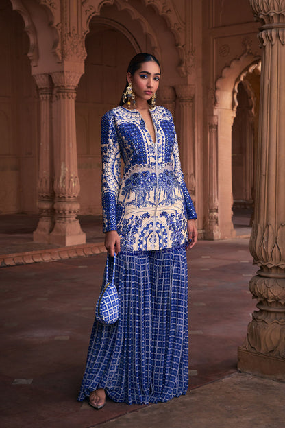 BLUE THIKRI PRINT & HIGHLIGHTED JACKET SET