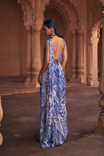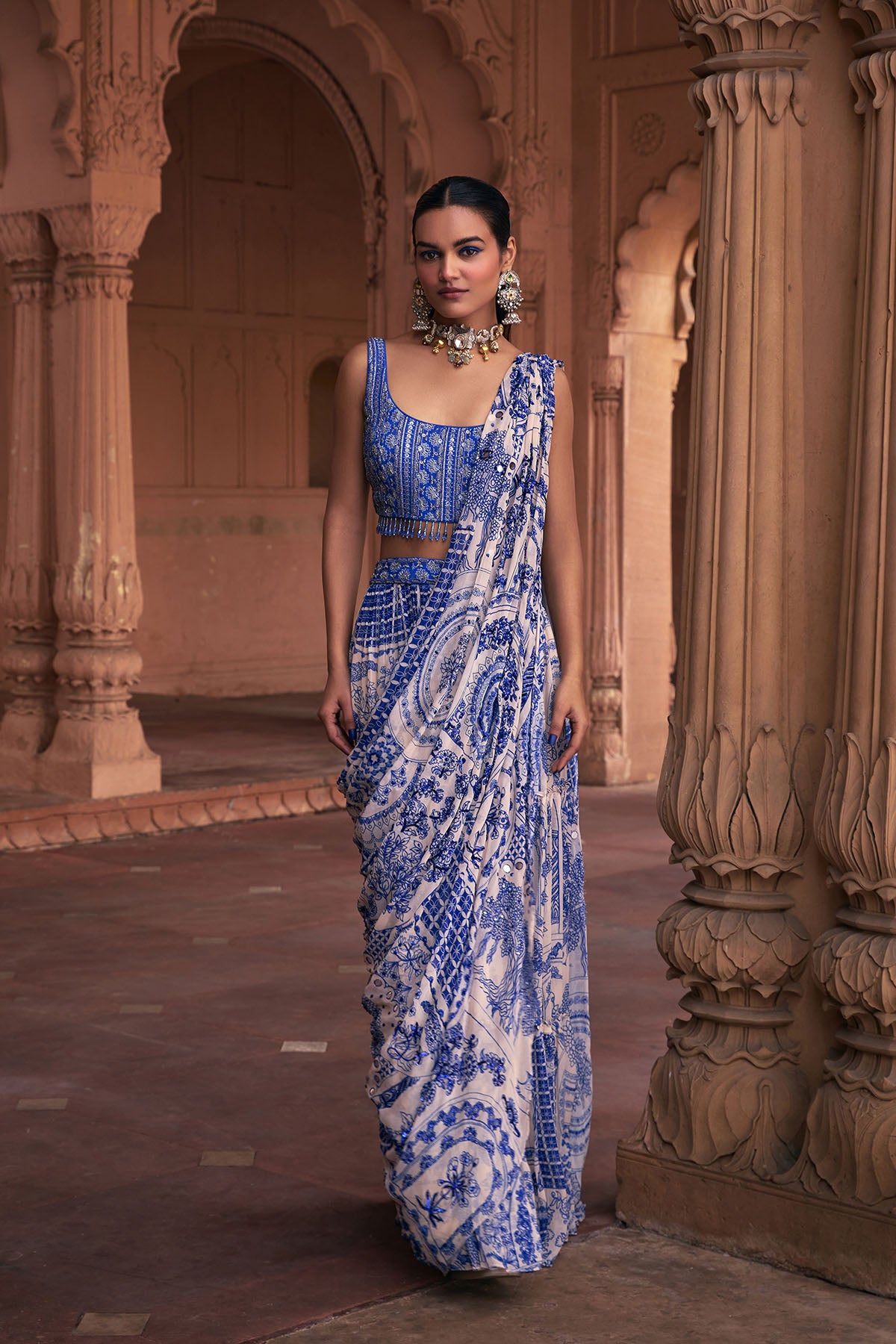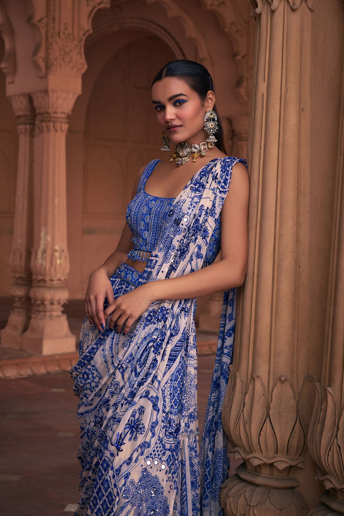 Blue stripe print & highlighted blouse with blue thikri print & highlighted drape sharara pants saree and belt