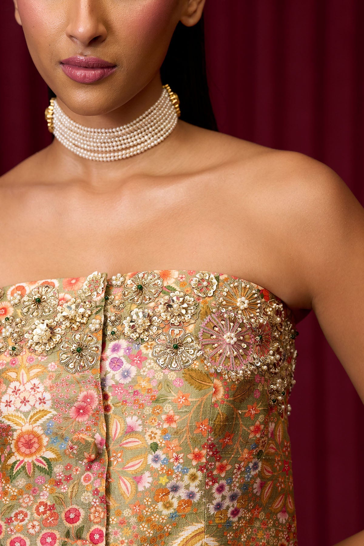 Olive green raw silk tube jacket paired with matching pants for a sleek look.