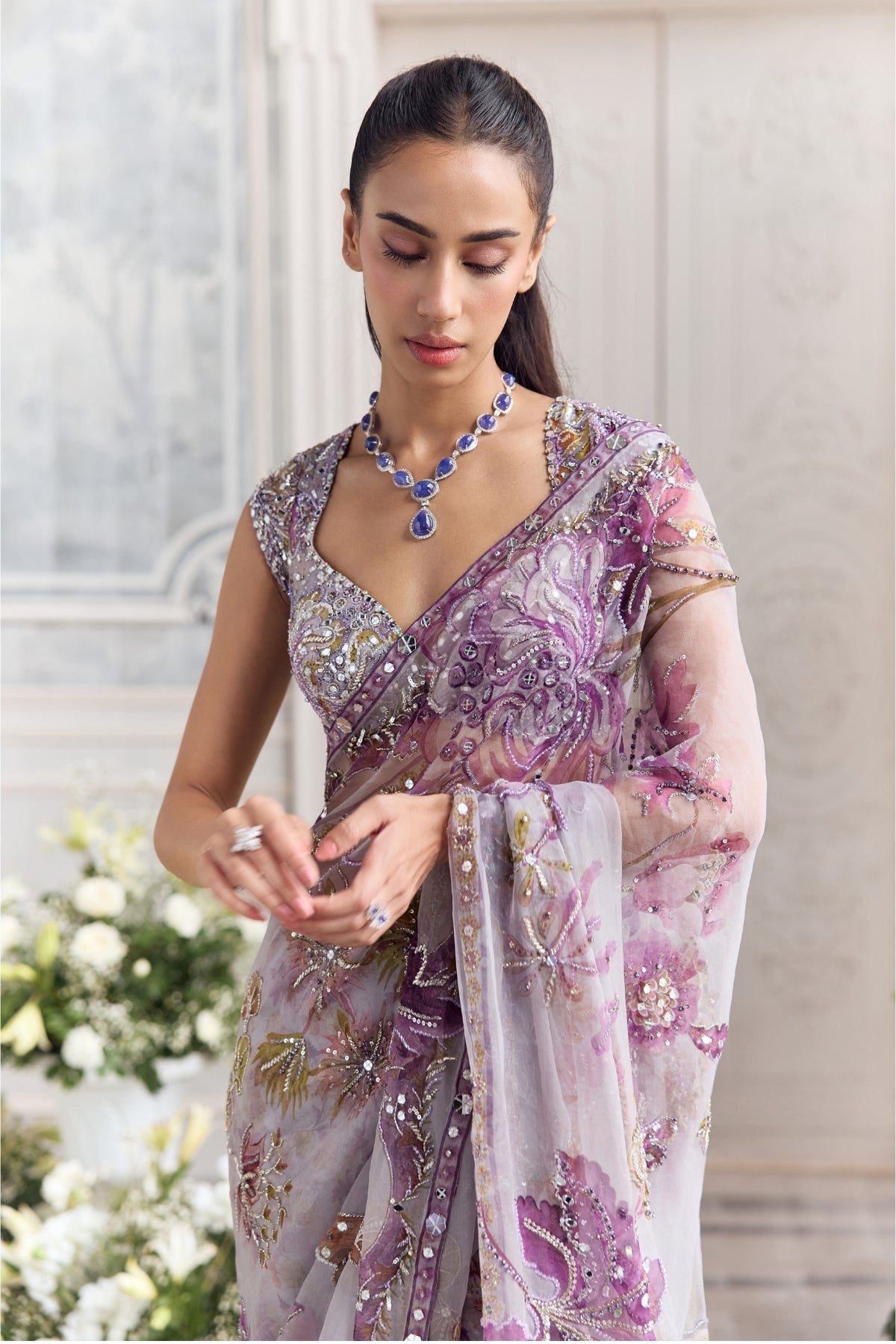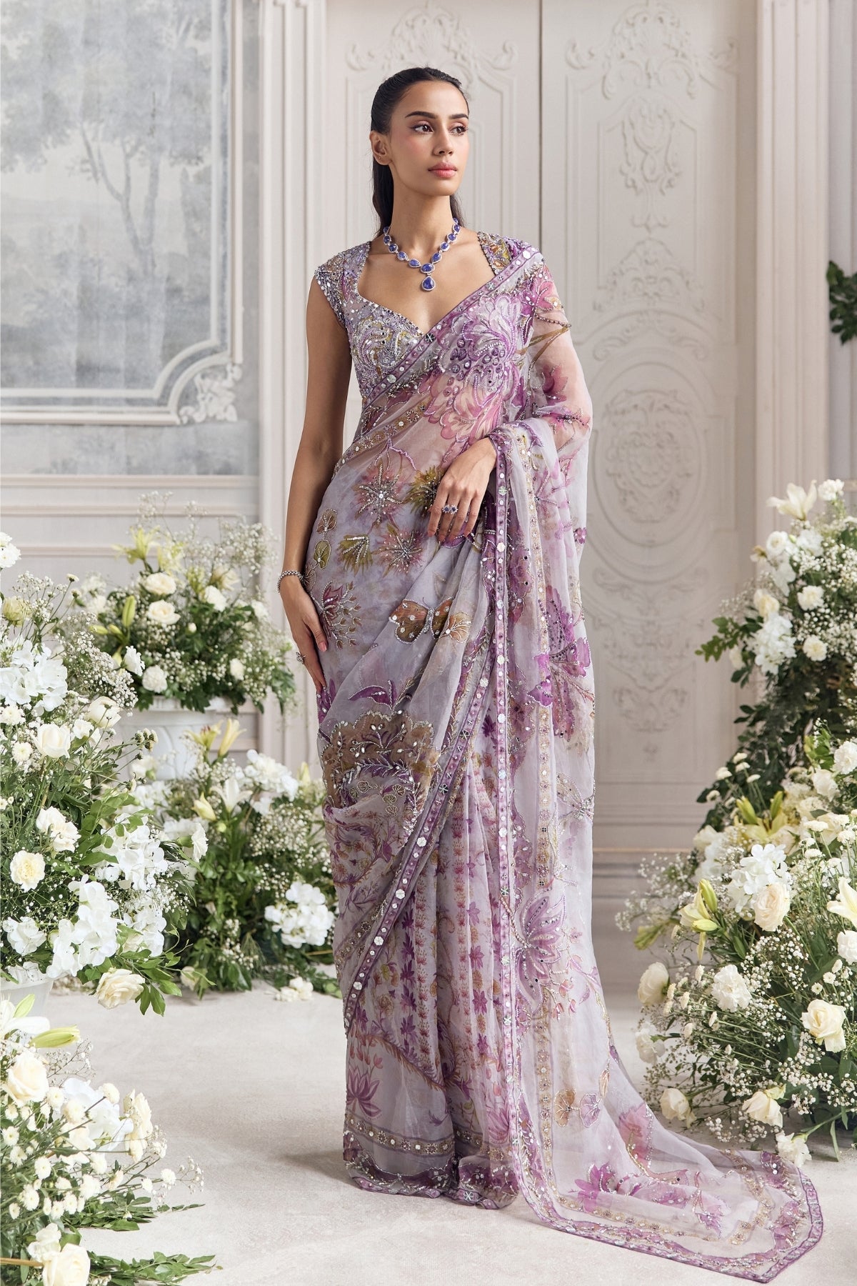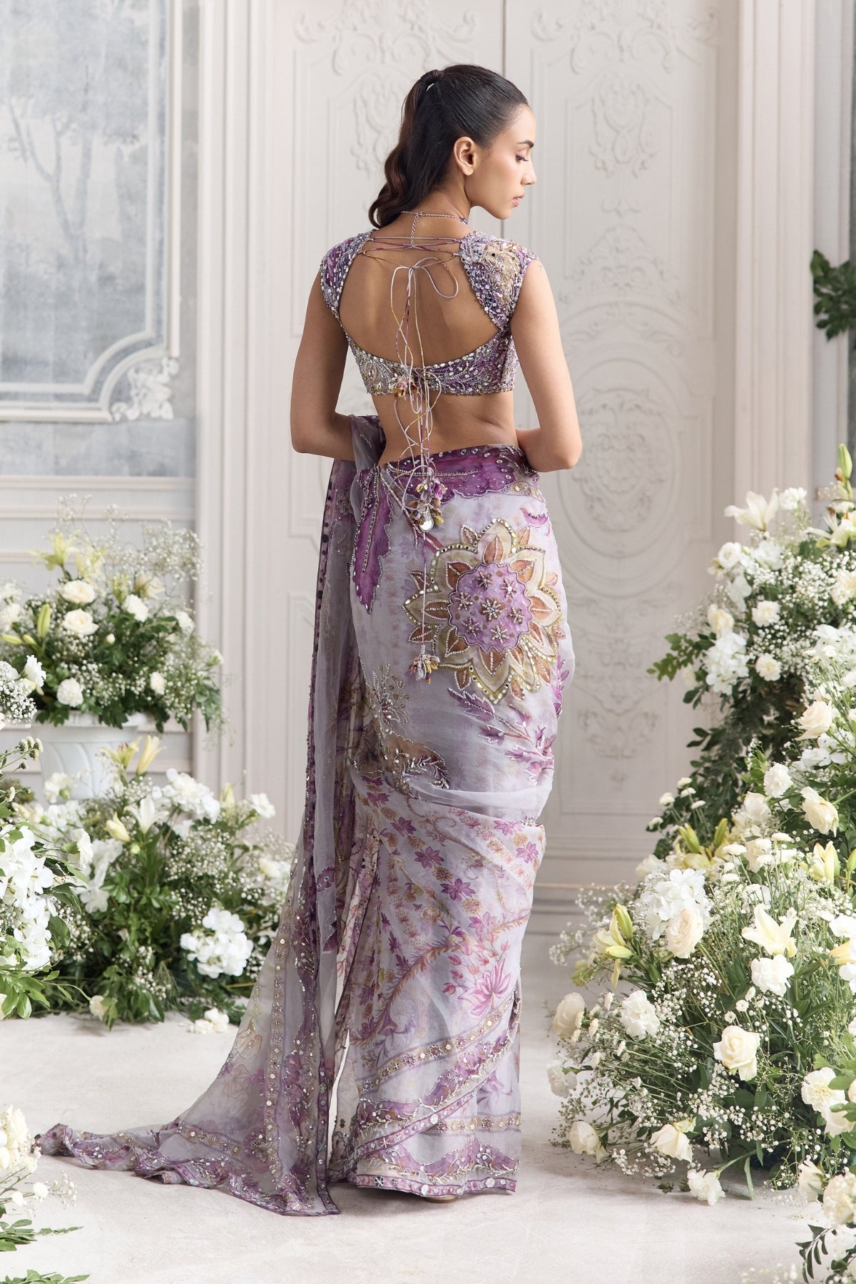 Cap Sleeves Embroidered Blouse Paired With Embroidered Predraped Saree