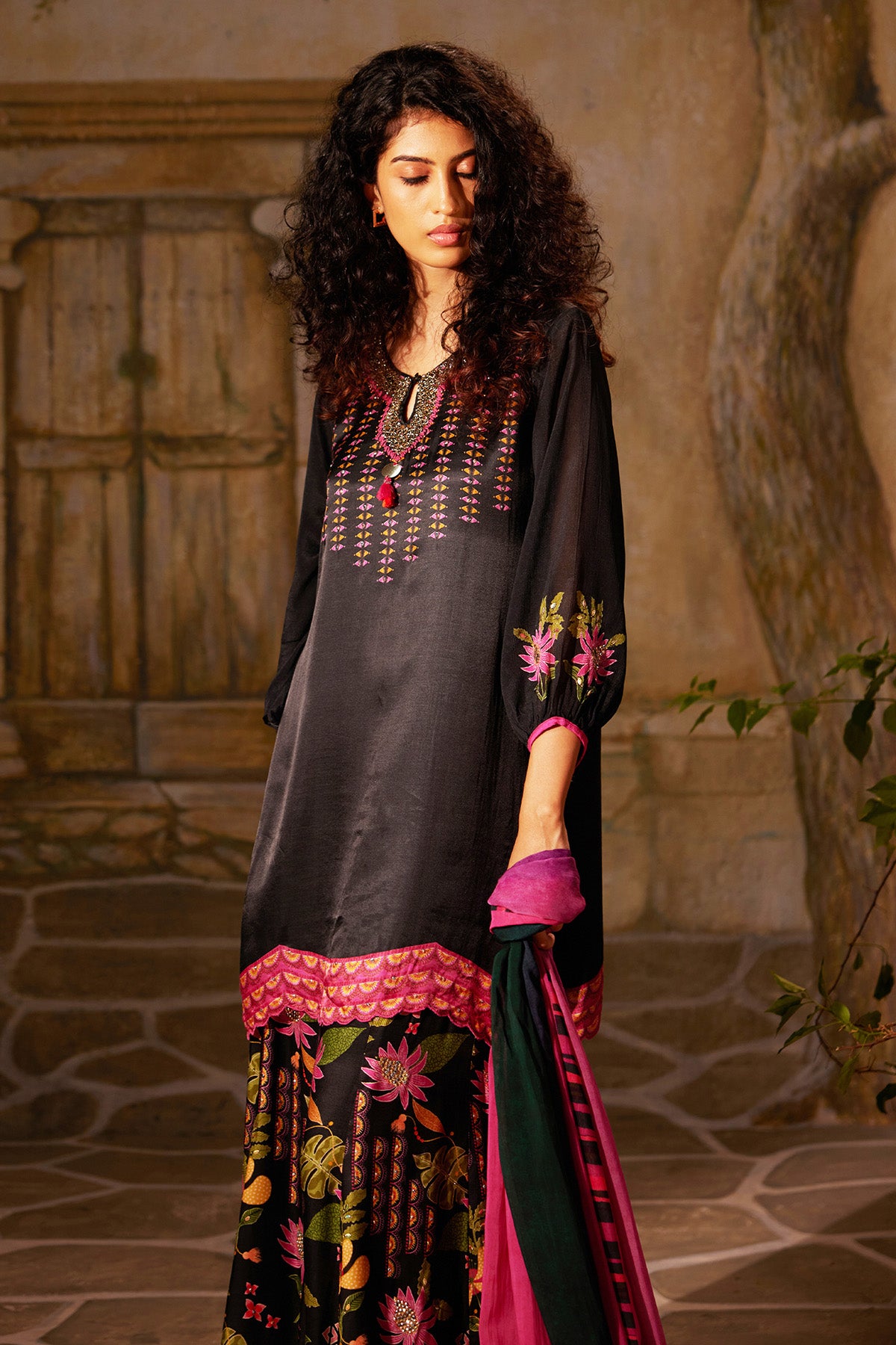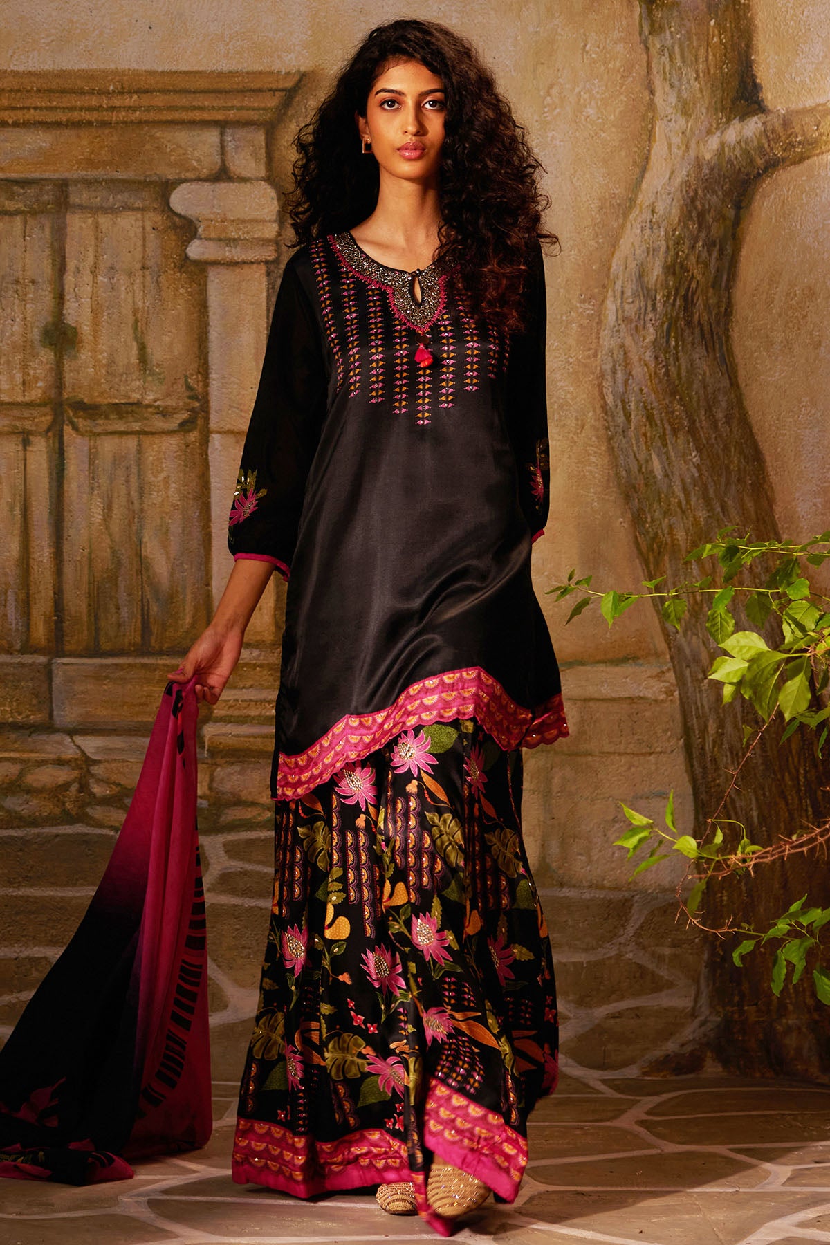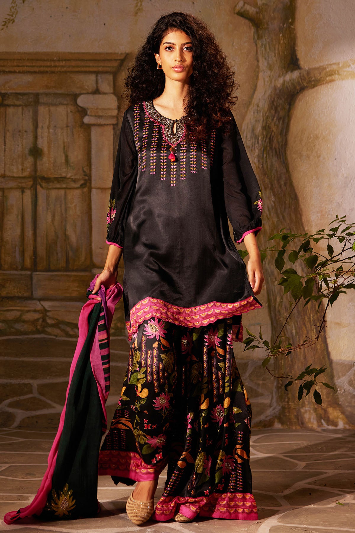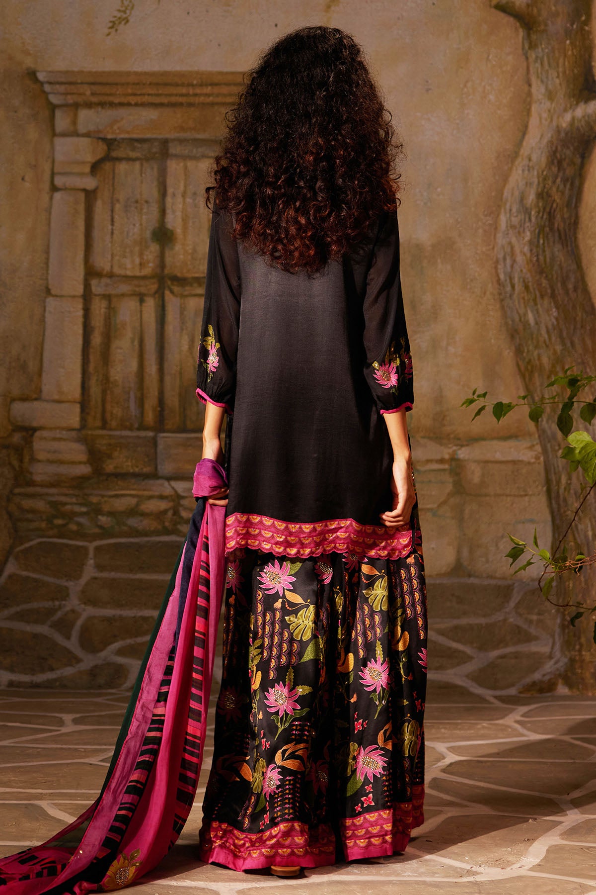 Charcoal Bamberg Satin Printed Sharara Set with Embellished Neckline and Organza Dupatta.