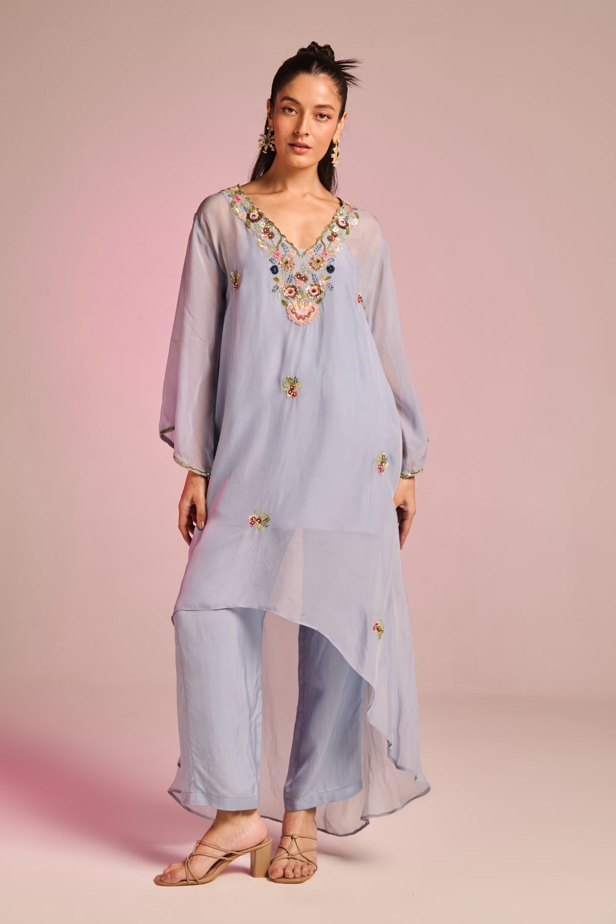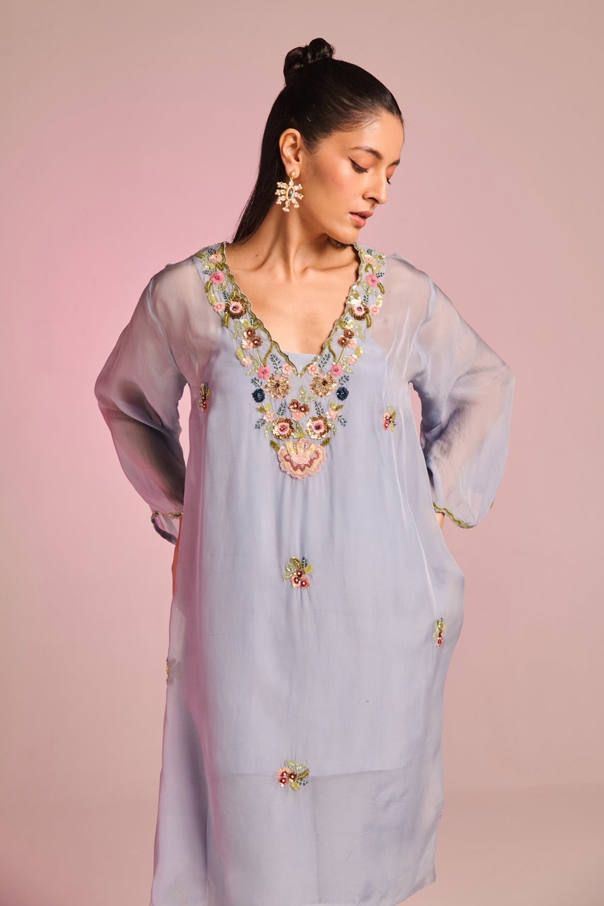 Step Into Style And Comfort This Summer. Featuring Delicate Multicolour Floral Embroidery On Neckline , Bringing Depth And Grace To The Design. The Trimmed Silhoutte Adds A Soft Touch, While The Loose Sleeves With Intricate Detailing On Cuffs, Lending A Statement Appeal. Pairedin Classic Combination With Pant , Making It A Wardrobe Essential For Any Season.