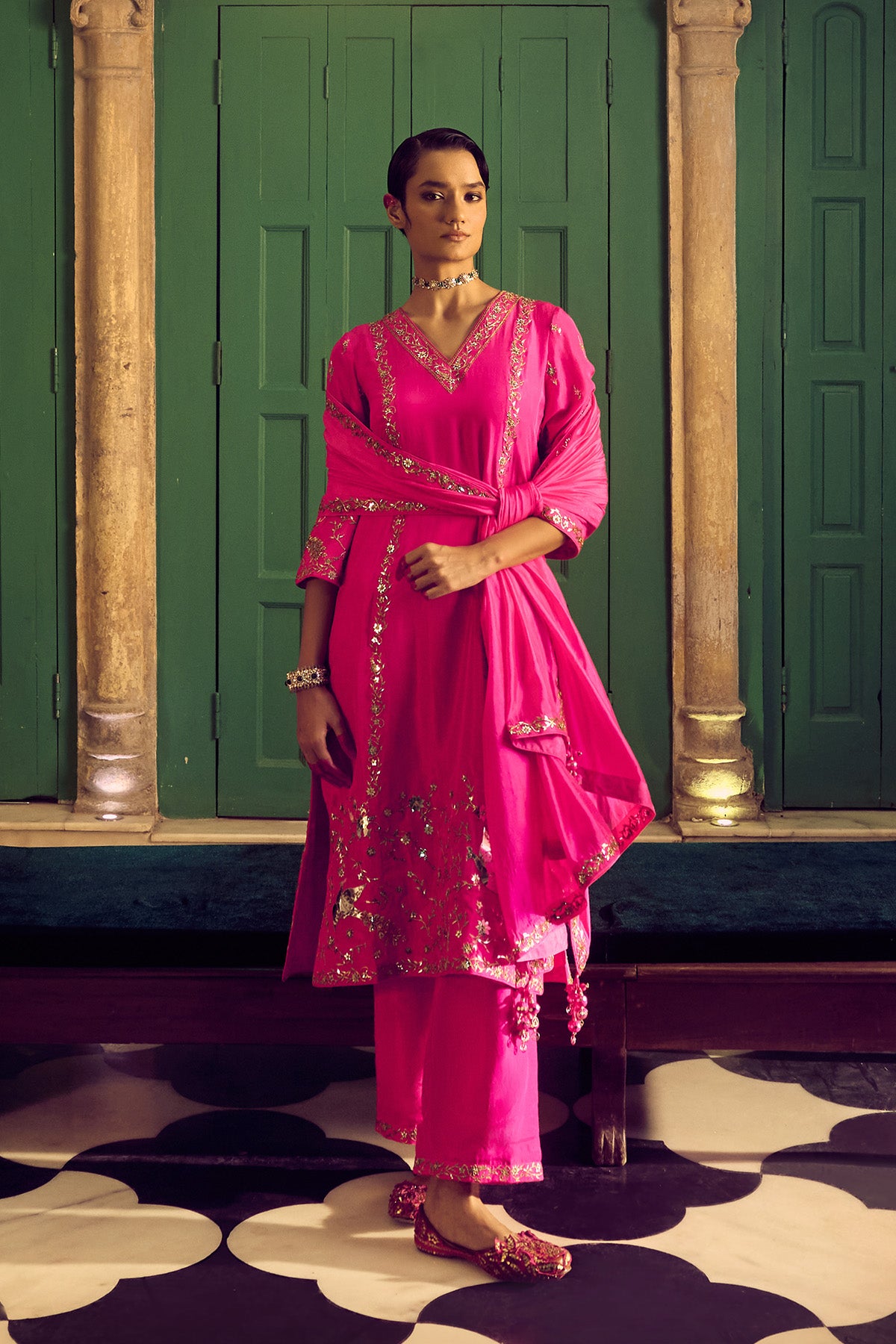 Classic Gulaabi Gulaal V-Neck Kurta Set Has Been Embroidered With Applique Patra Work Paired With Pants And Dupatta.