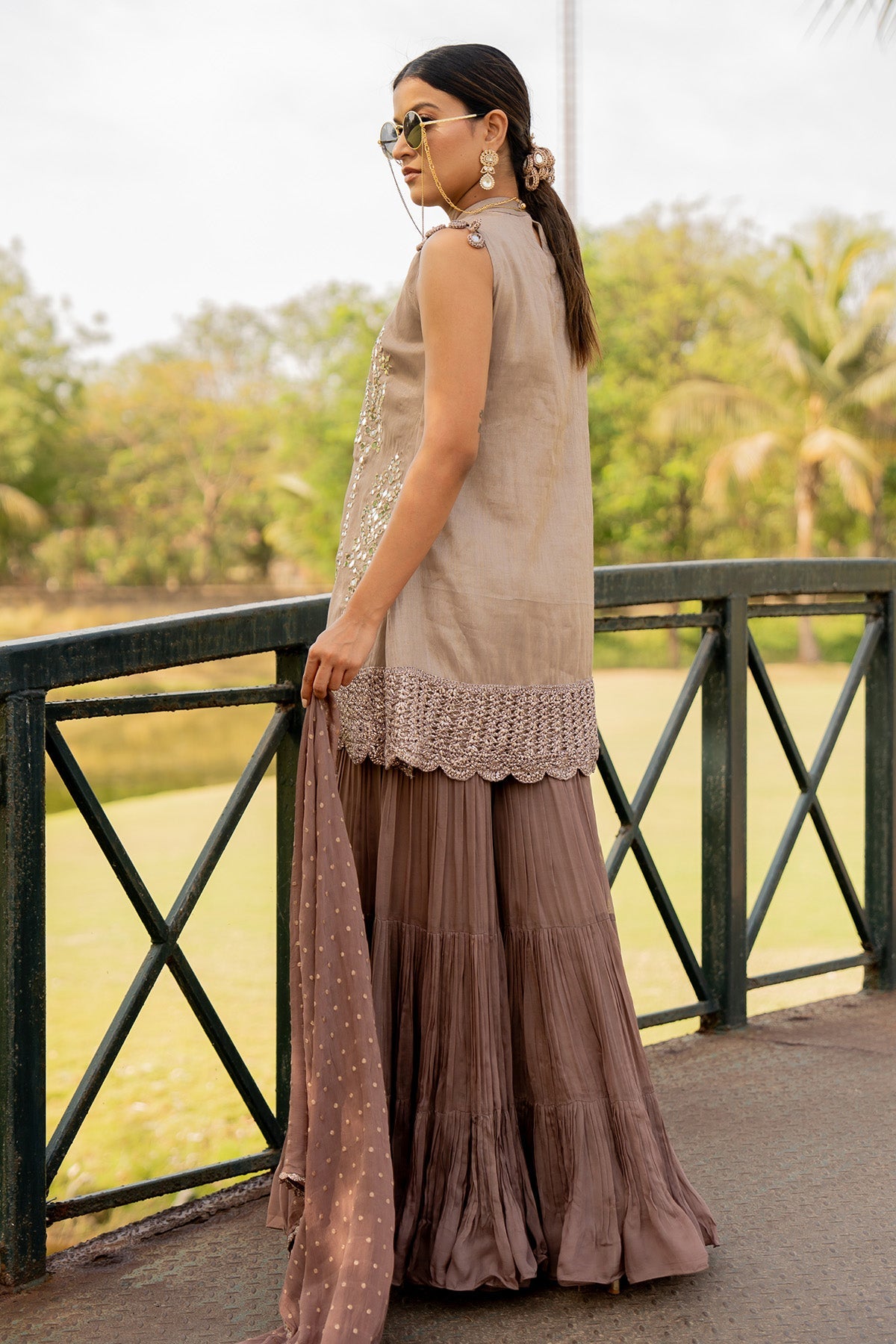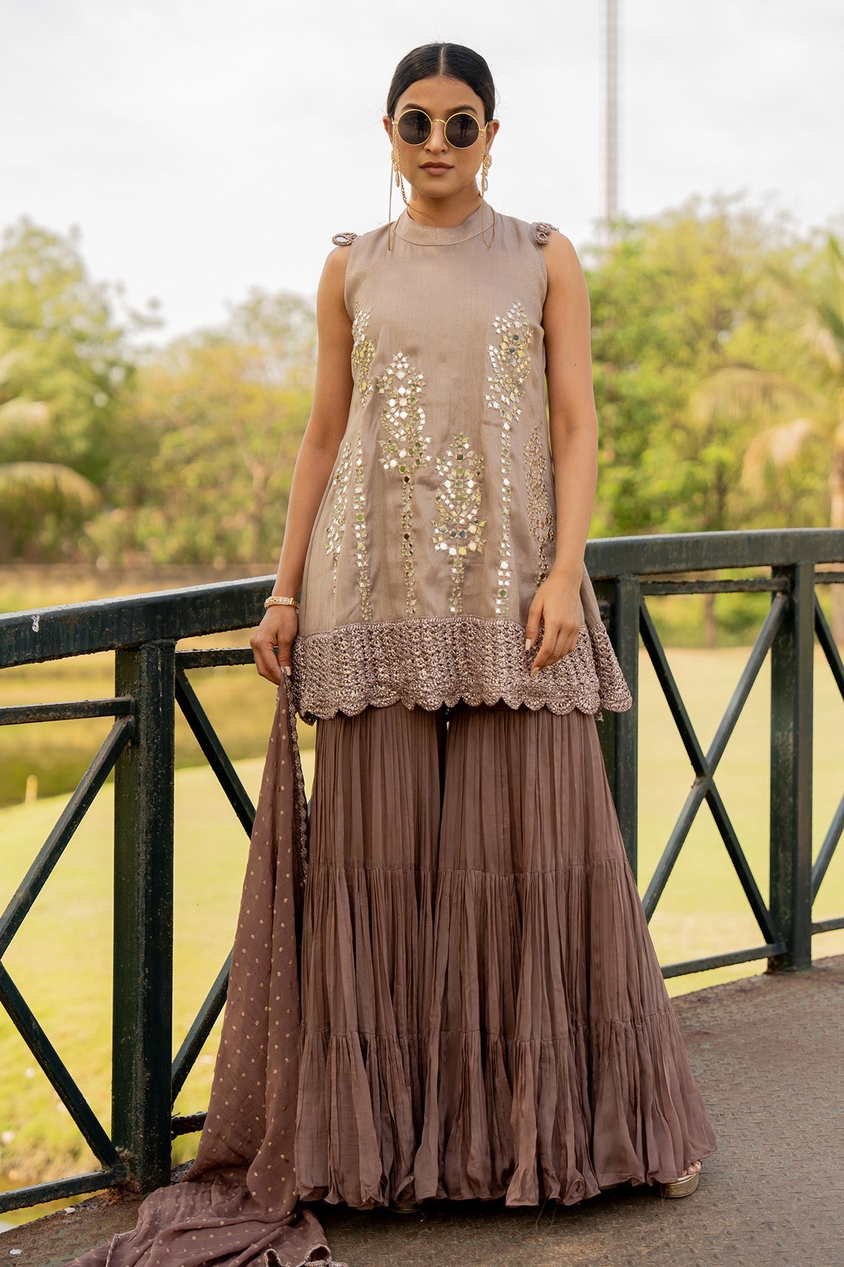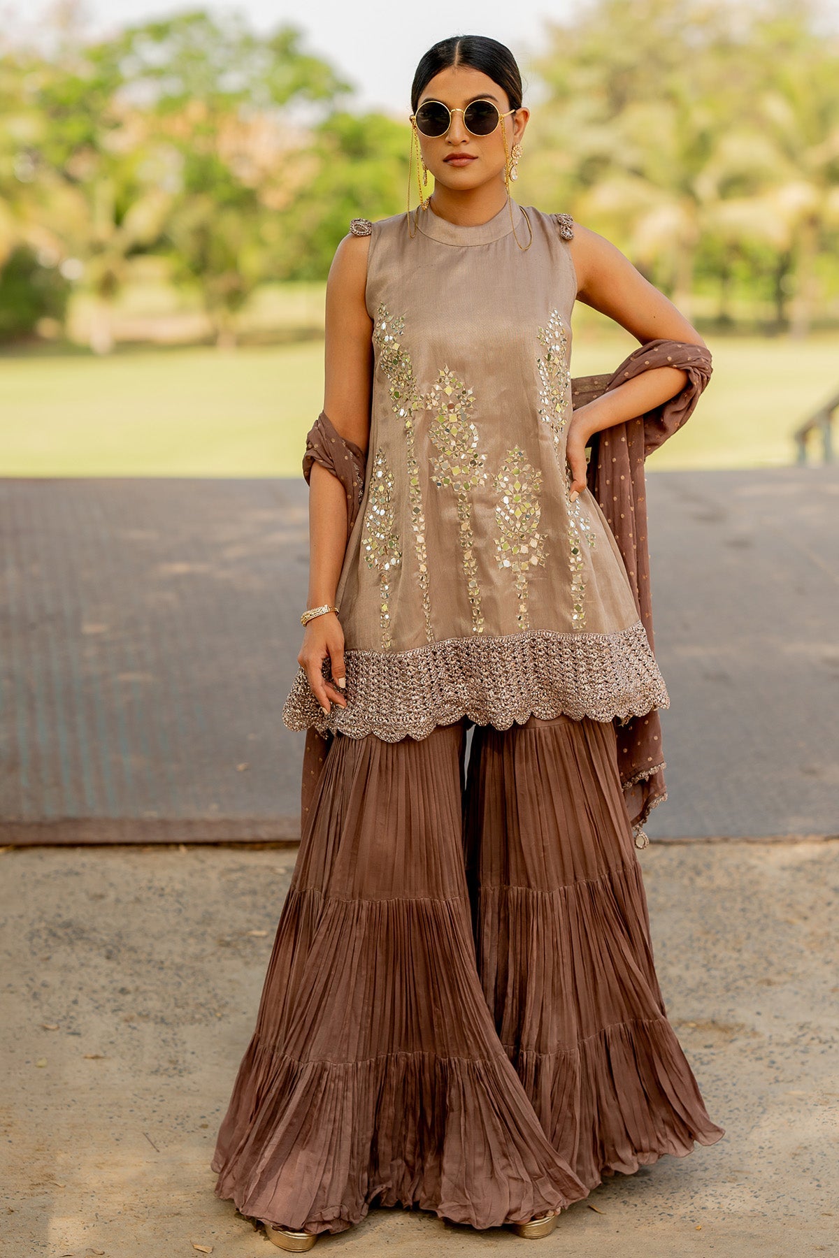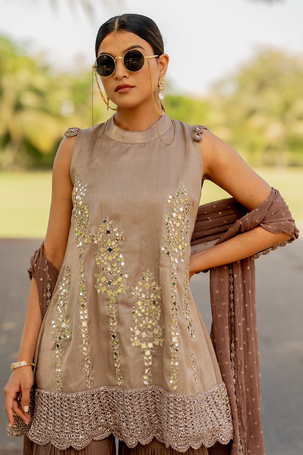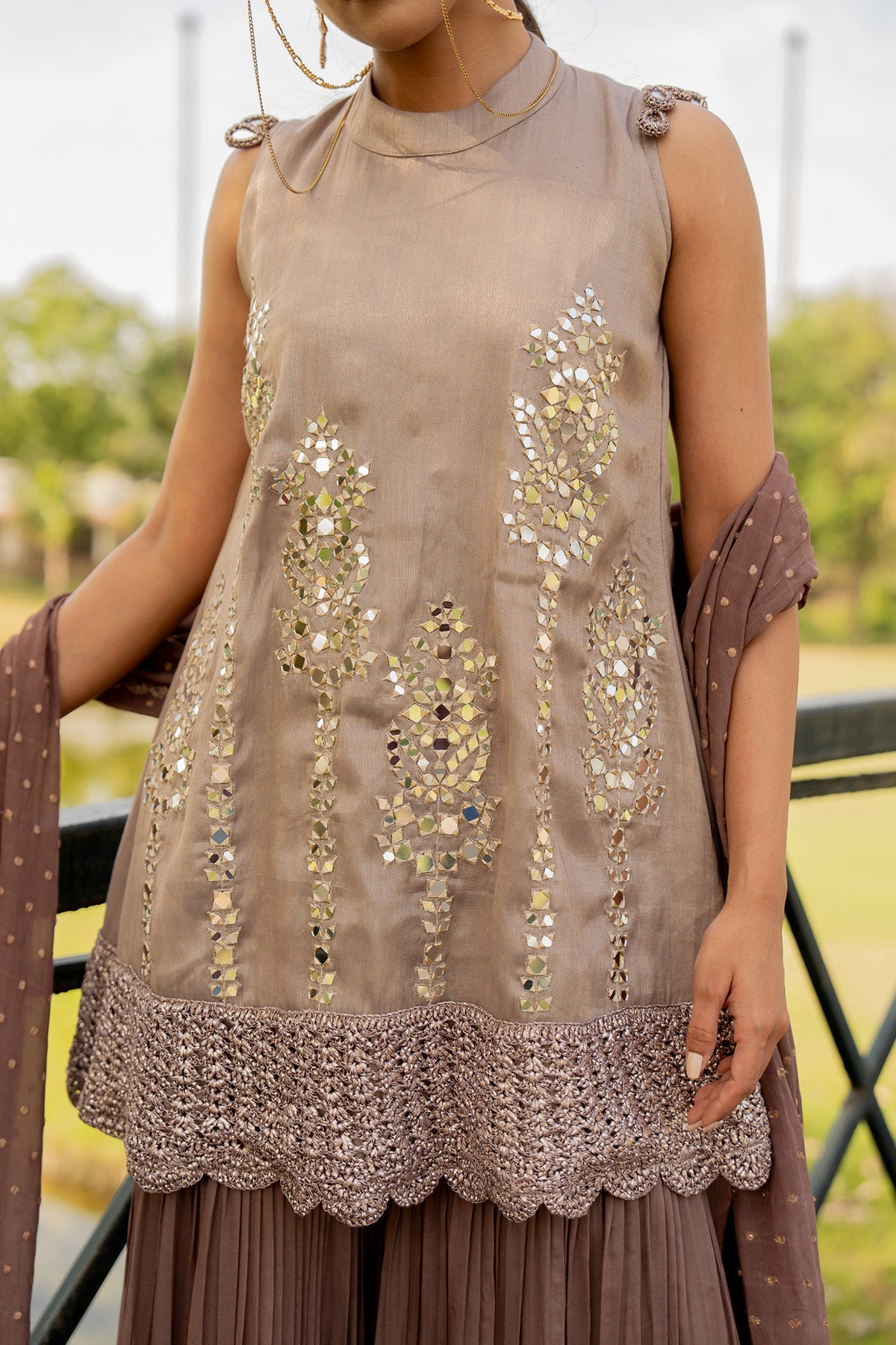 Paired with a tiered organza garara and chinnon butti dupatta, this halter neck kurti features mirror embroidery, mesh patta at the hem, and mirror tasseling on the shoulder.