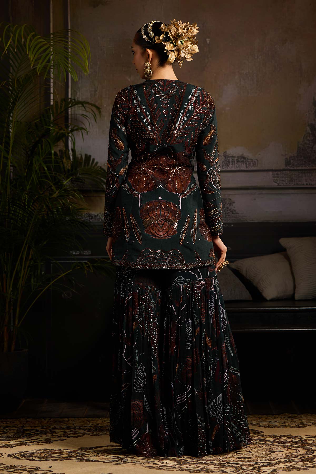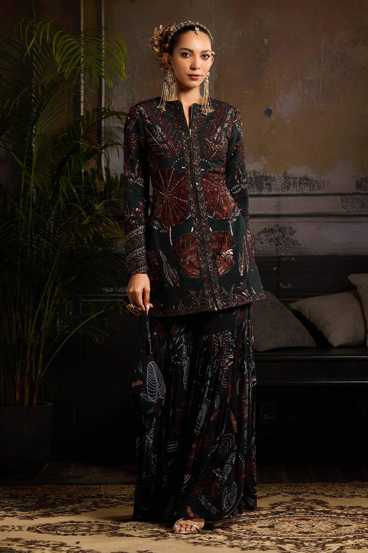 Dark Green Leaf Print with Metallic Gold Highlighted Jacket with Printed Gharara Pants with Potli Bag