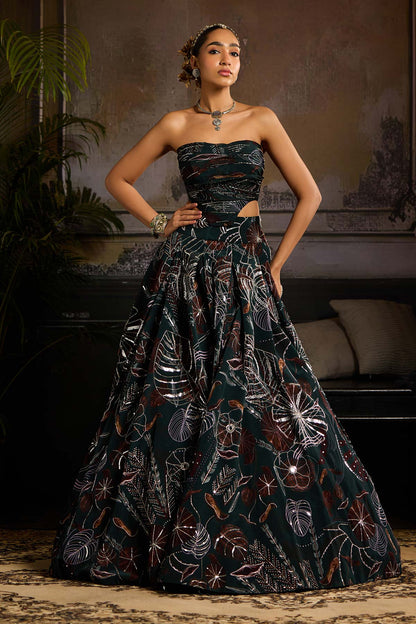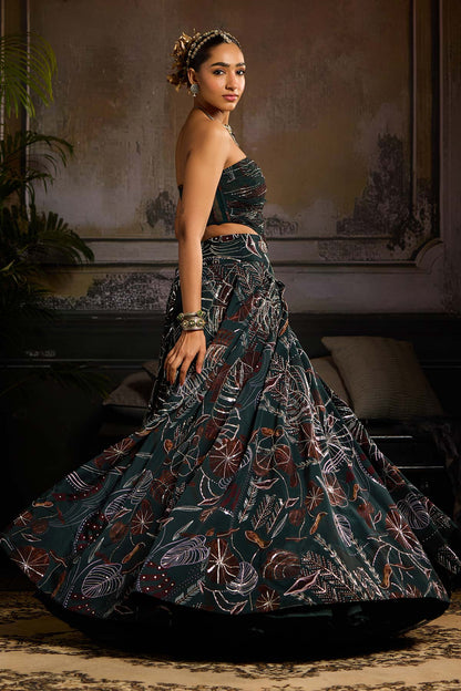 Dark Green Leaf Print and Highlighted Corset with Leaf Print and Embellished Box Pleated Lehenga