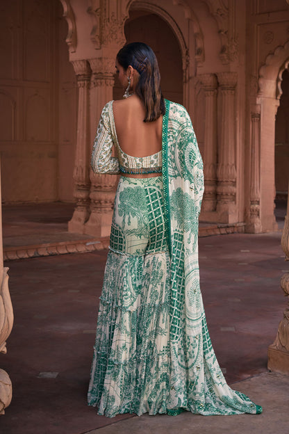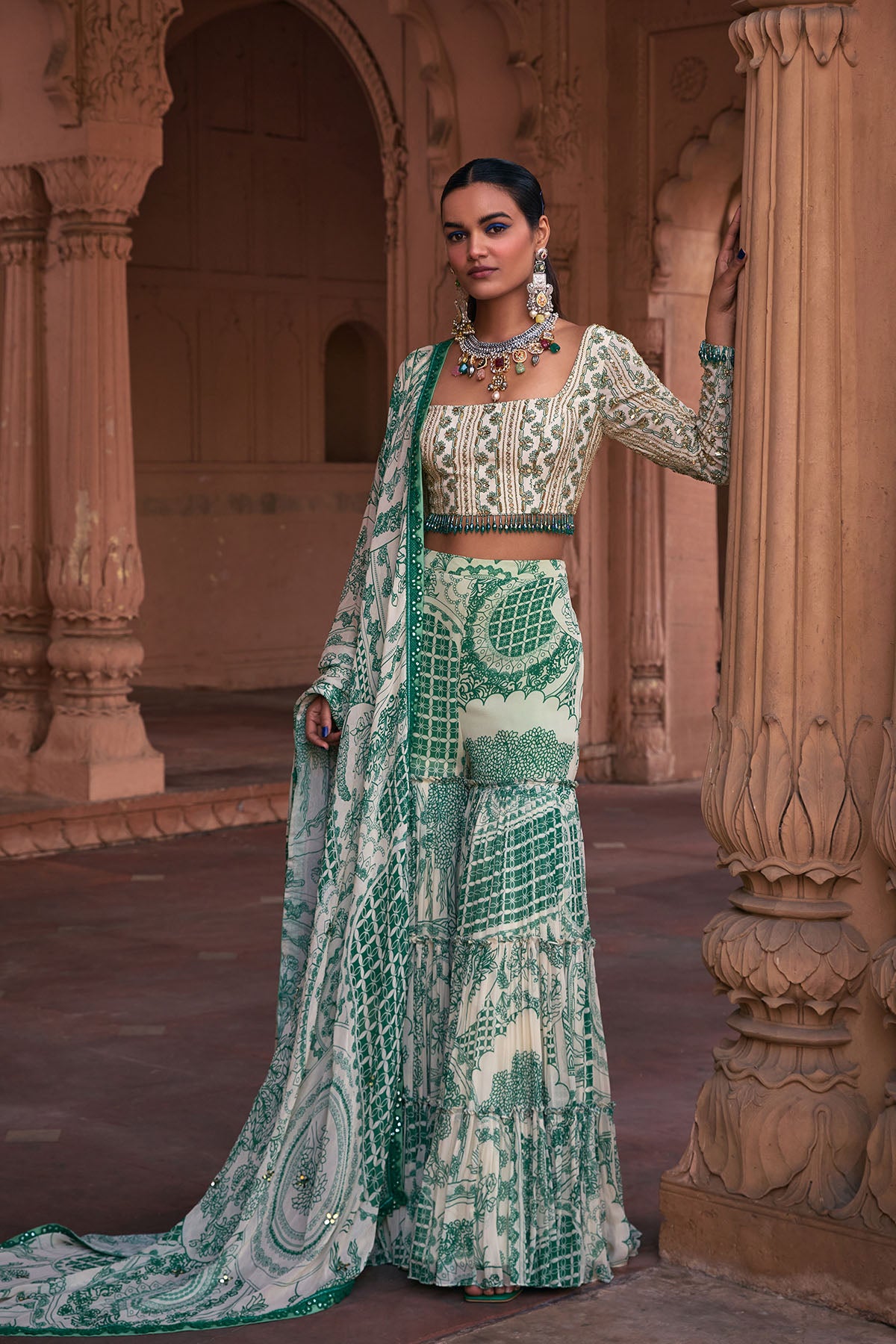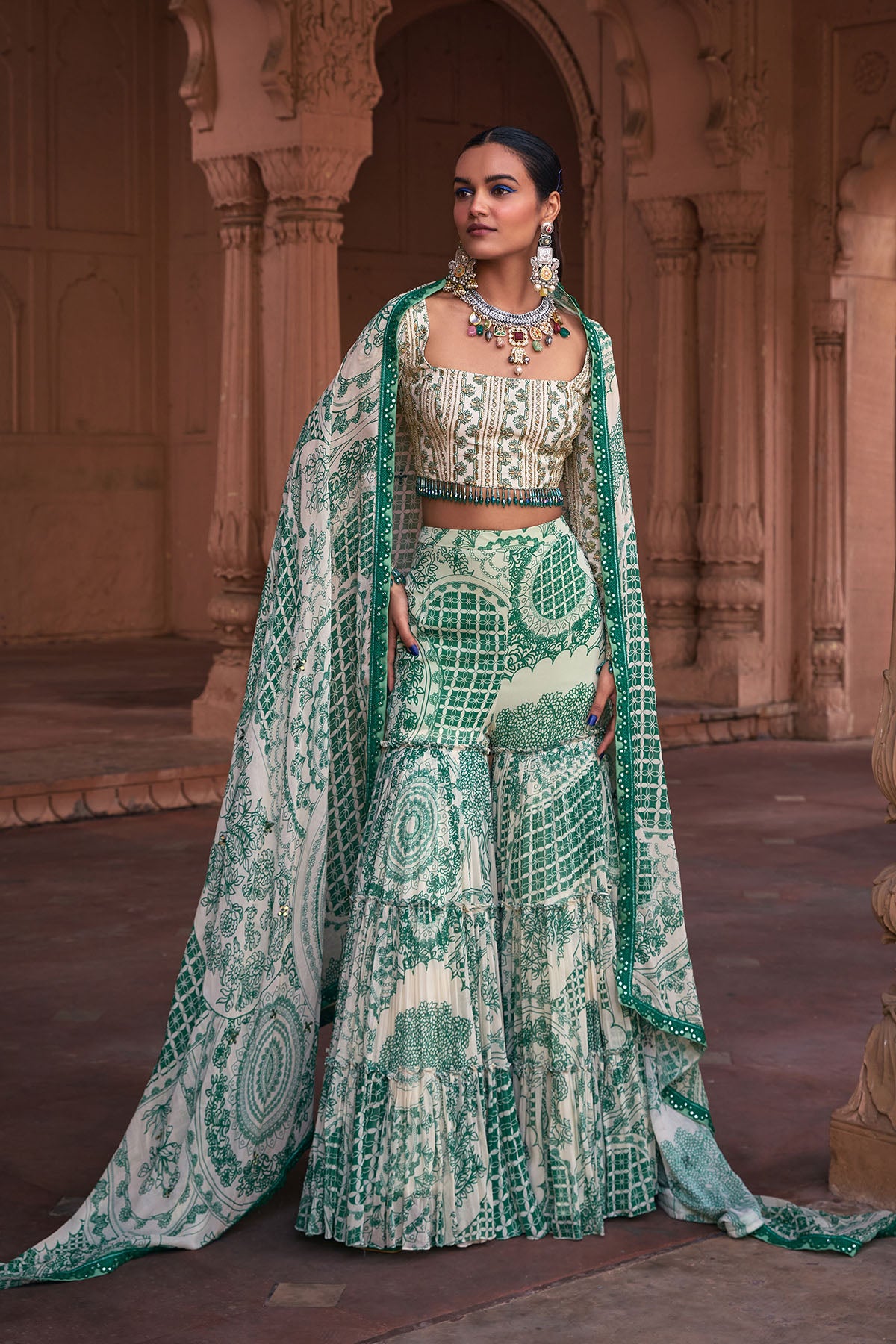 Dark green stripe print & embroidered blouse with dark green thikri print gharara pants and highlighted duptta