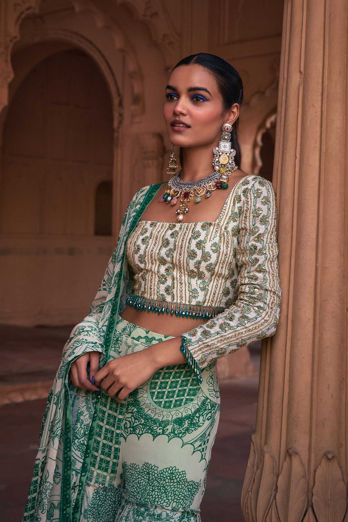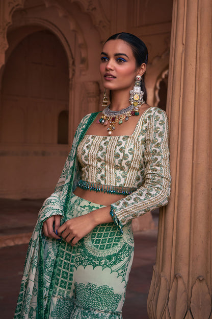 DARK GREEN THIKRI PRINT & HIGHLIGHTED CROP TOP SET