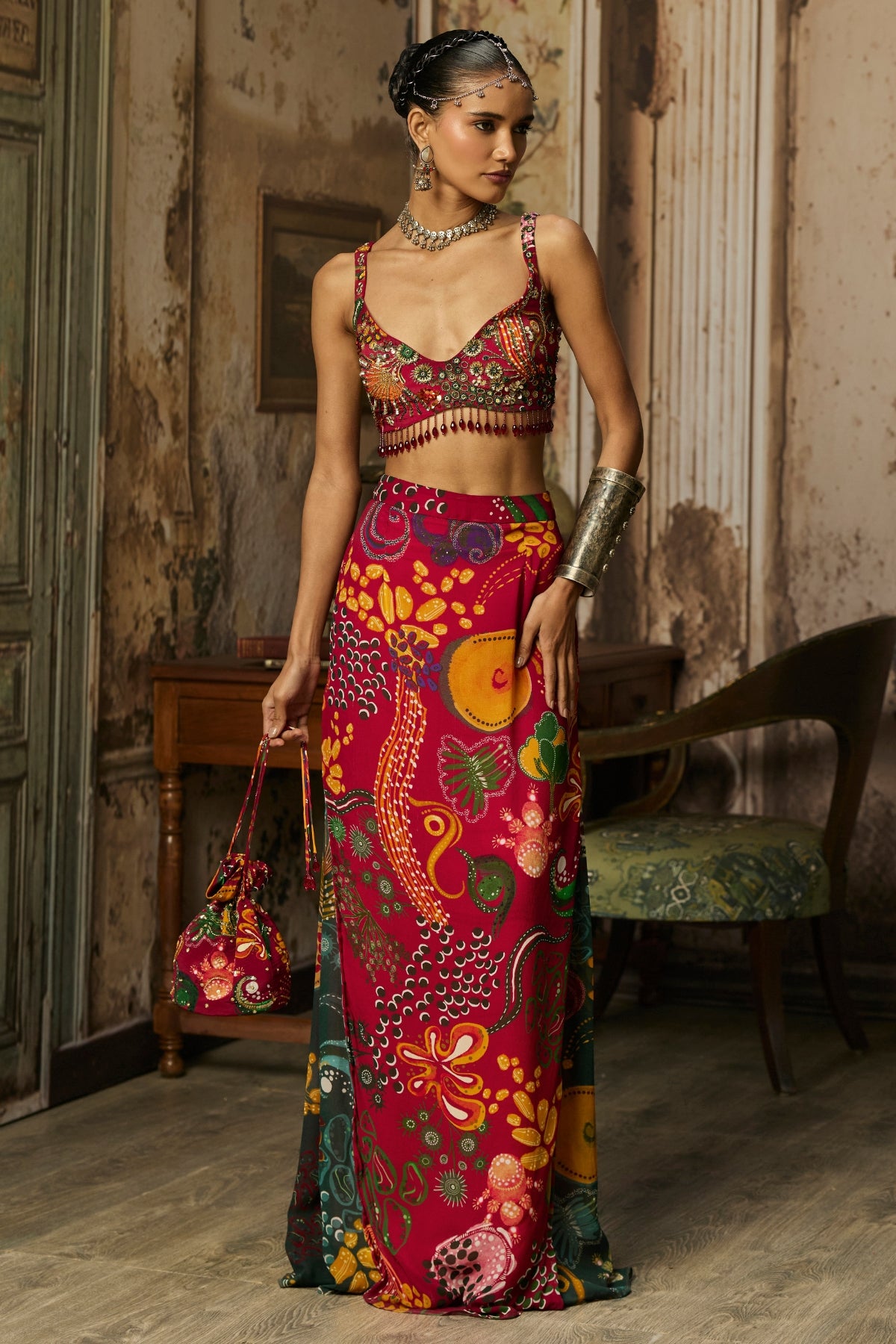 DEEP RED CORAL VEIL PRINTED AND HIGHLIGHTED BLOUSE WITH DUAL CORAL VEIL PRINTED SKIRT PAIRED WITH POTLI