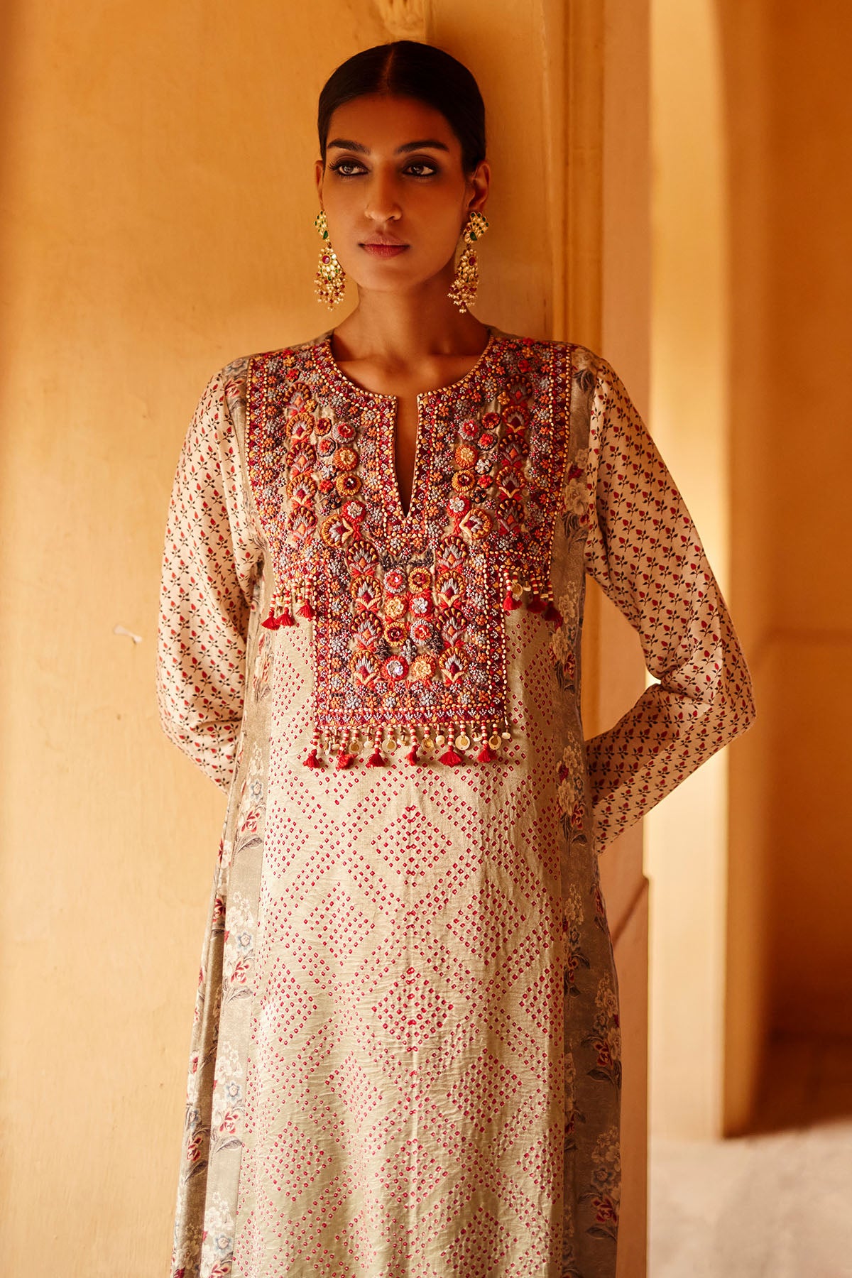 Elements: Statement Kurta, Classic Hand Dyed Bandhani In A Festive Grey & Red, Hand Embroidered Thread Work Yoke