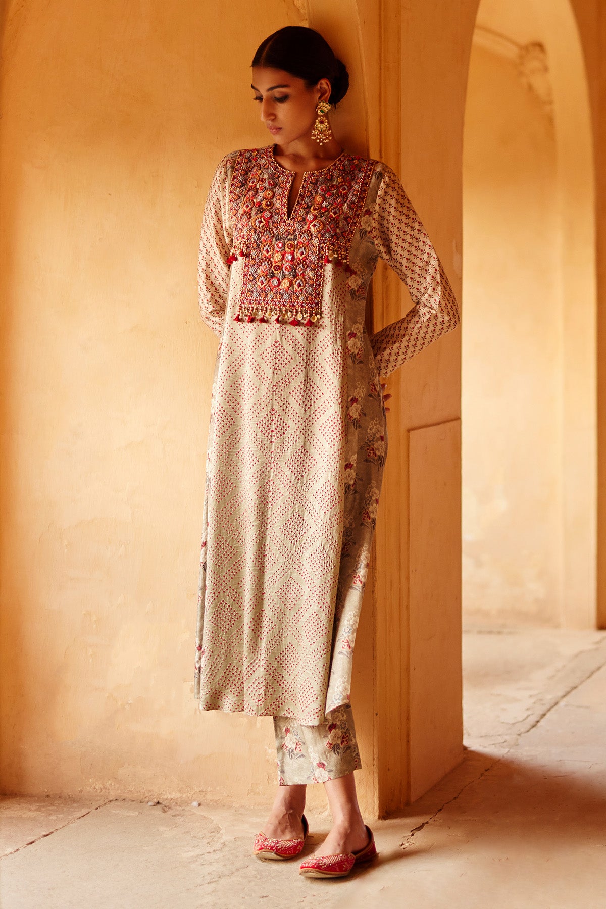 Grey embroidery patch middle bandhani kurta with grey printed pants