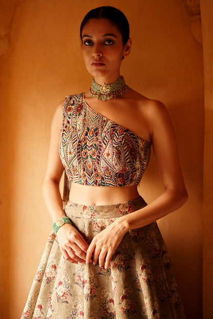 Elements: Fresh Floral Print, Hand Beaded Croptop, Tissue Lehenga