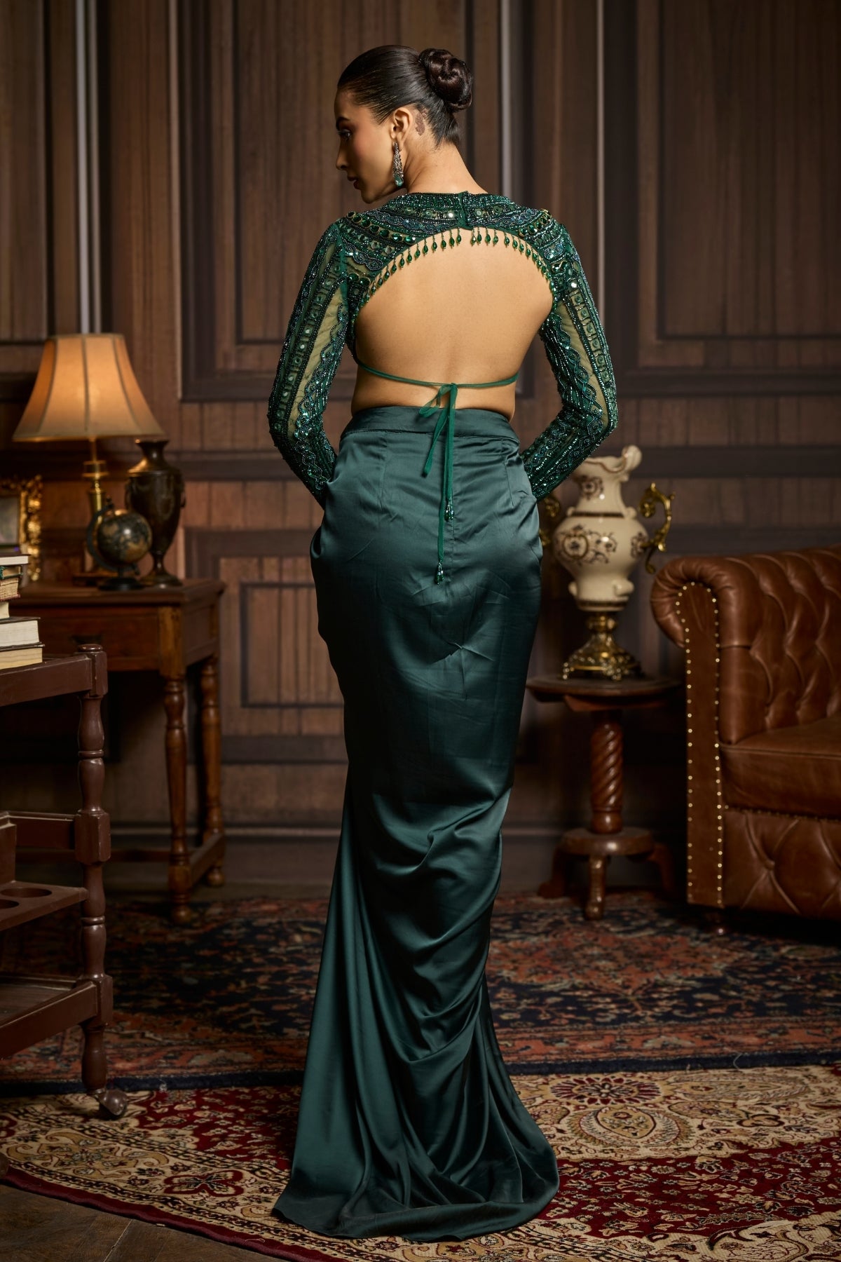 EMRALD GREEN EMBROIDERED FULL SLEEVES BLOUSE WITH DRAPED SKIRT