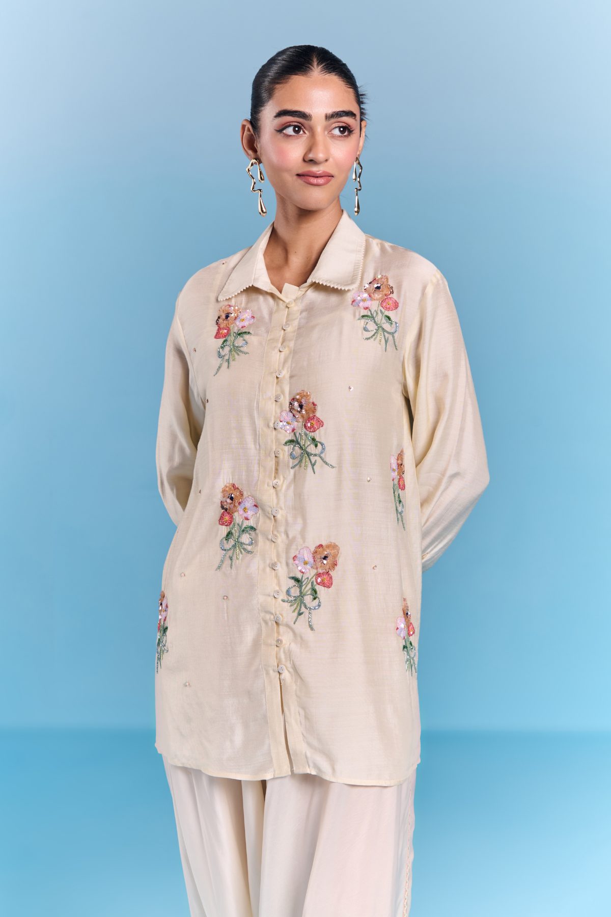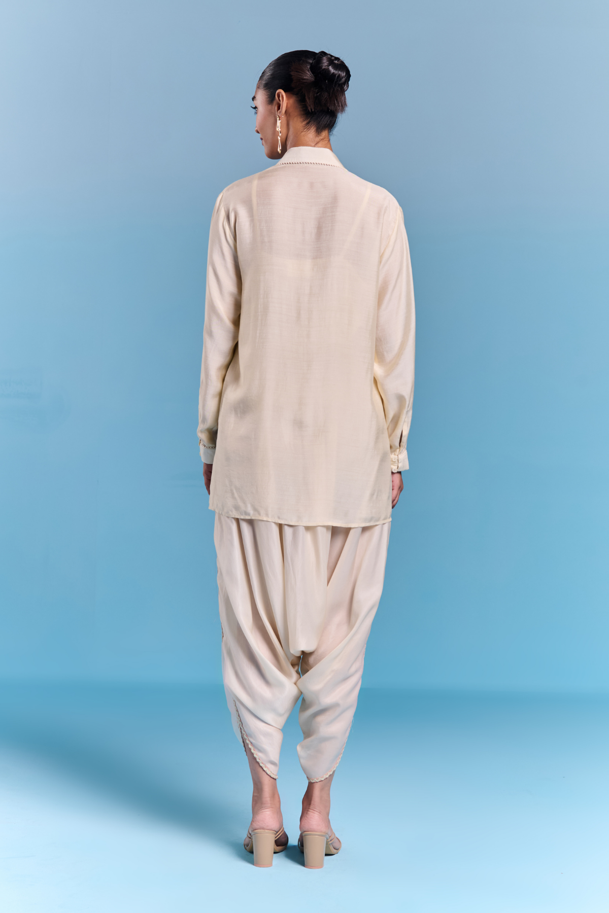 Indulge In The Grace Of Sequine And Shine Featuring A Refined Floral Vinatge Embroidery On Shirt , Comes With Graceful Dhoti Pants Epitomizing Modern Sophistication With A Touch Of Classic Charm.perfect For Your Summer Outings.