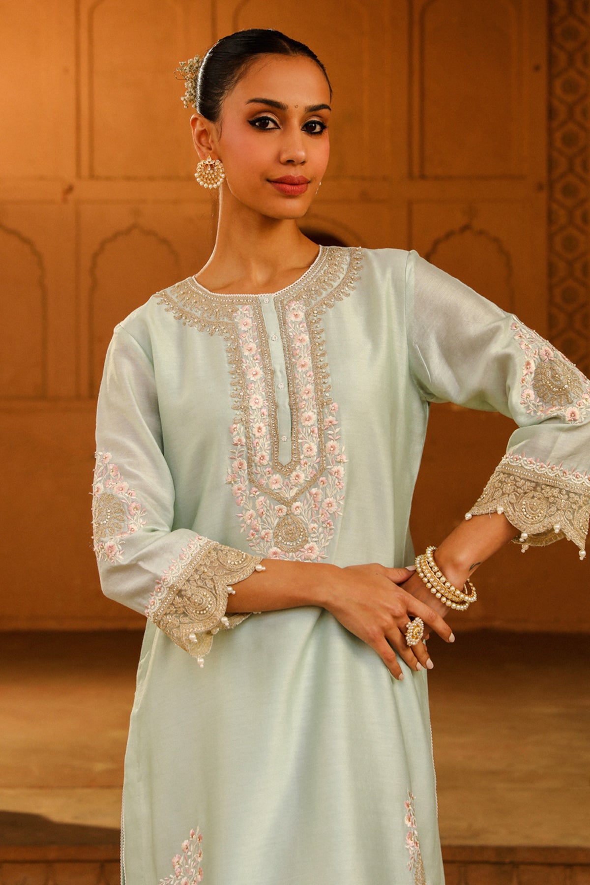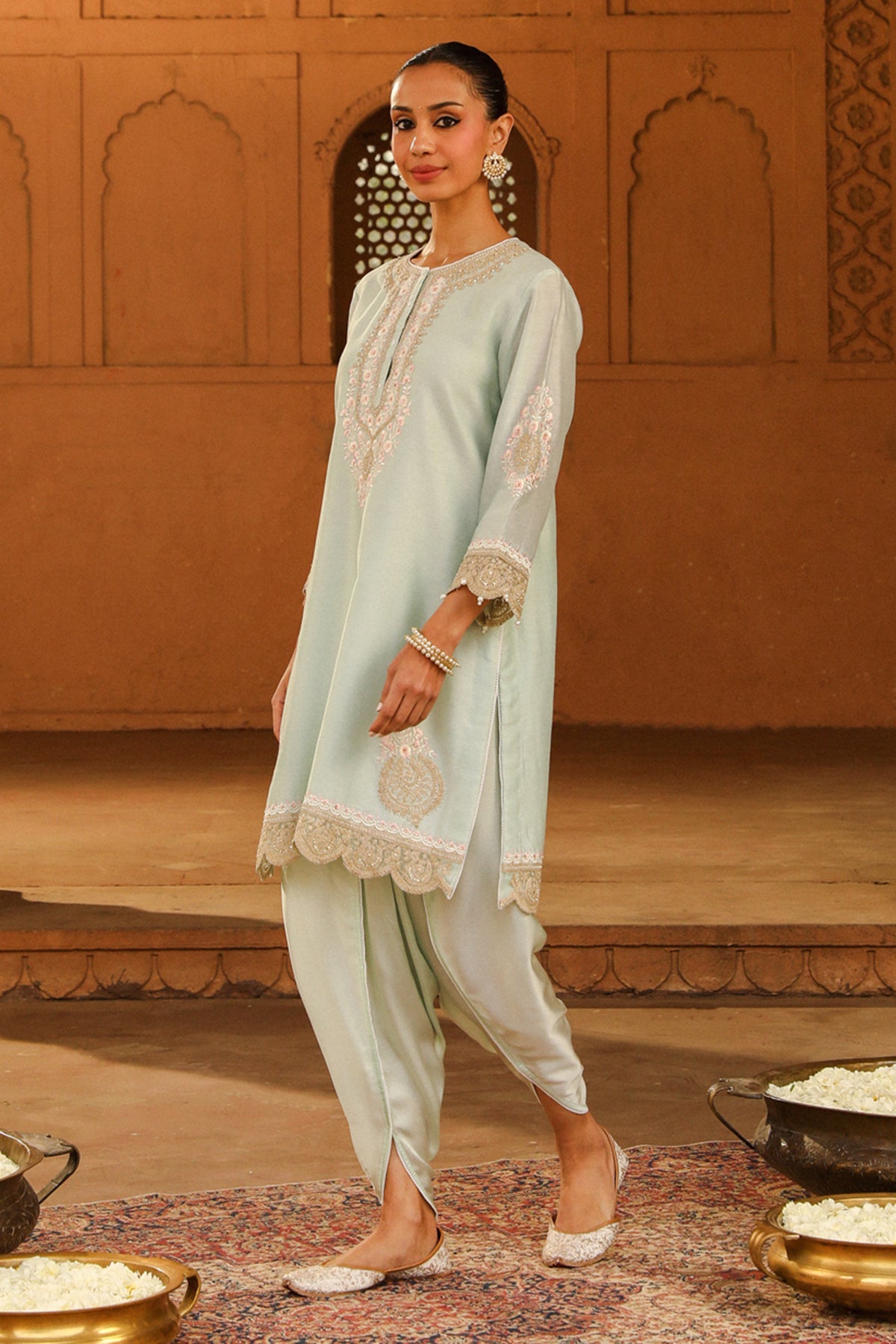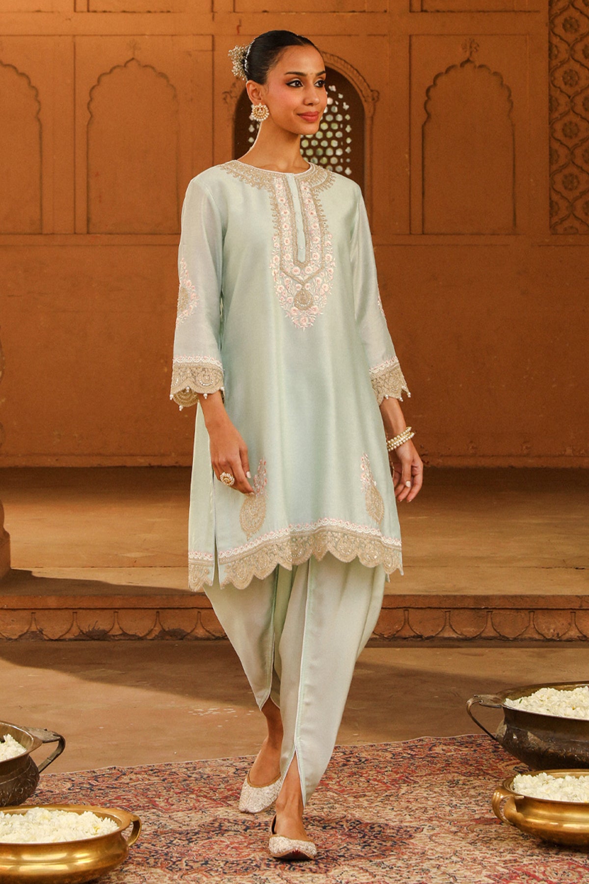 The Ernika short kurta with salwar from our Mehnoor Collection is made in silk chanderi with a dhoti. The kurta is having a zero neck with slit and three-quarter sleeves. The kurta is adorned with Kashmiri tilla and parsi gara embroidery highlighted with basra moti. The sleeves of the kurta is a having an organza detailing. The outfit is finished with scallop detailing.