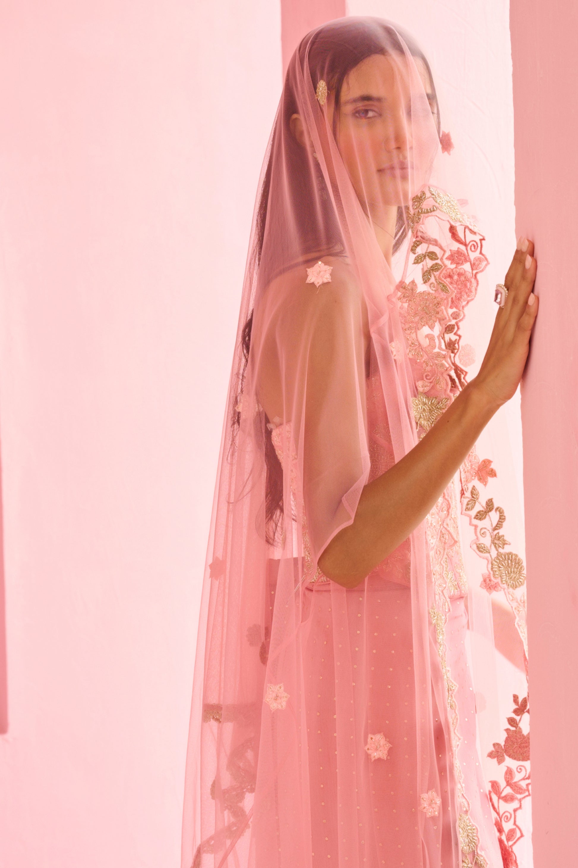 Embellished drape skirt paired with thread, glassbeads and zardozi embroidered corset top and tulle cape
