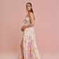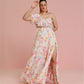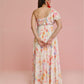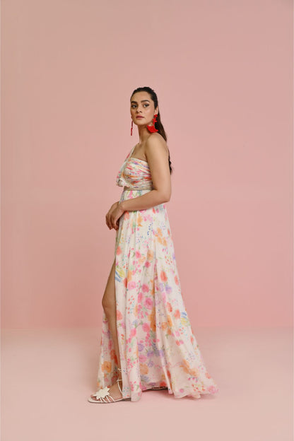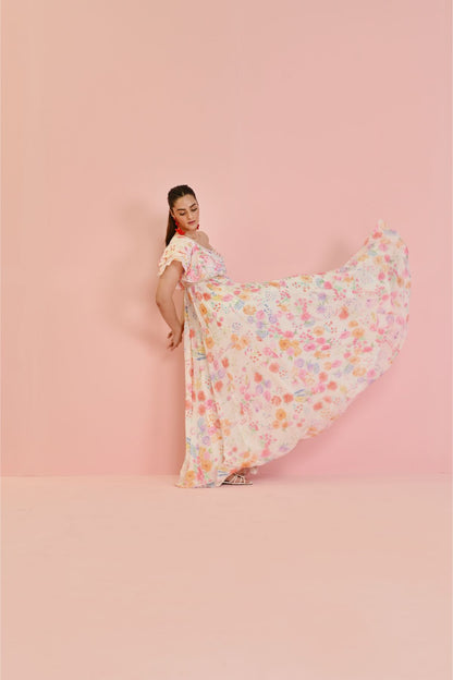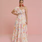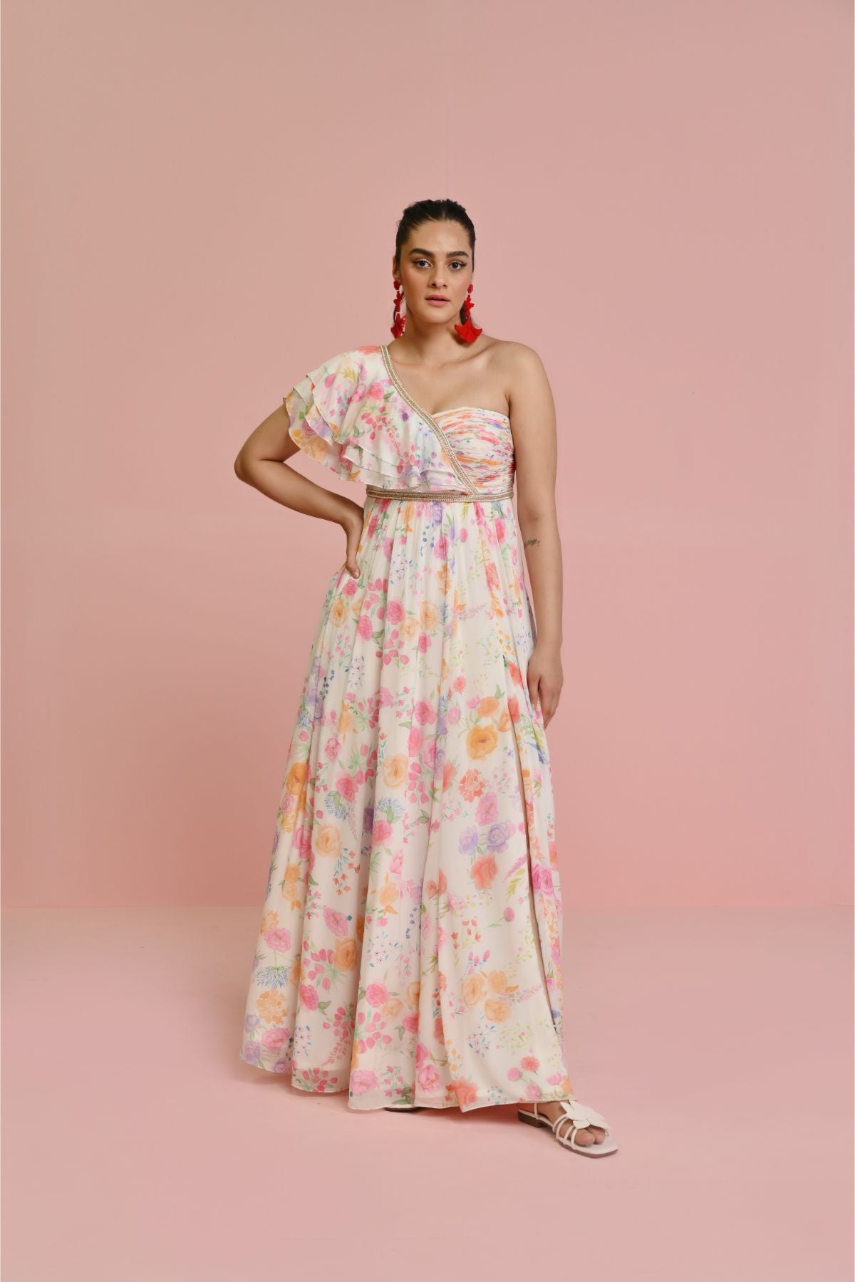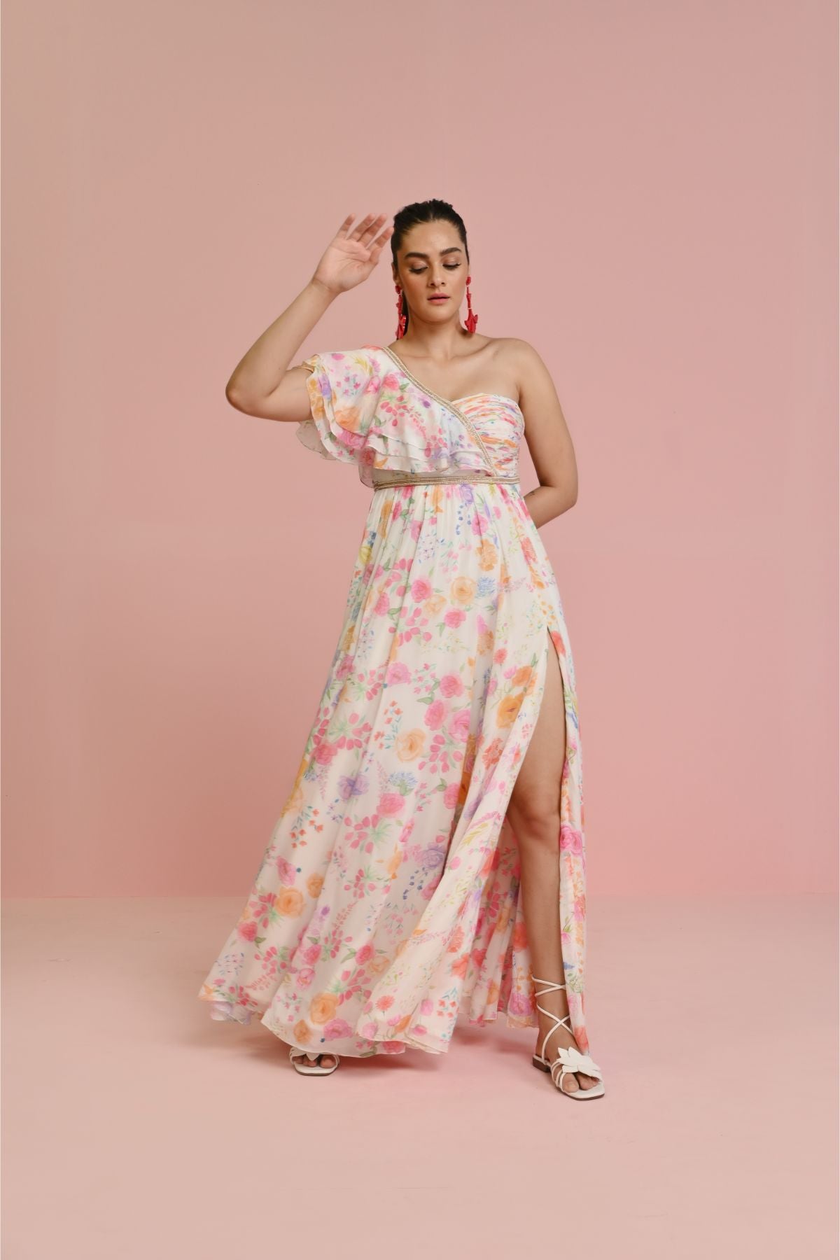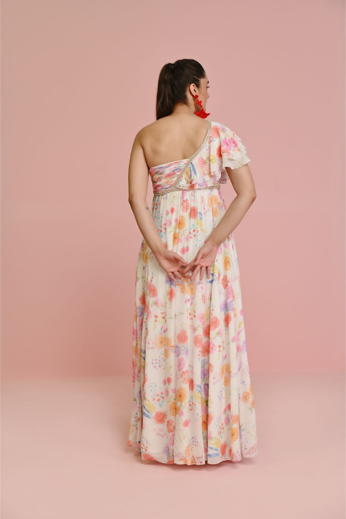 Floral One Shoulder Rushed Gown With Beaded Embroidery On Waist.