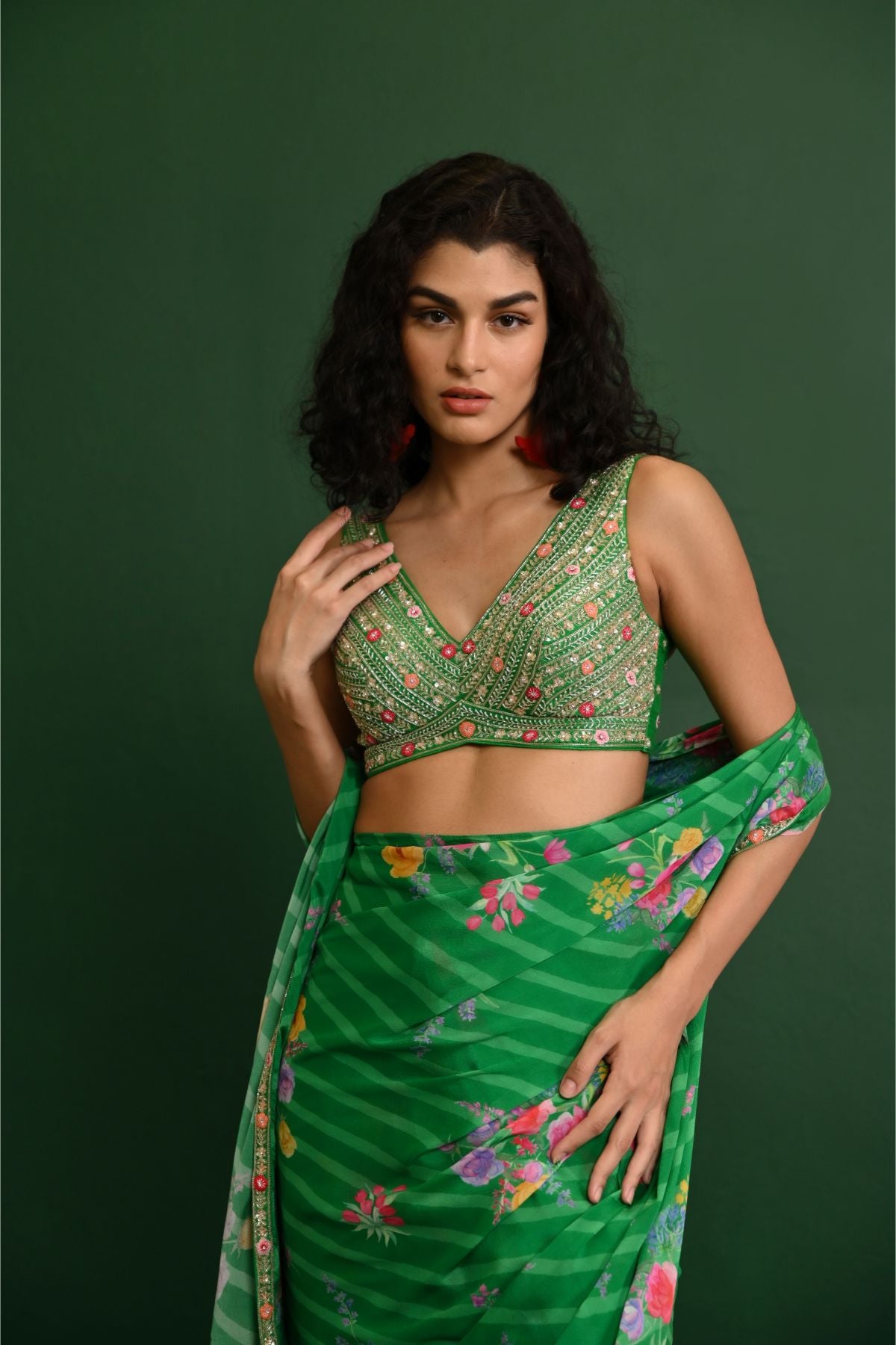 Glass bead And Resham Embroidered Blouse With Floral Printed Pre Pleated Saree.