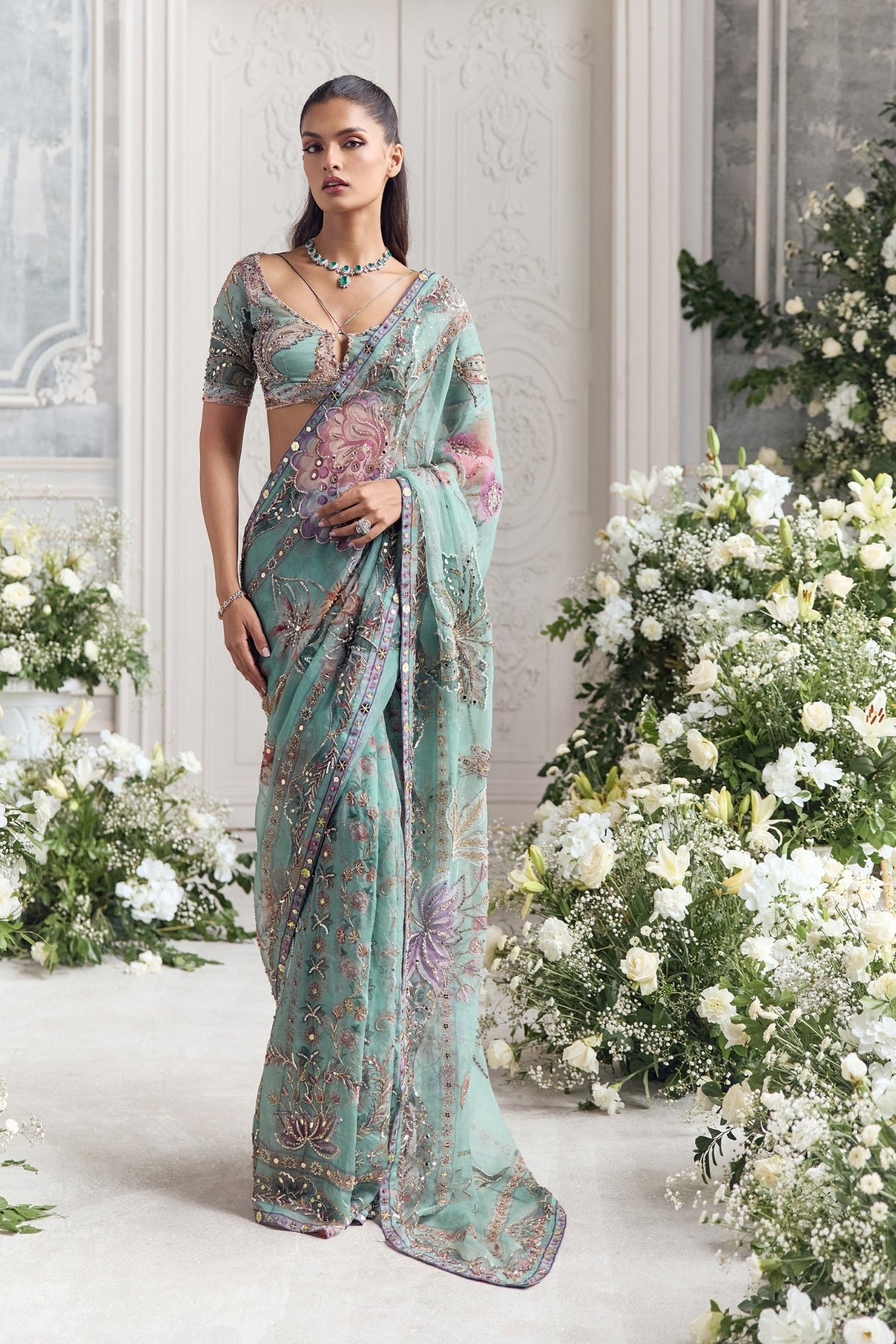 Hand Embroidered Blouse Paired With Embroidered Predraped Saree