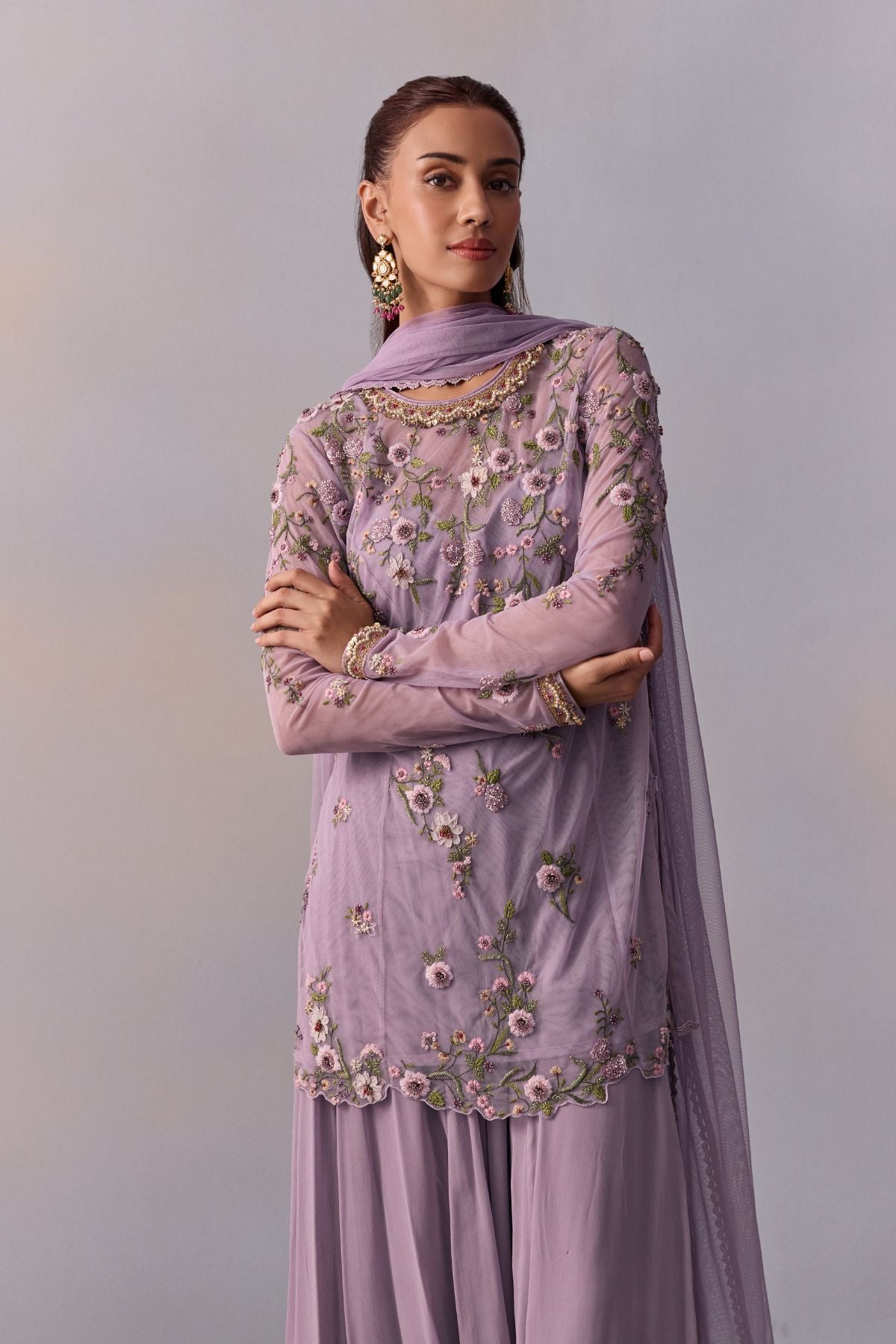 Dazzle in the elegnace and grace of our Fidah sharara set inm soft floral Motifs design with intricate hand embroidery on jackets with beads and sequins and a short bustier. It Is Paired With flowy Sharara for stylish look. Perfect outfit for every Festive and wedding occassions.