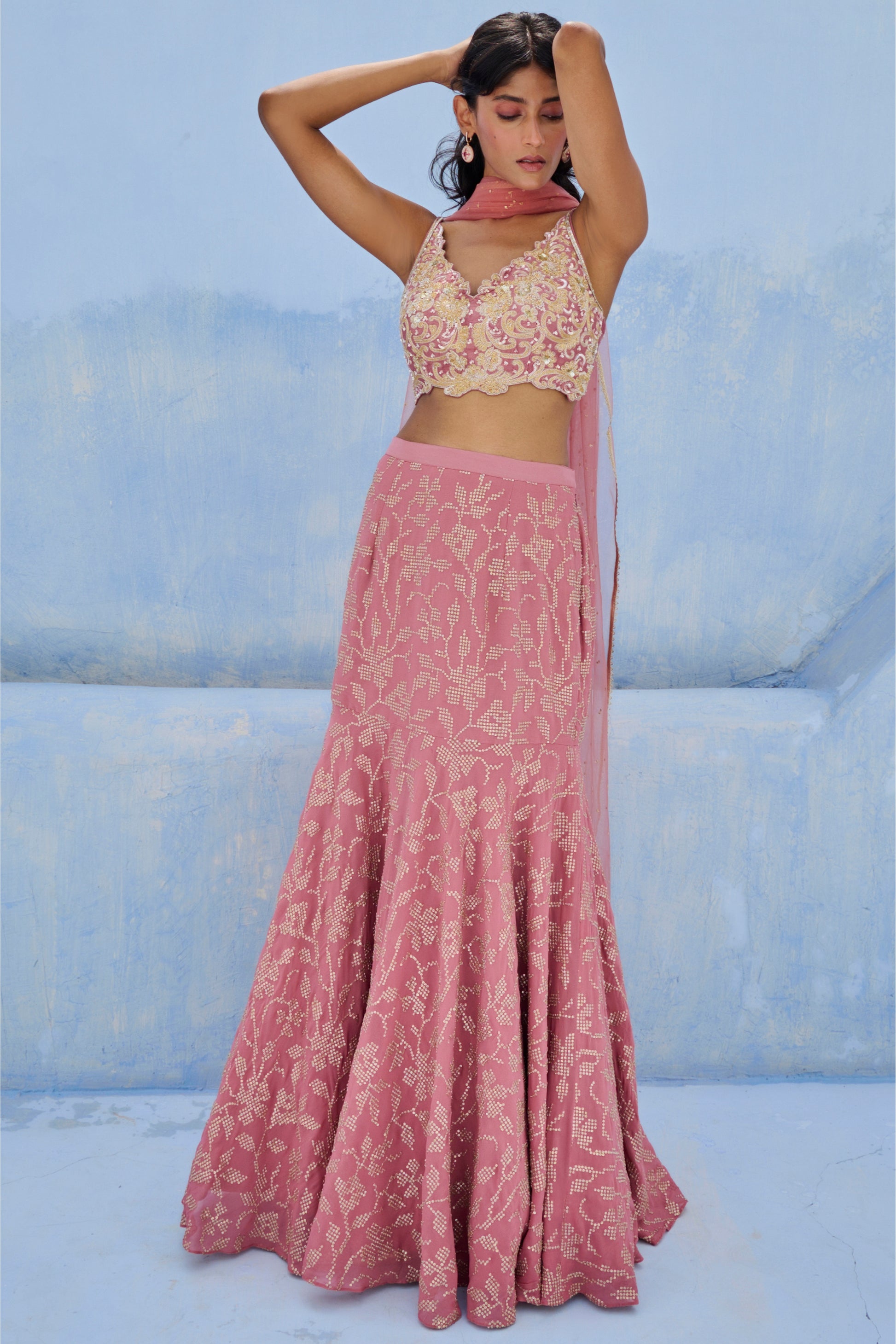 Fit and flare skirt with floral sequence embellishments paired with sequence and glassbeads embroidered blouse and tulle dupatta