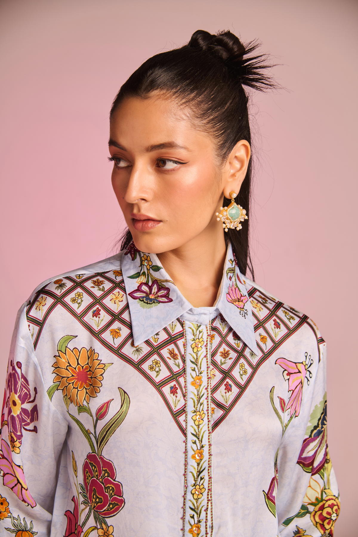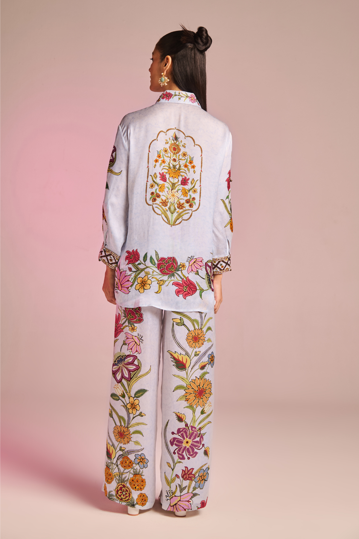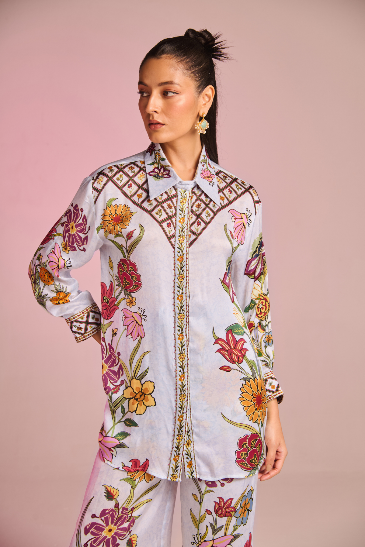 Indulge In The Grace Of Flowers , Boasting A Refined Floral Button-down Shirt Collar And Graceful Sleeves Paired With Pants, Epitomizing Modern Sophistication With A Touch Of Classic Charm.