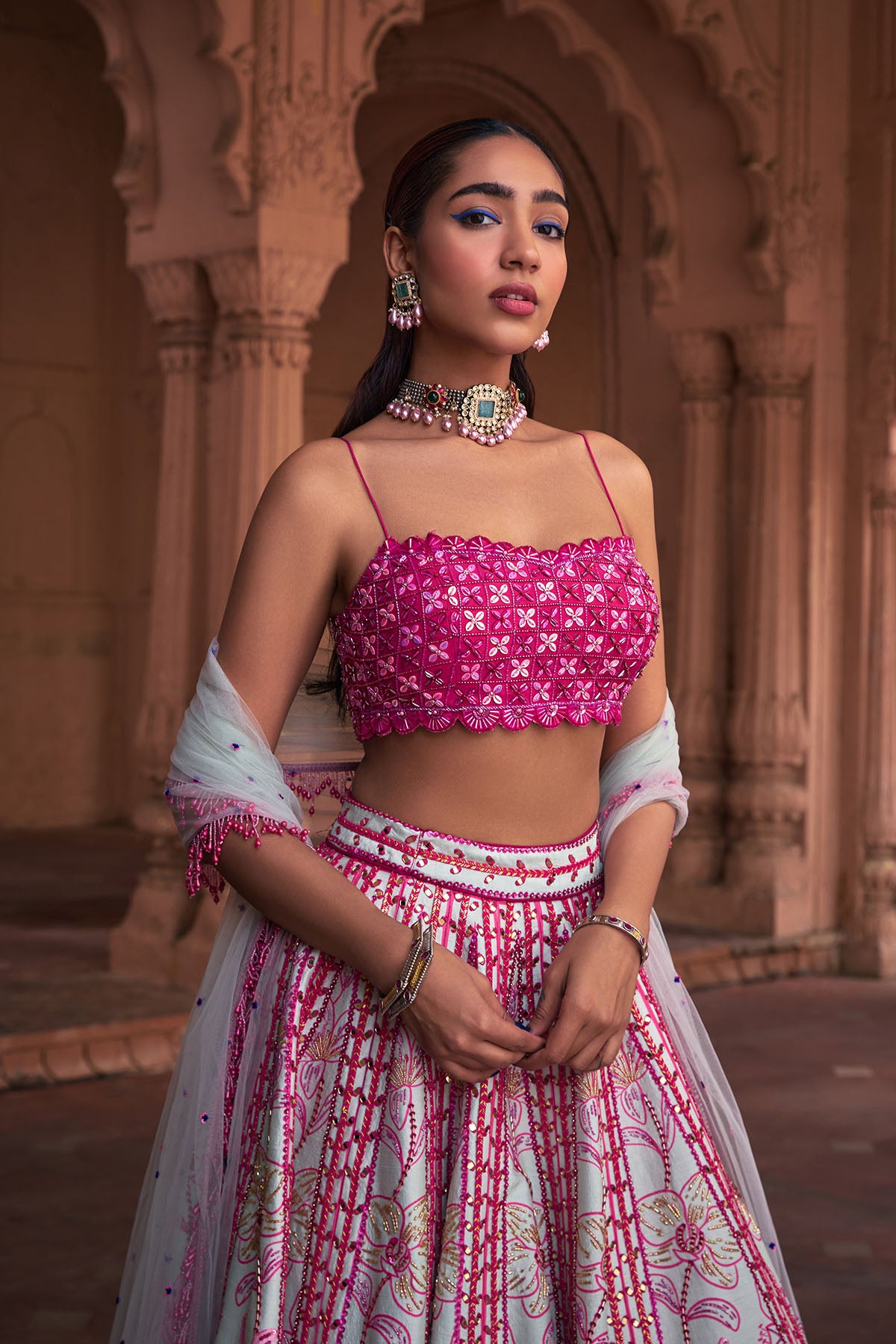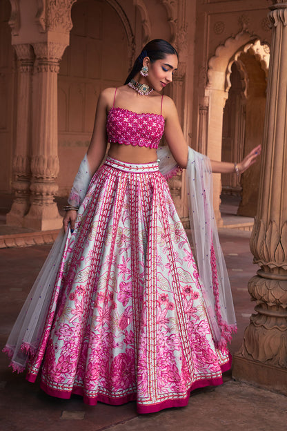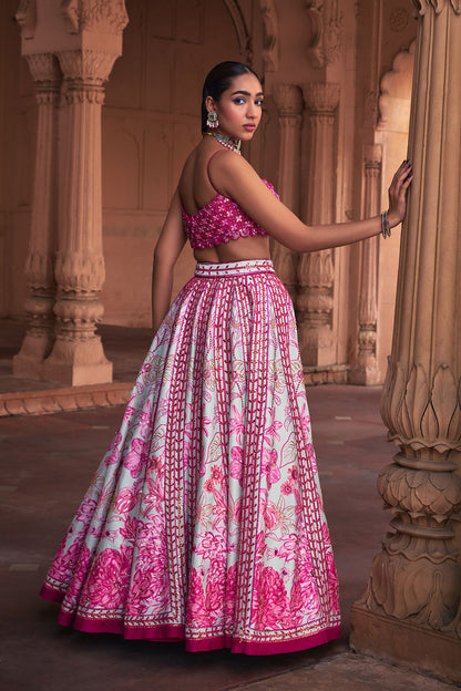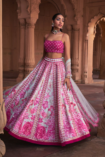 FUSCHIA FLORAL FRAME PRINT & EMBROIDERED LEHENGA SET