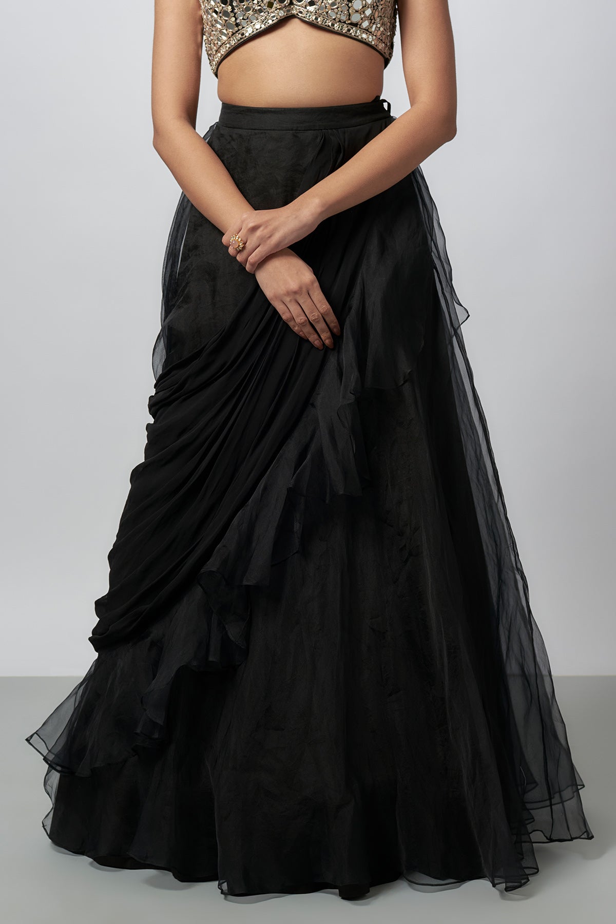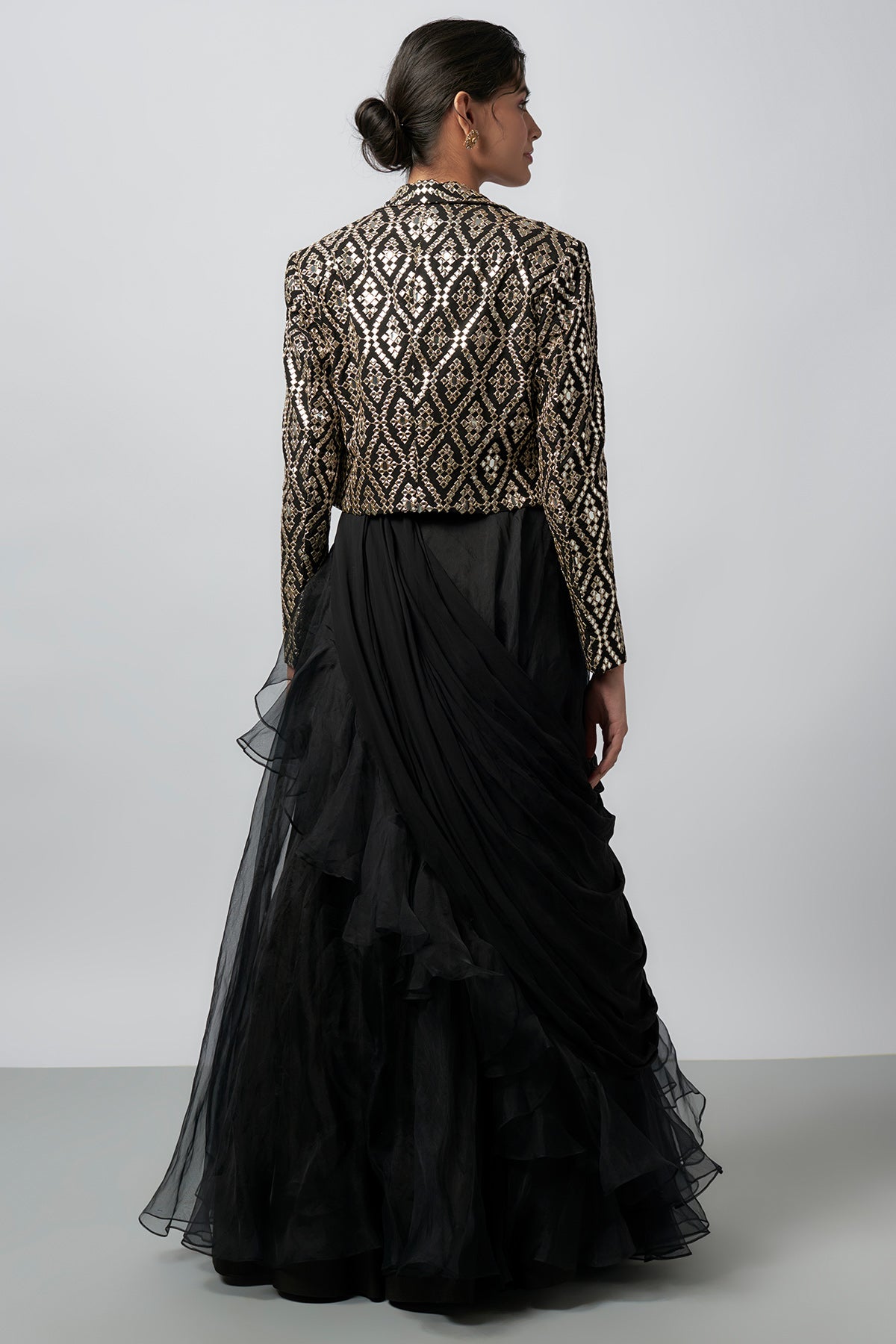 This Outfit Is A Contemporary Fusion Featuring An Intricately Embroidered Cropped Jacket With Geometric Patterns. It Is Paired With A Hand Embroidered Bralette. The Flowing Black Layered Skirt With Cascading Ruffles Adds Volume To The Striking Silhouette.
