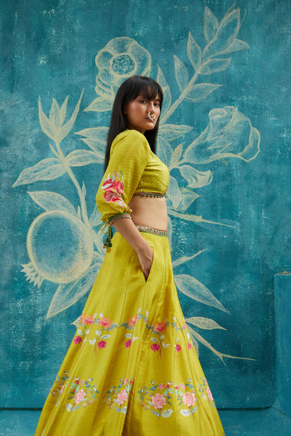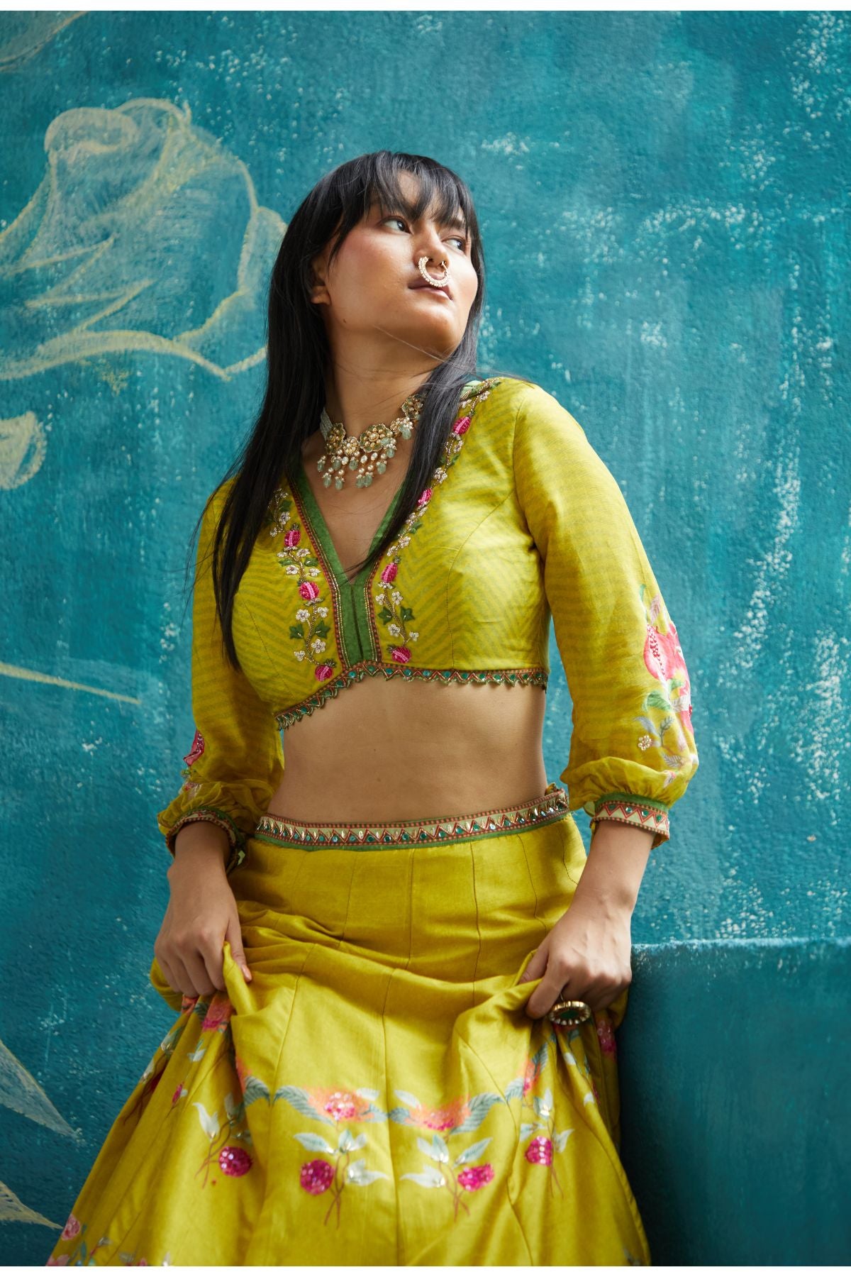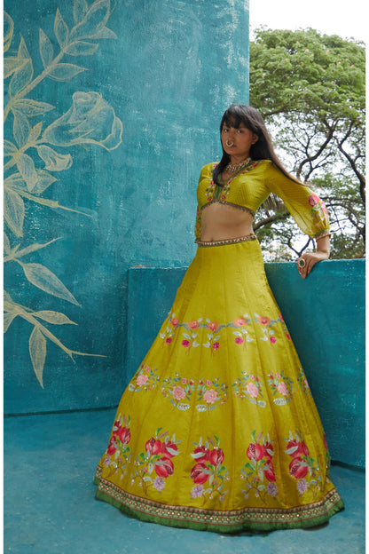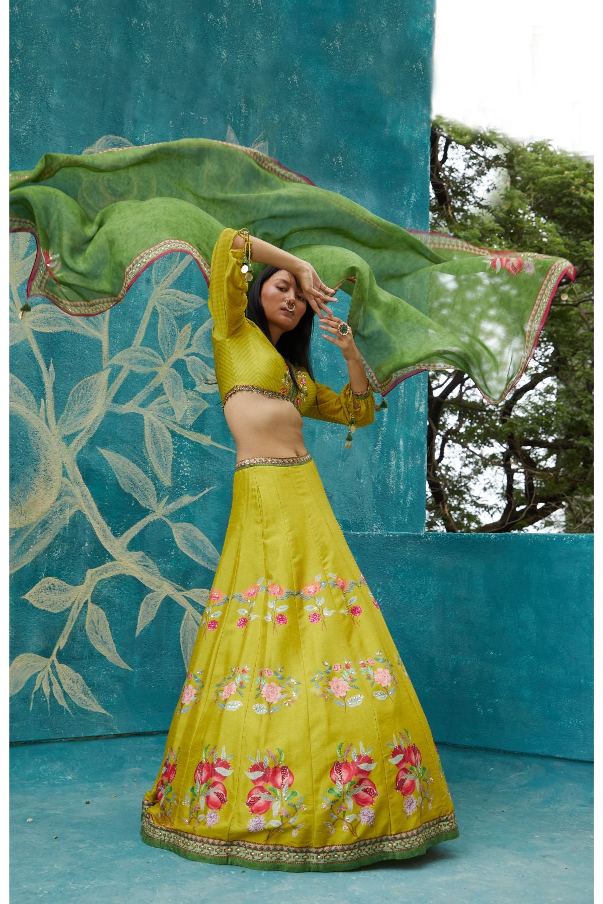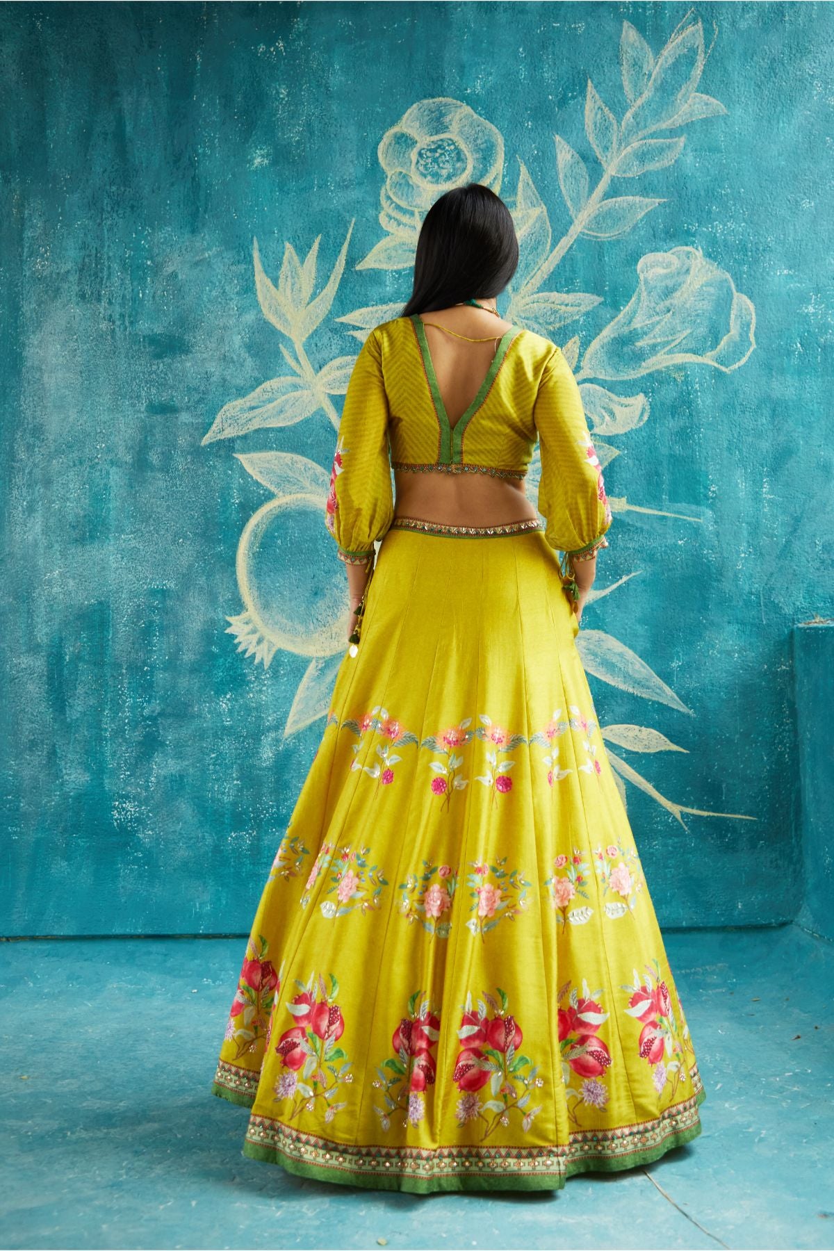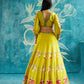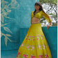 Yellow Printed Lehenga Set Ornamented With Embroidery Neckline, Chiffon Sleeves And Printed Organza Dupatta