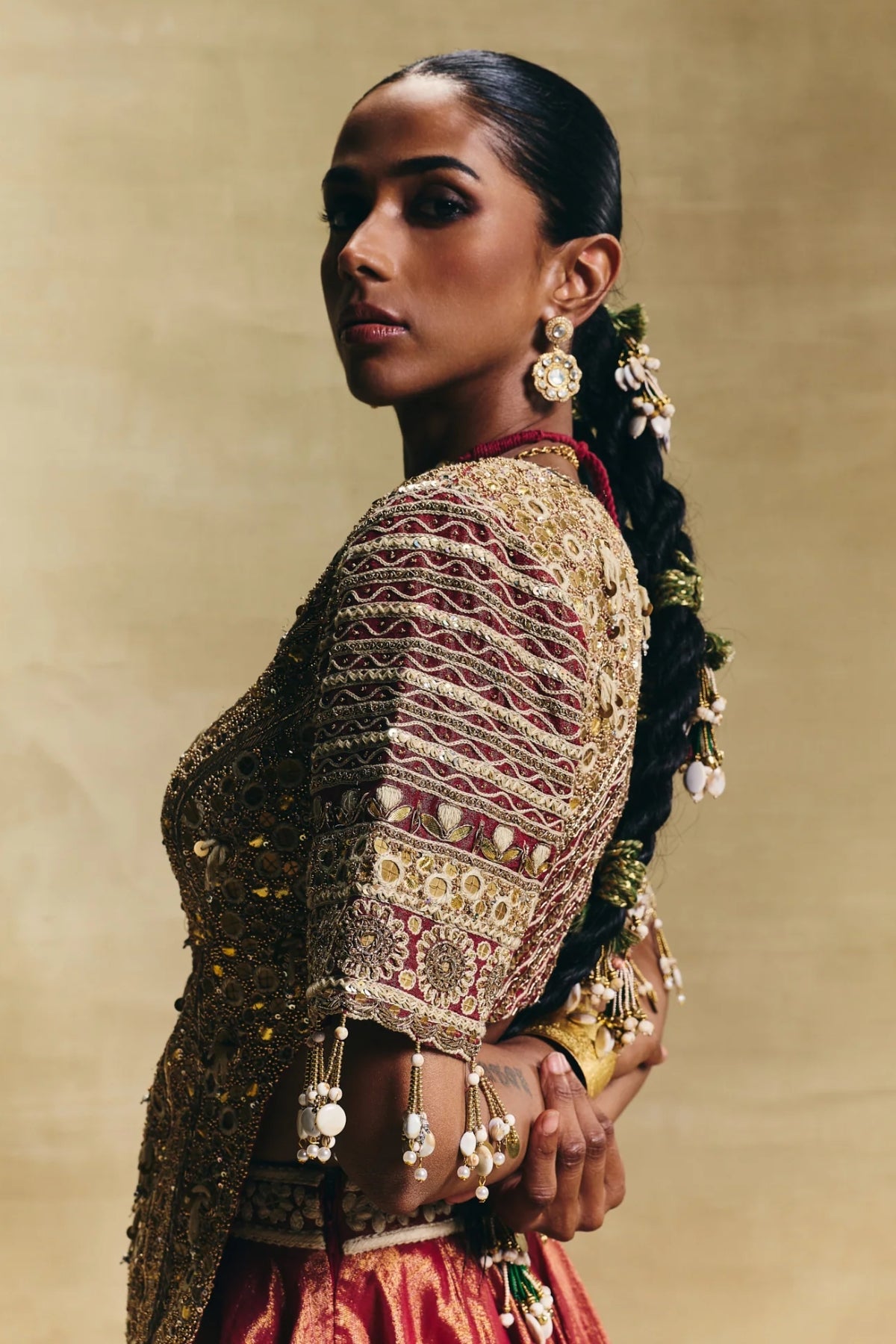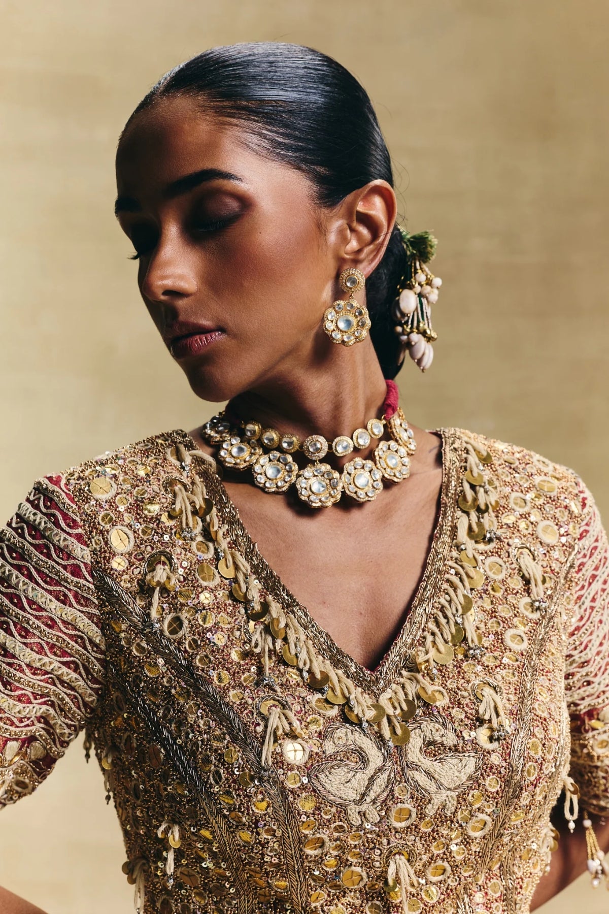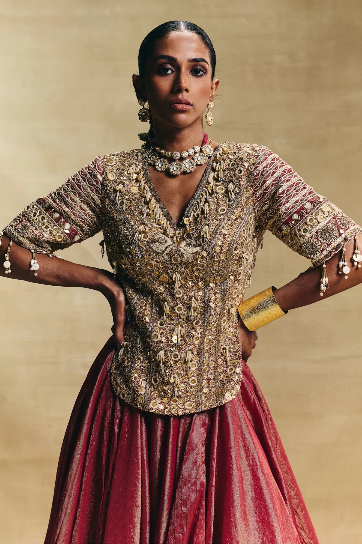 karti blouse on crepe tissue paired with cotton tissue lehenga