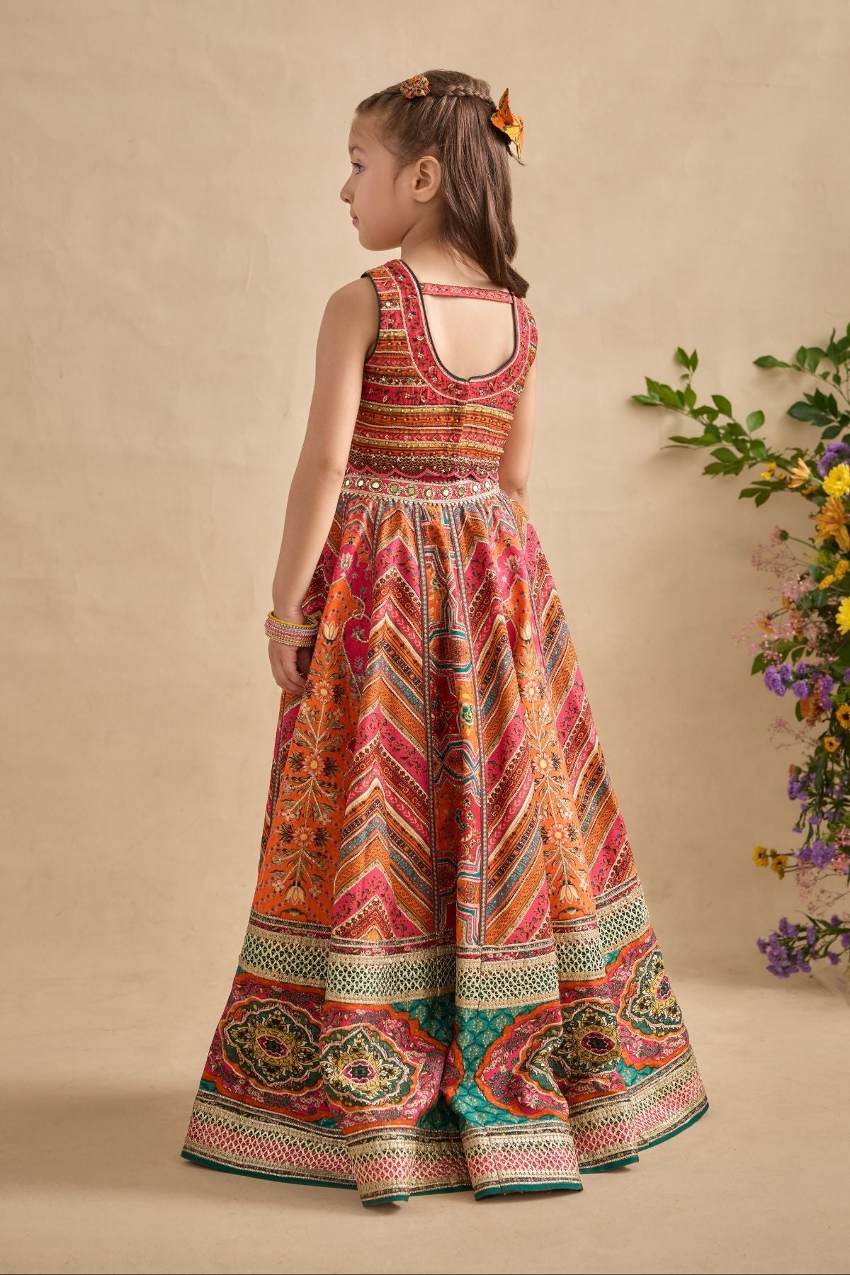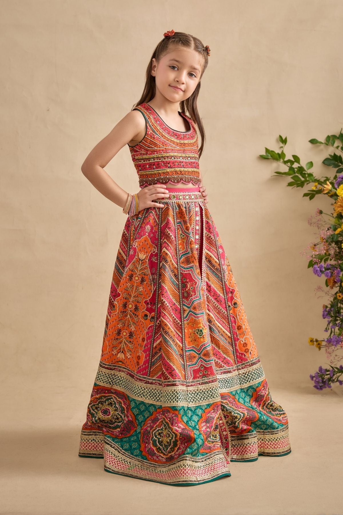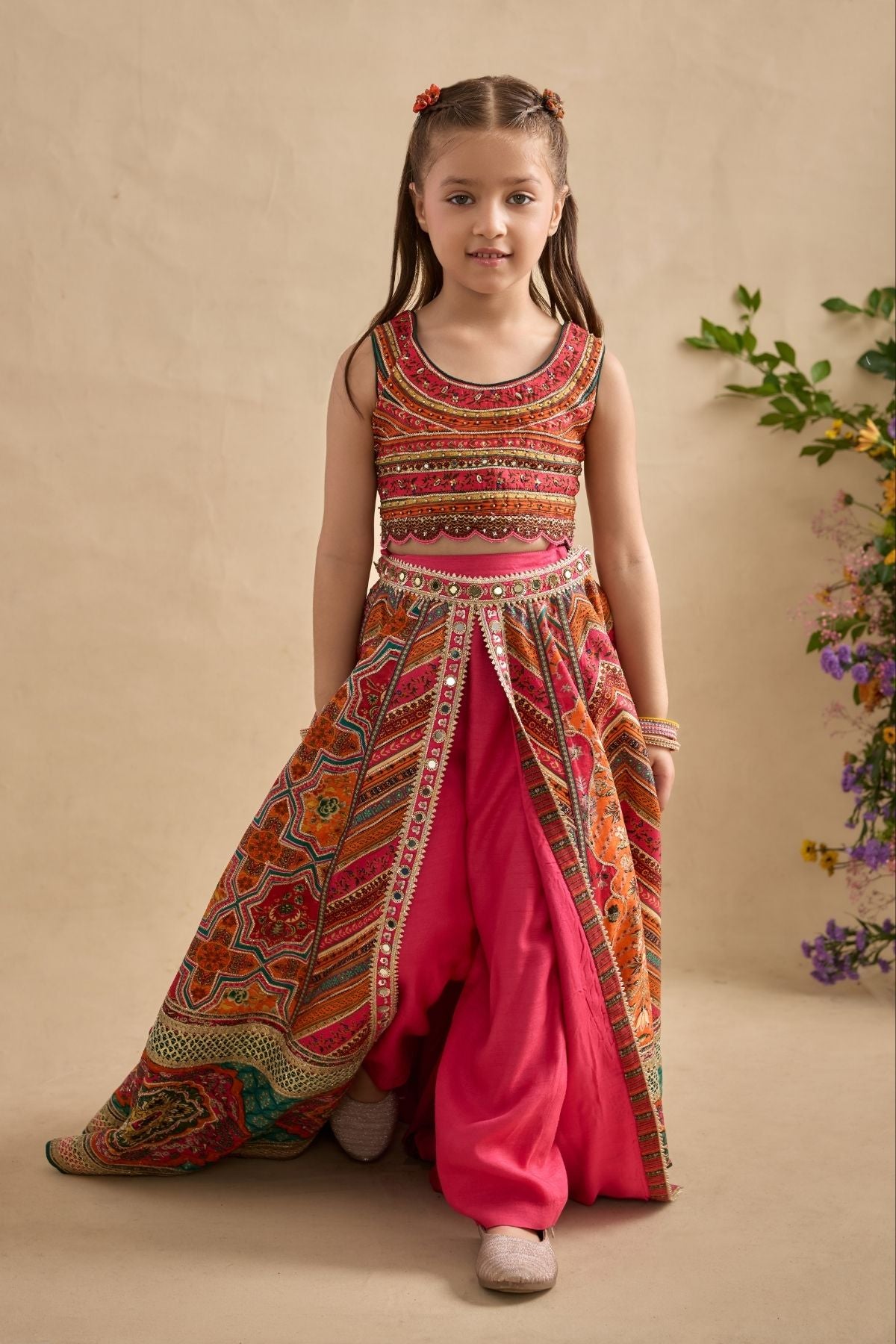 Adorn your princess with Classically Silhouette, Hand Painted and Printed With Floral Motifs In Vibrant Colours. It Is Intricately adorned with Embroidery And sequine.Bottom comes in Combination Of Palazzo Pants And Wrap Around Skirt.