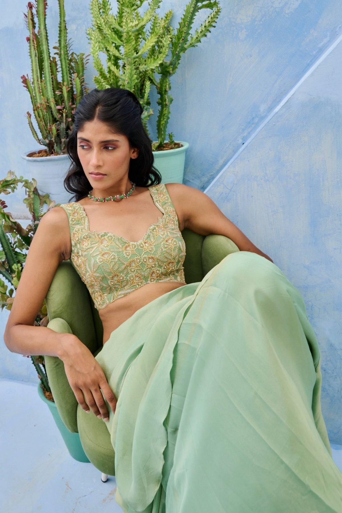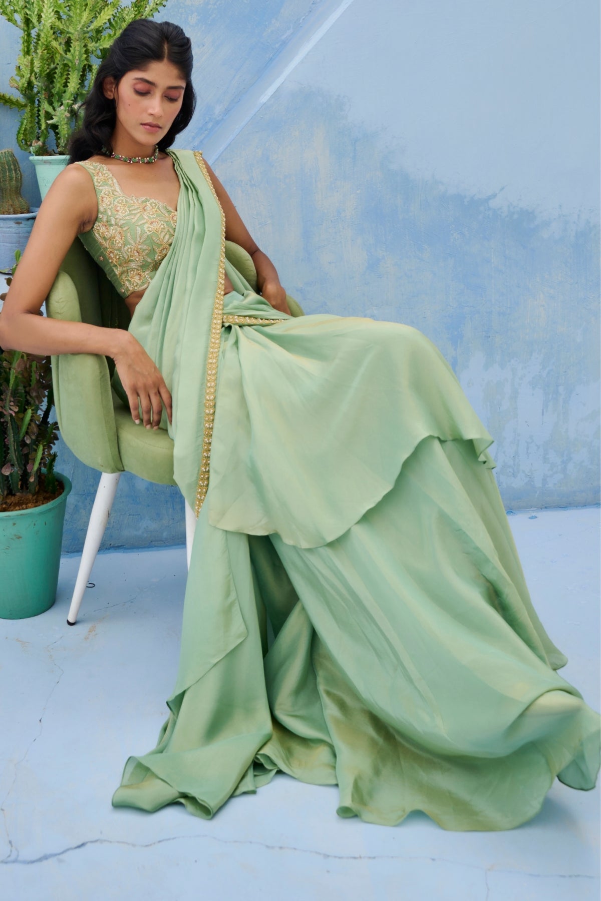 Tissue Silk pre-draped cascade saree with glassbeads embellished edging paired with glassbeads, pearl and sequence embroidered sweetheart neck blouse