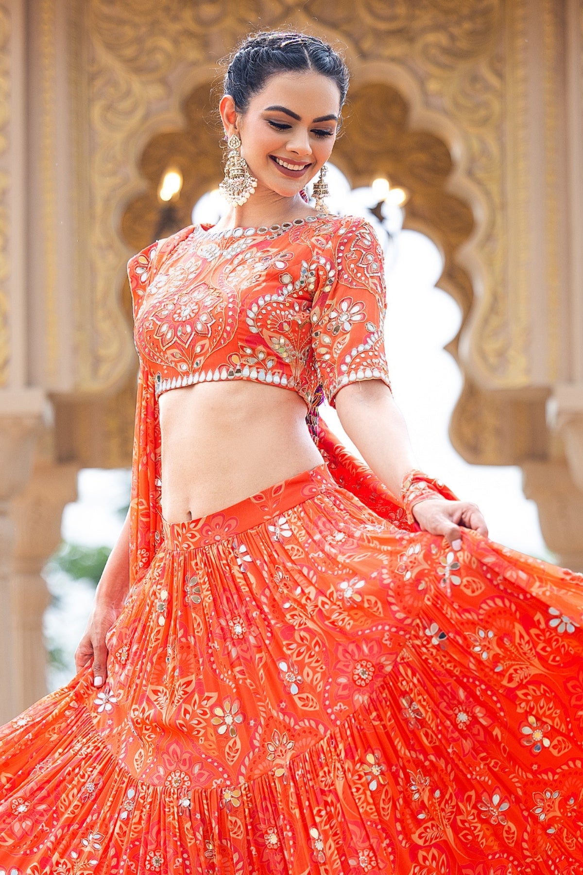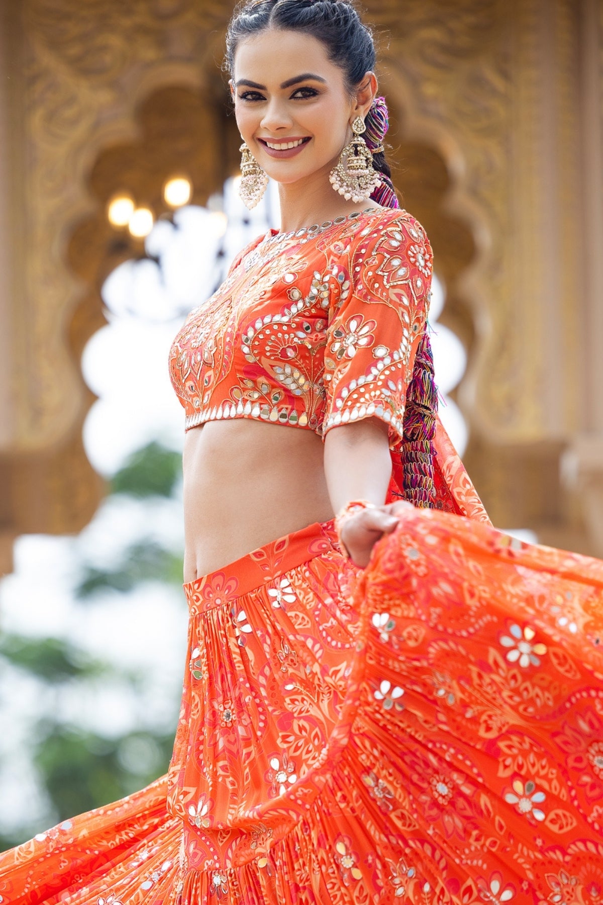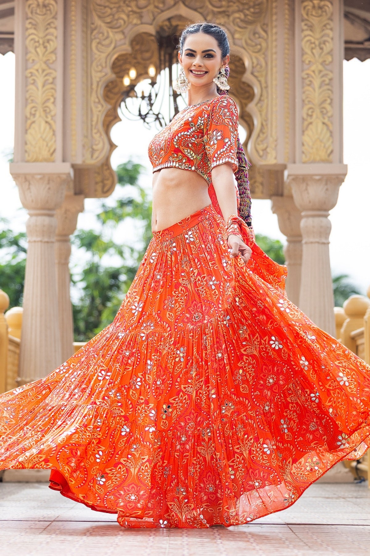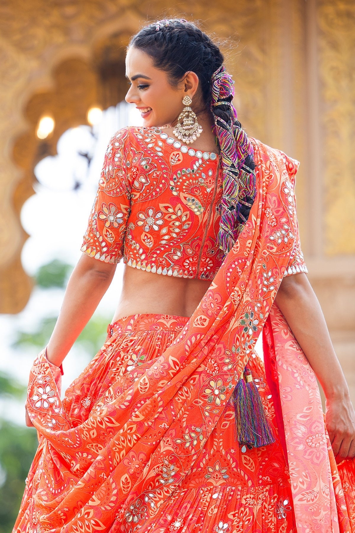 Description: Crafted in fluid georgette and drenched in a joyful orange print, this lehenga set is a celebration of stories untold—a blouse, lehenga, and dupatta ensemble, brought to life with all-over hand-embroidered mirror work that dances with every light it catches. Designed for the bride who’s not afraid to sparkle a little louder, this look twirls with movement, mischief, and memories—ready for sangeet nights, stolen glances, and laughter that refuses to stay quiet.