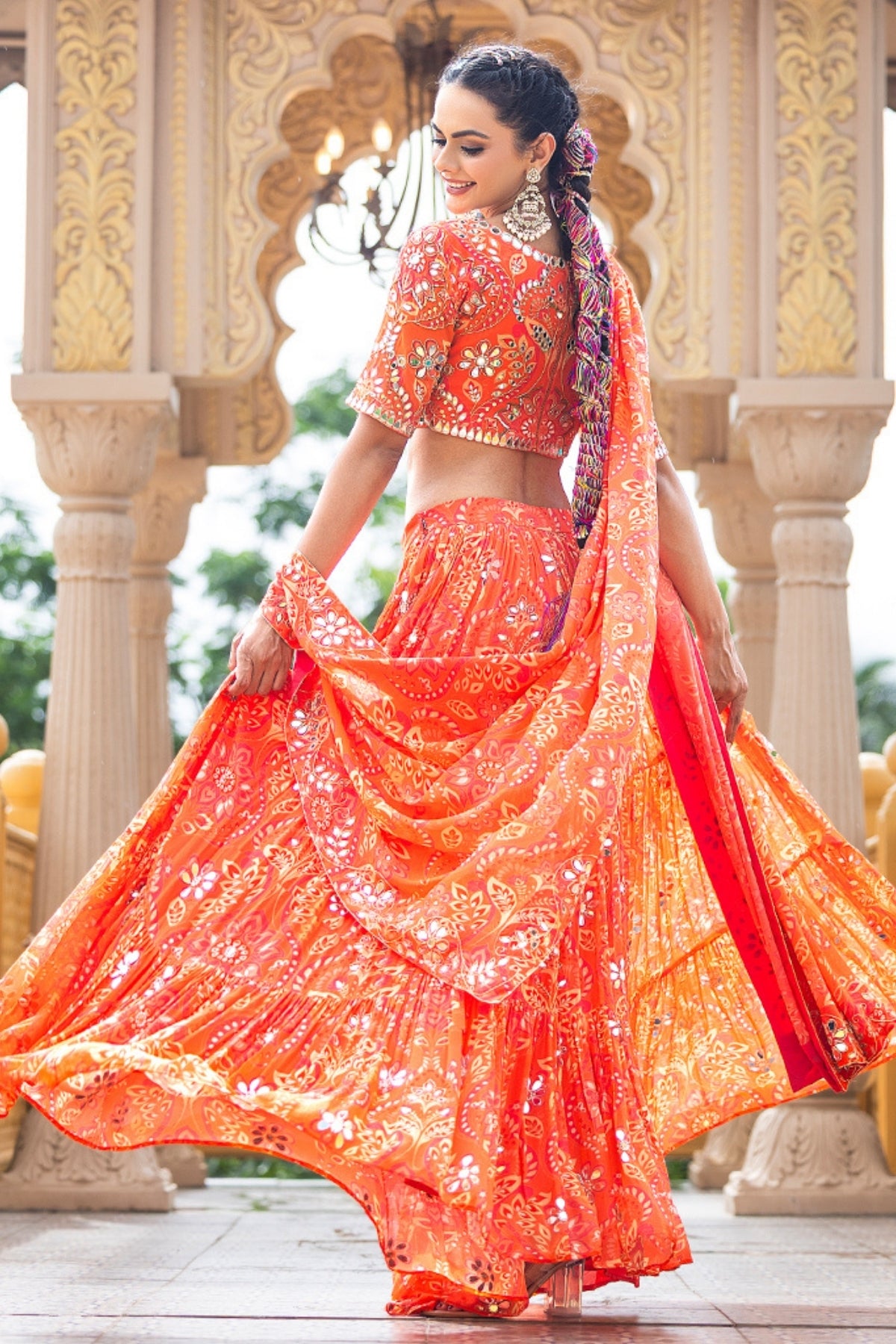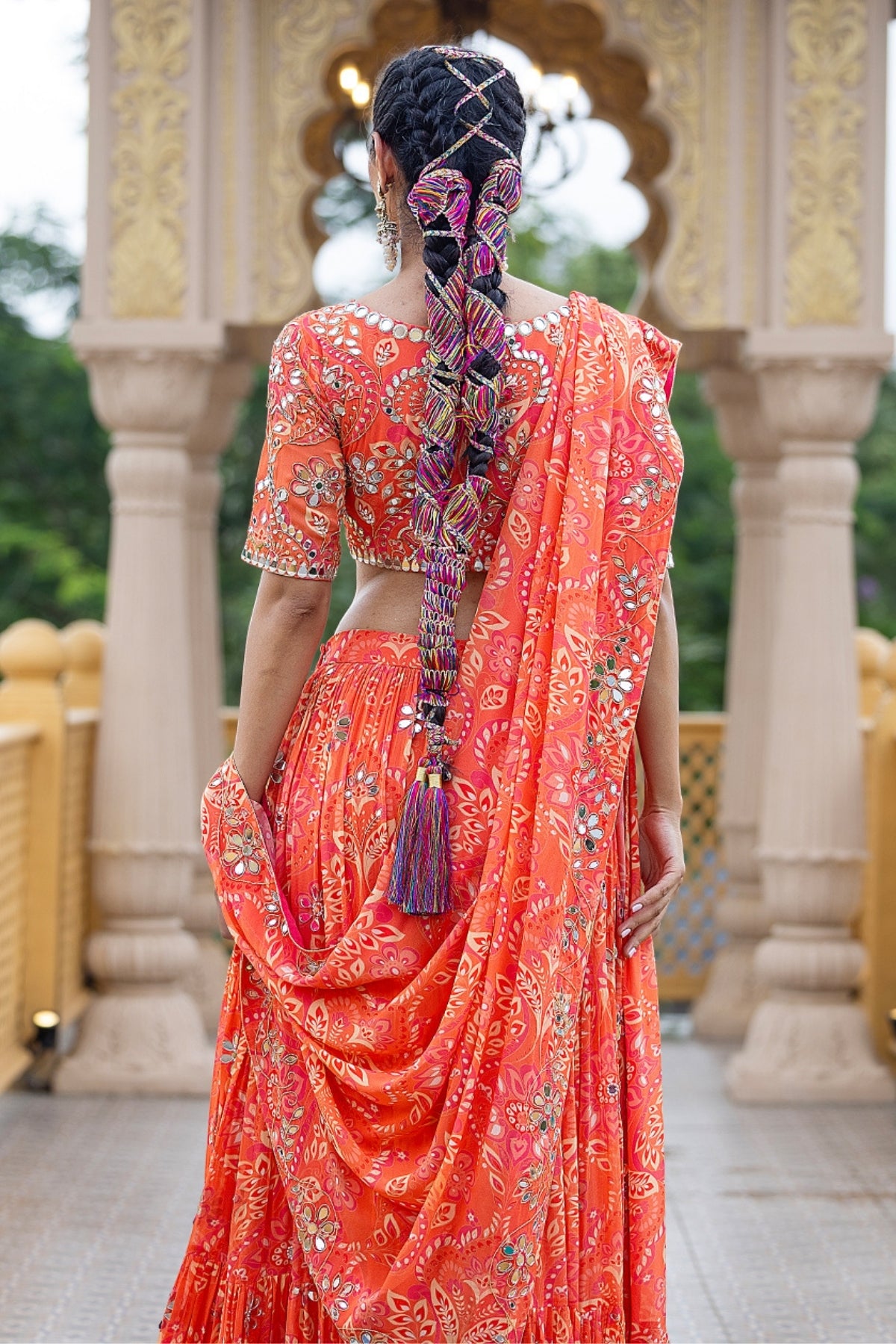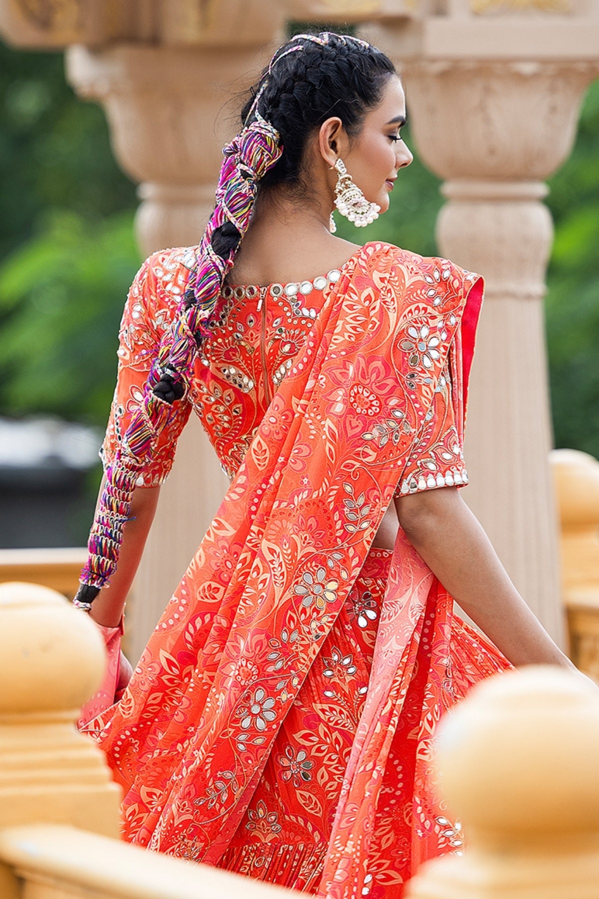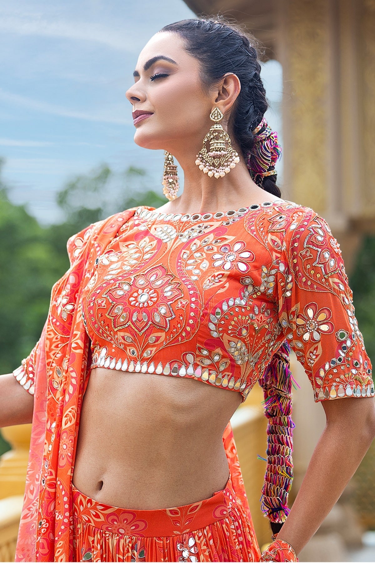 Description: Crafted in fluid georgette and drenched in a joyful orange print, this lehenga set is a celebration of stories untold—a blouse, lehenga, and dupatta ensemble, brought to life with all-over hand-embroidered mirror work that dances with every light it catches. Designed for the bride who’s not afraid to sparkle a little louder, this look twirls with movement, mischief, and memories—ready for sangeet nights, stolen glances, and laughter that refuses to stay quiet.