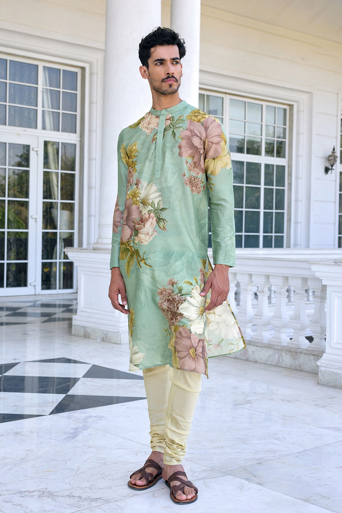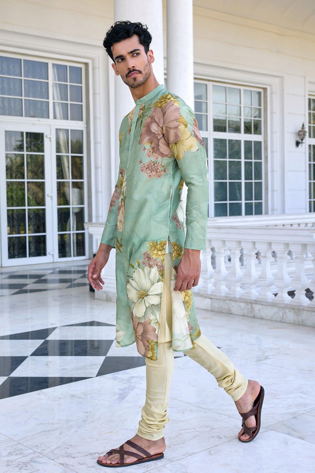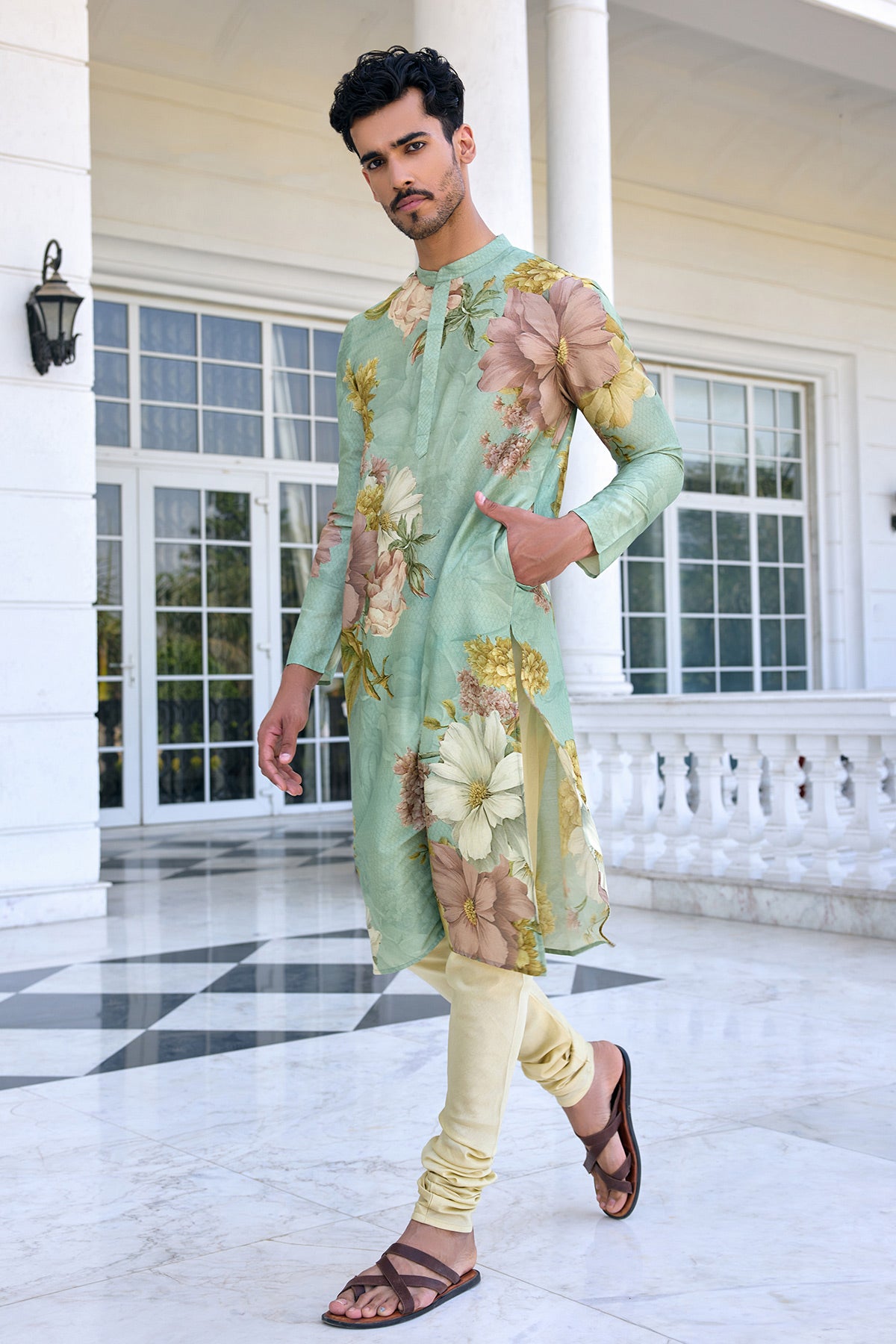 Look Daper In Ilyaz Kurta Set Designed In Vintage Floral Motifs Styled With A Coordinated Churidar In A Contrasting Solid Shade .A Perfect Outfit For Wedding And Festive Occasion.