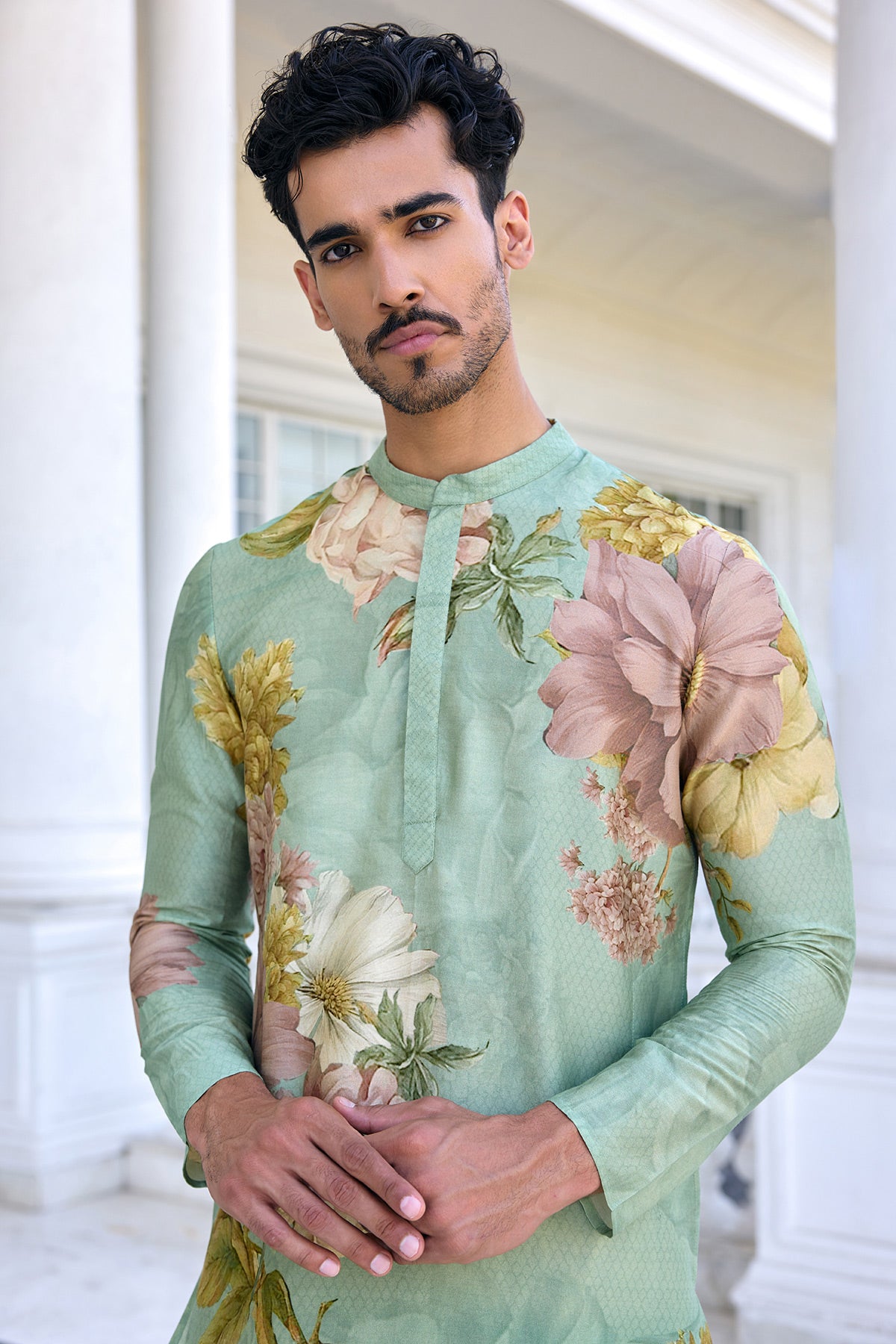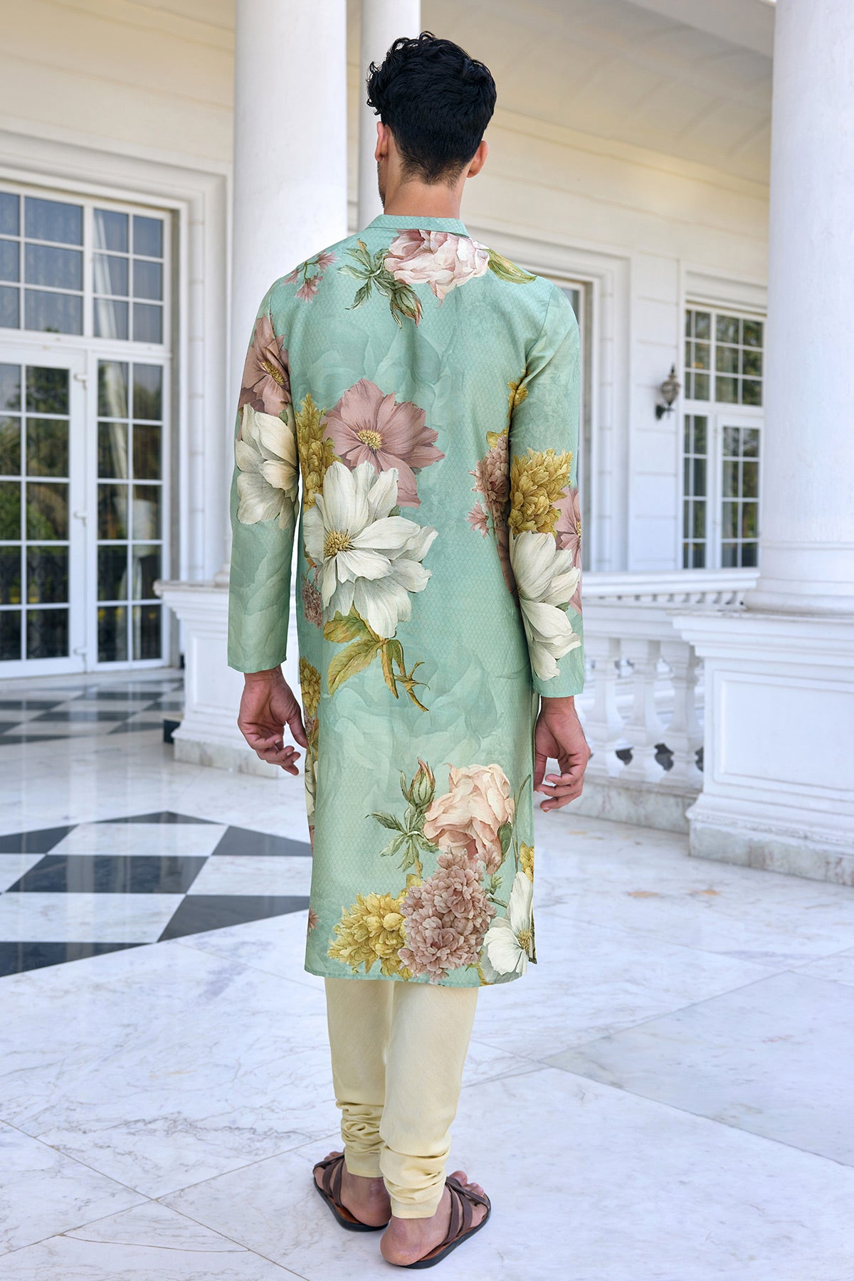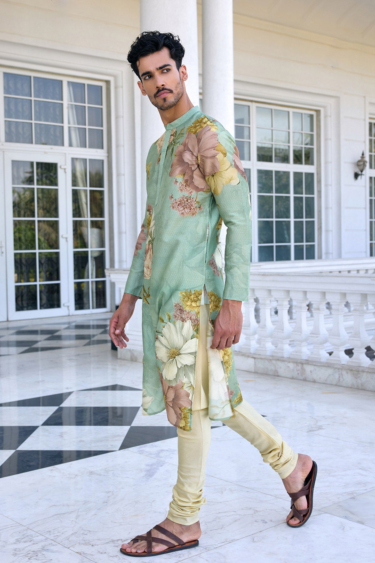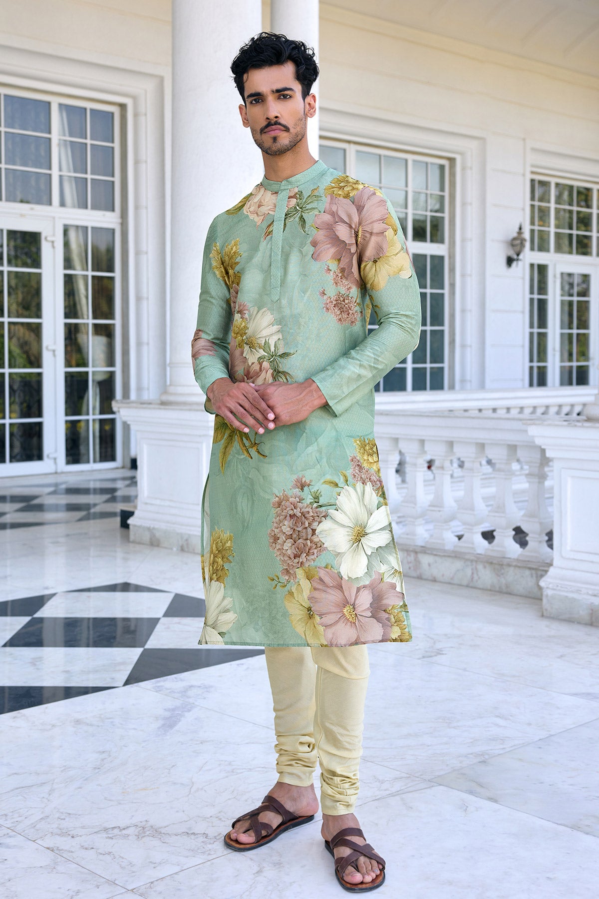 Look Daper In Ilyaz Kurta Set Designed In Vintage Floral Motifs Styled With A Coordinated Churidar In A Contrasting Solid Shade .A Perfect Outfit For Wedding And Festive Occasion.