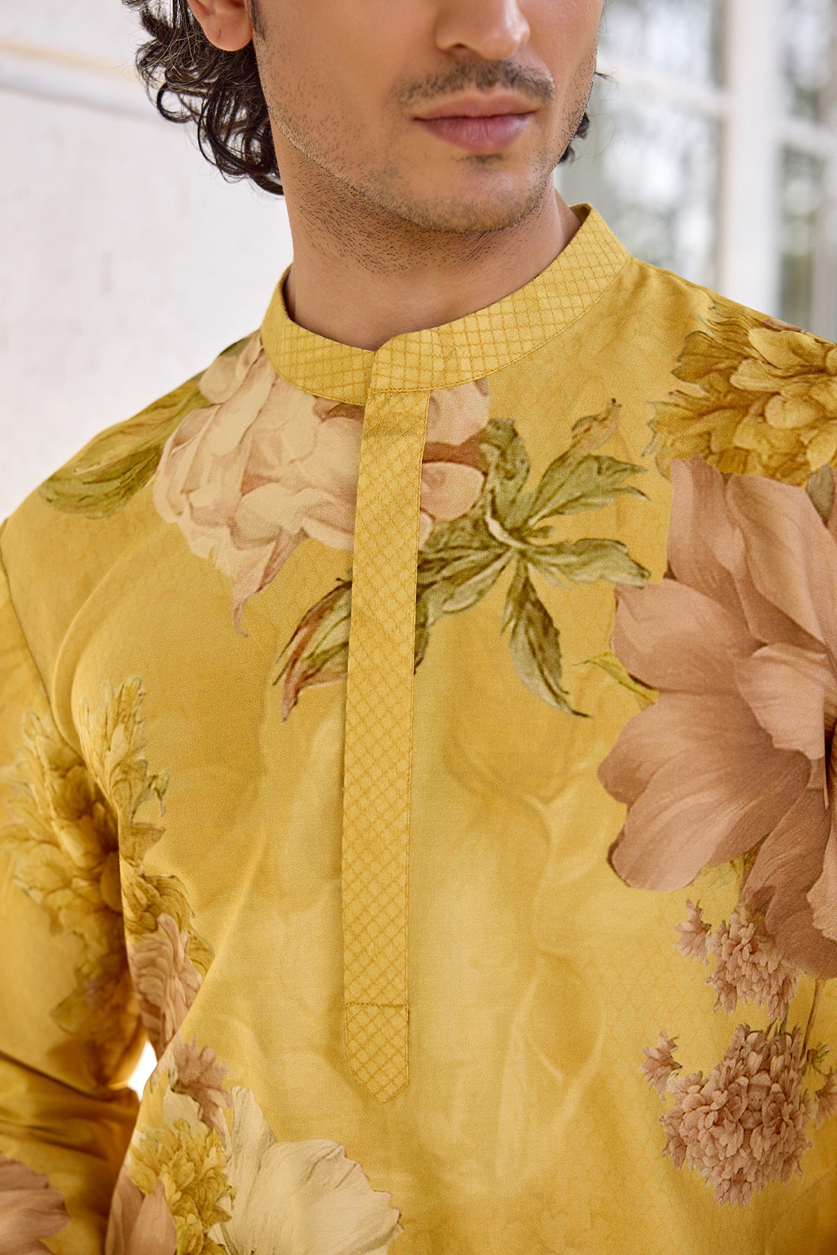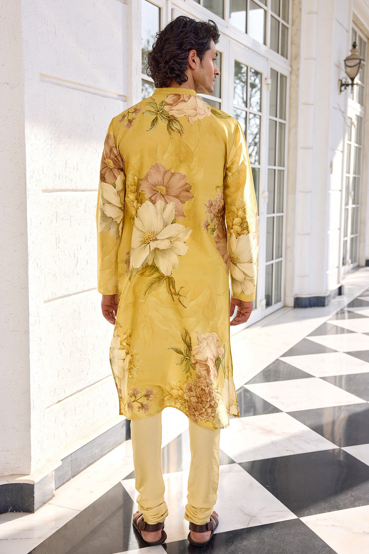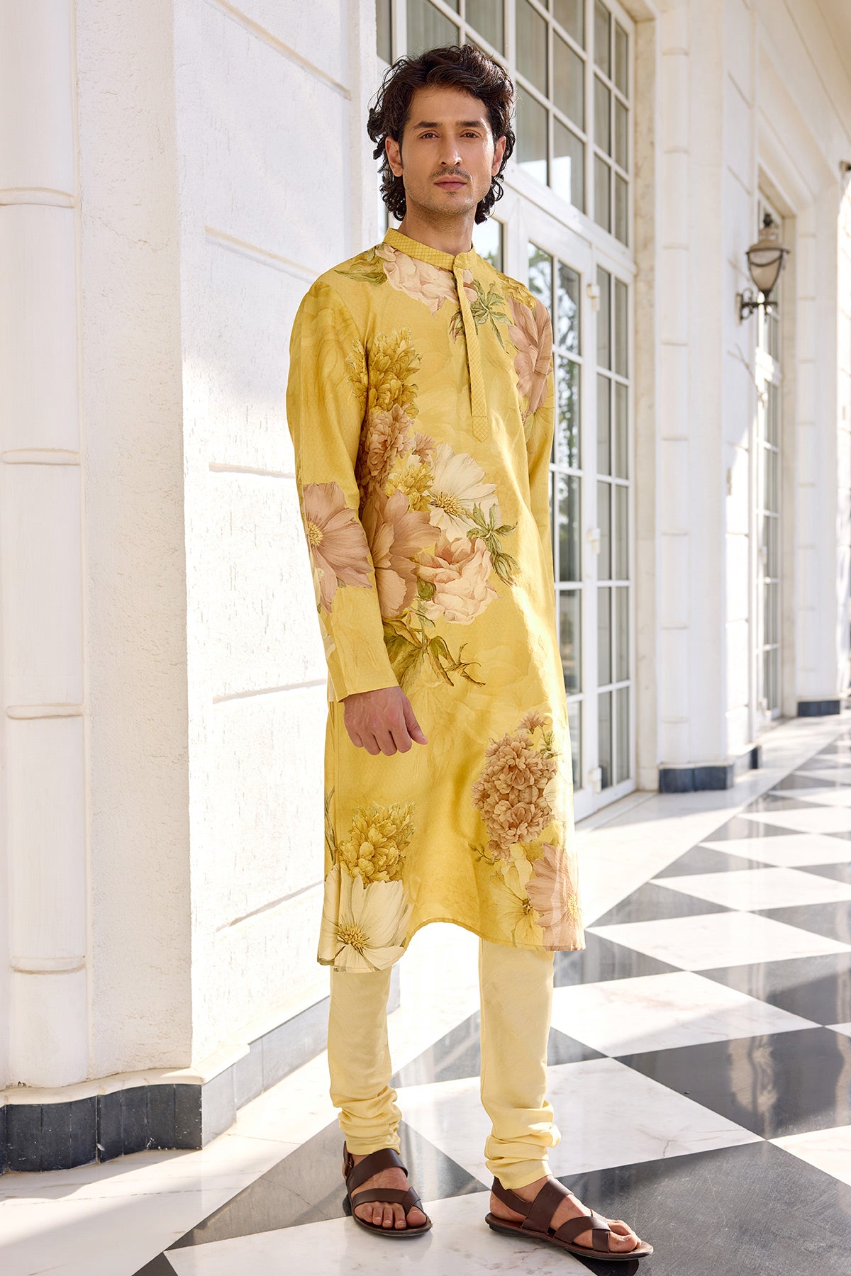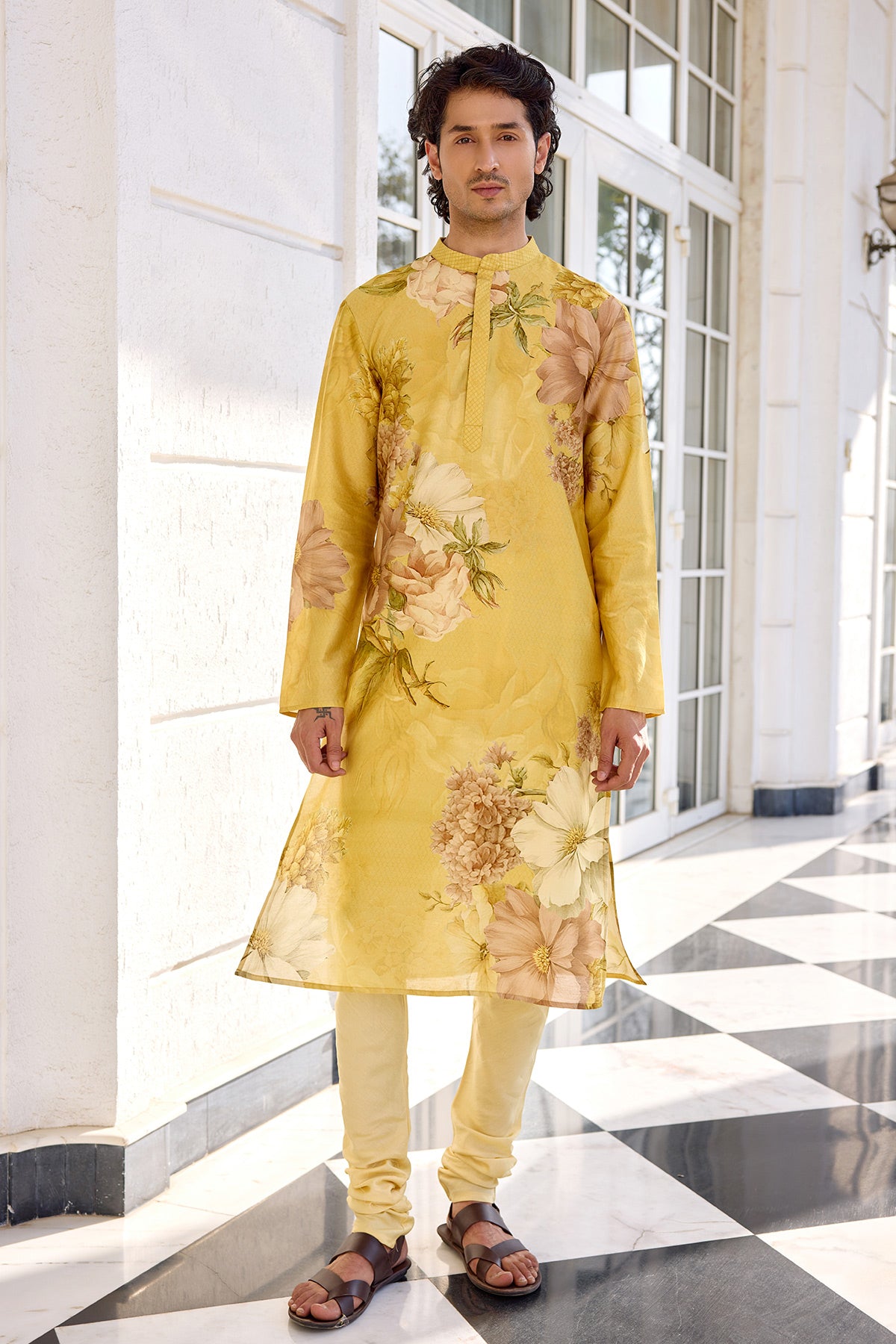 Look Daper In Ilyaz Kurta Set Designed In Vintage Floral Motifs Styled With A Coordinated Churidar In A Contrasting Solid Shade .A Perfect Outfit For Wedding And Festive Occasion.