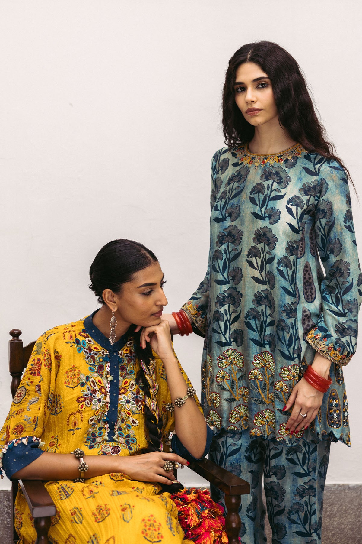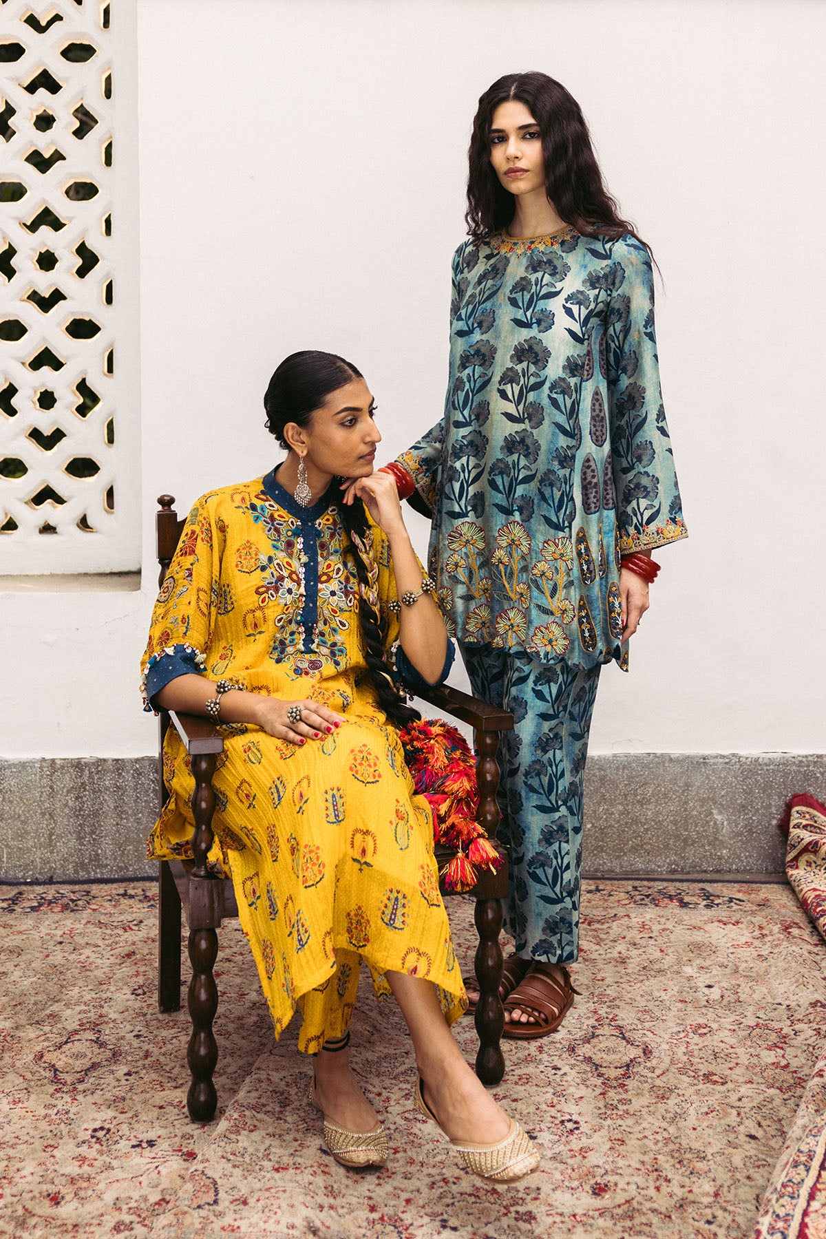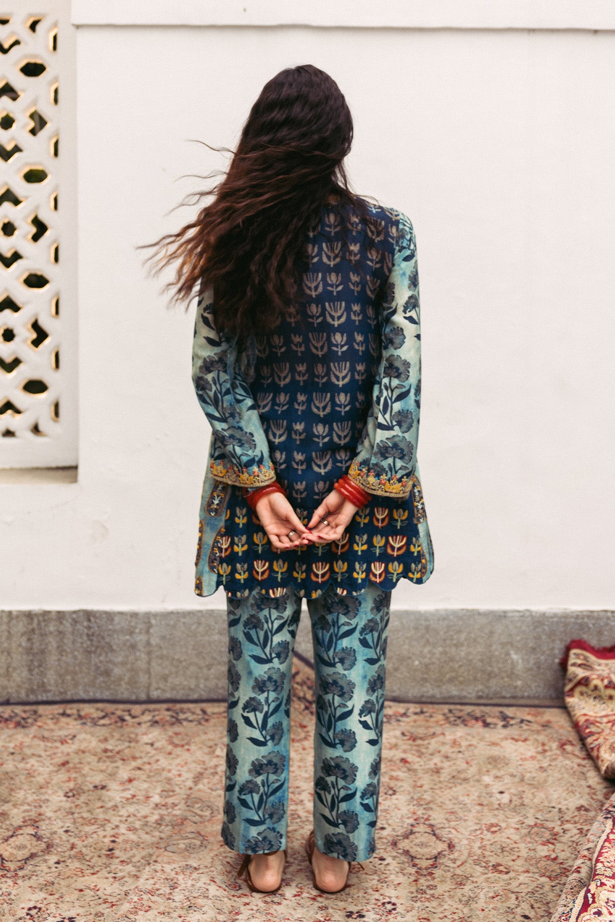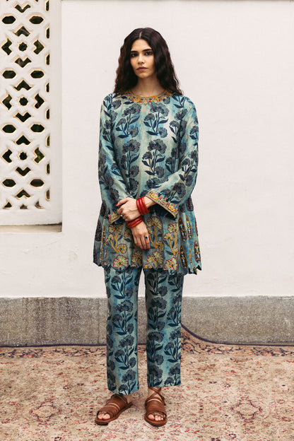 Indgo printed higlighted hem short Kurta with printed pants