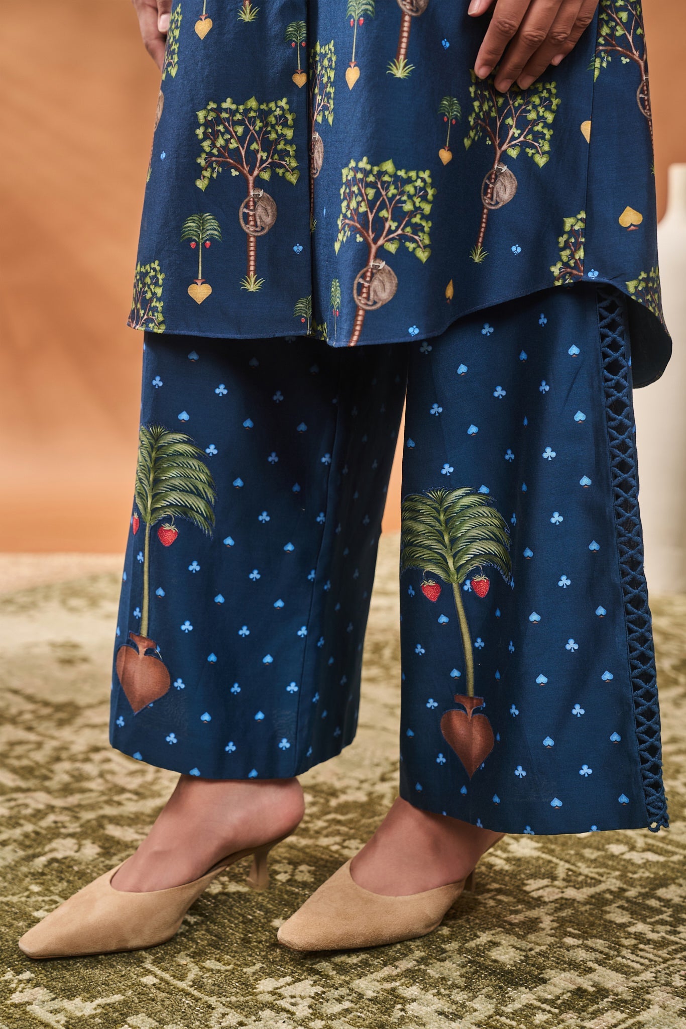 Tunic- All over printed tunic |A-line| 'V' neckline and sleeves hem adorned with hand embroidery Pant- Green straight pants | Side seam closure