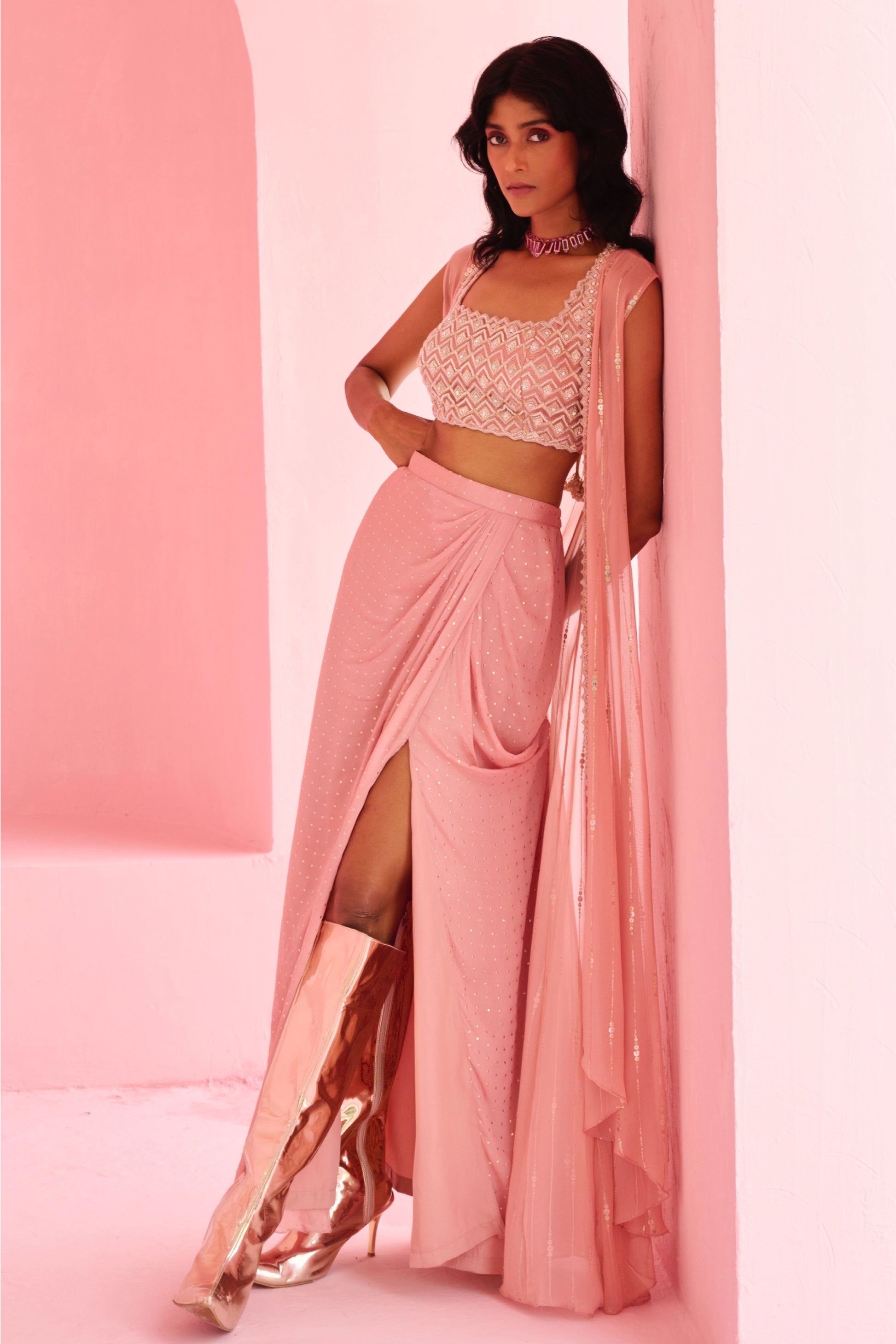 Drape skirt paired with pearl and zardozi embroidered top and embellished georgette jacket