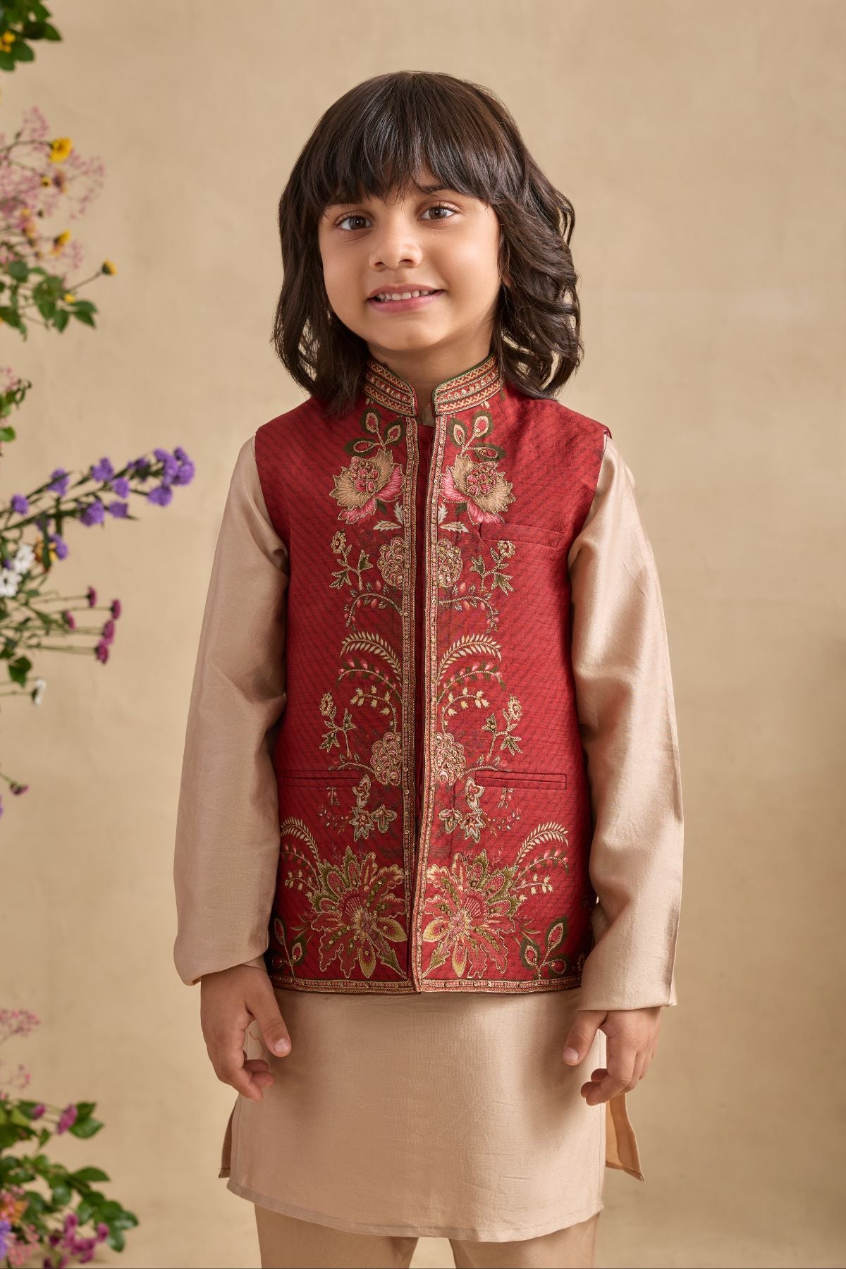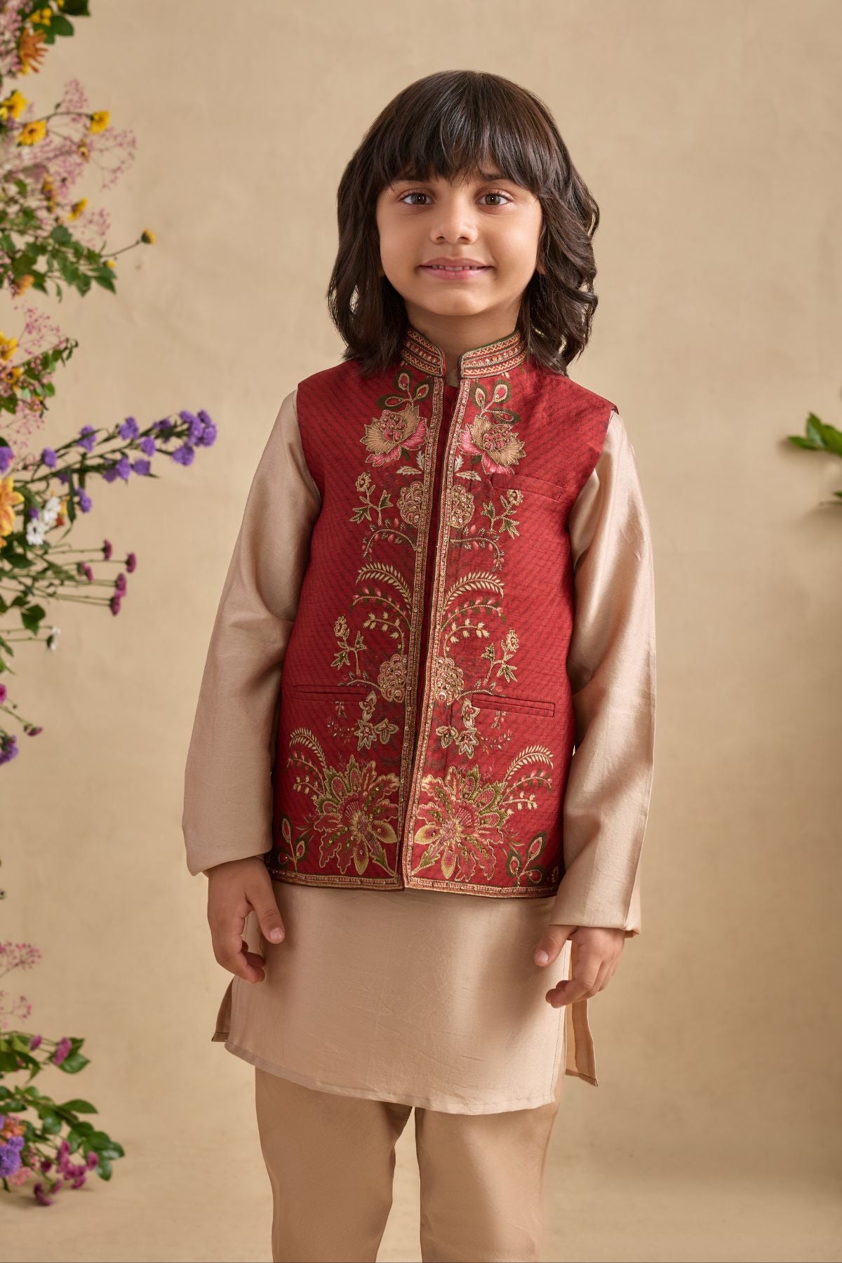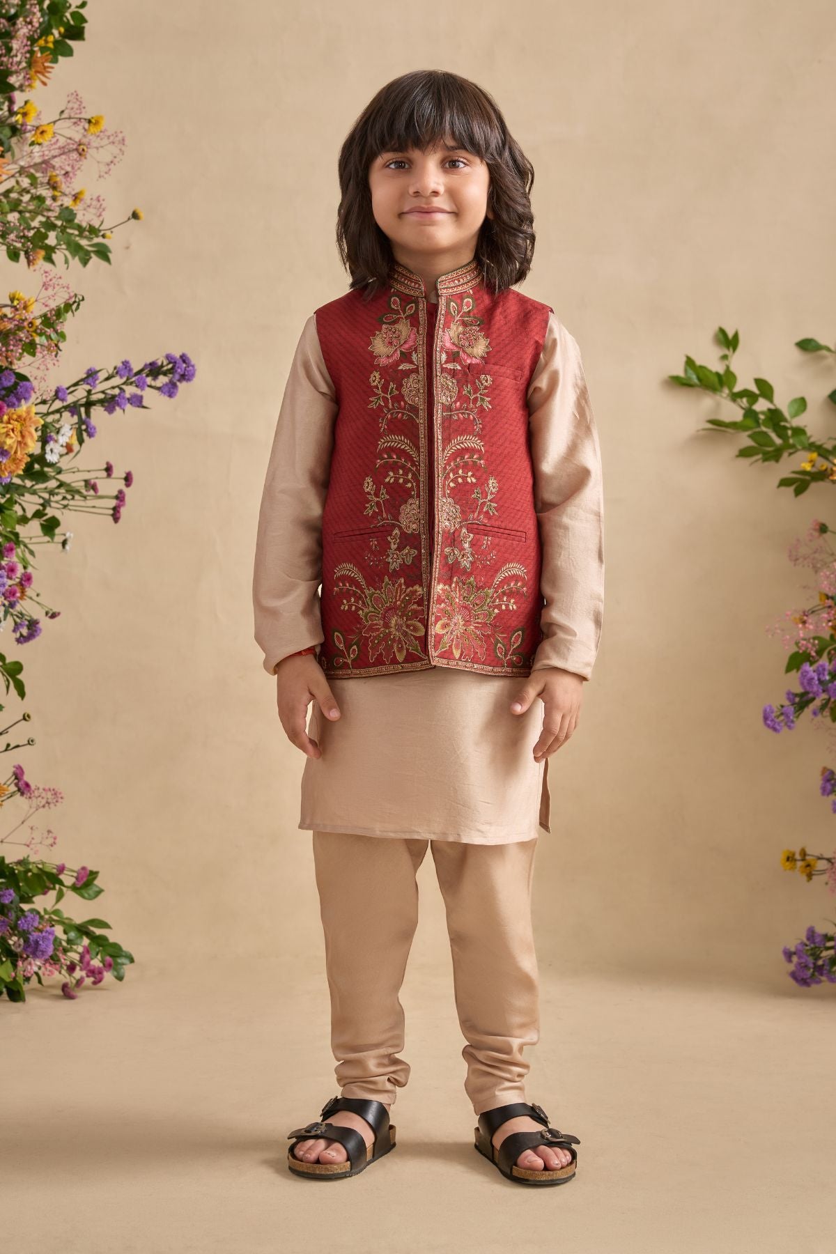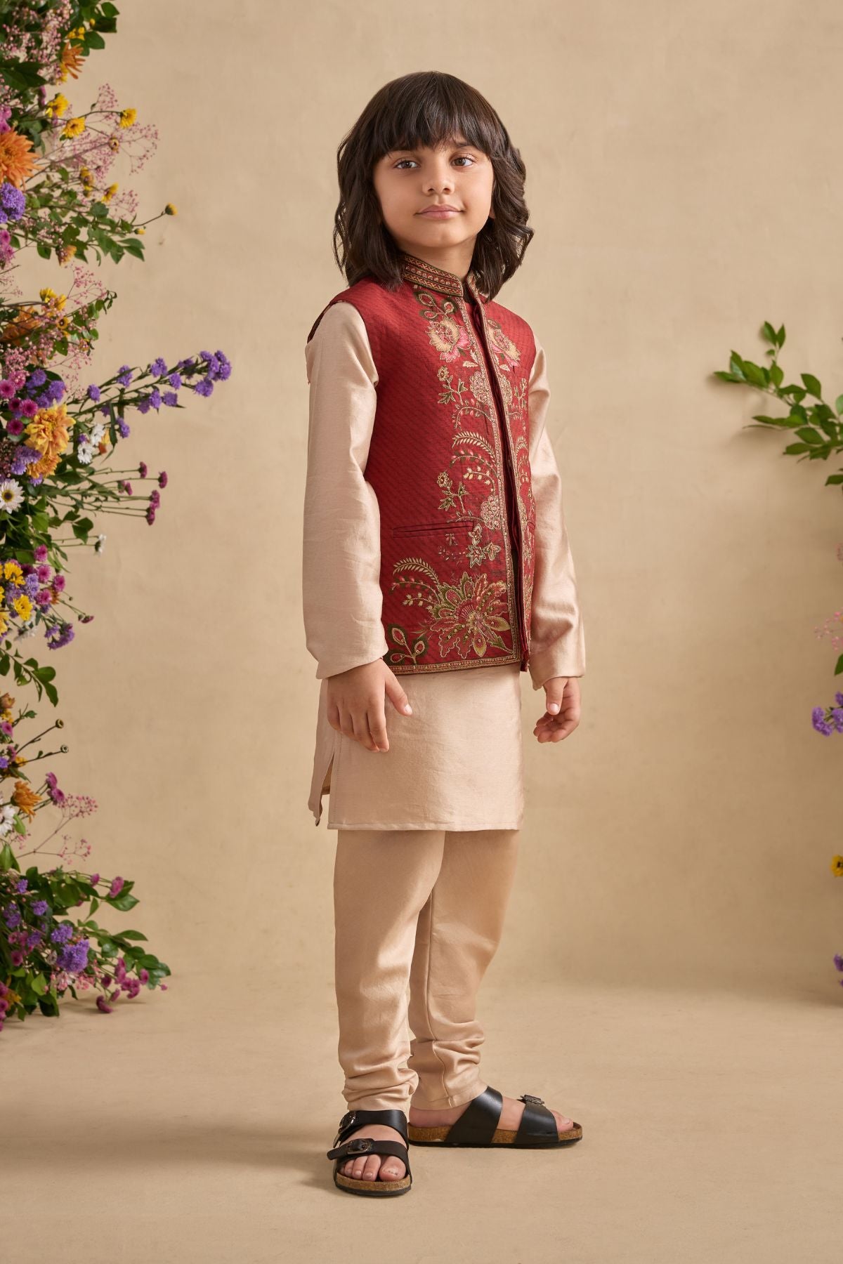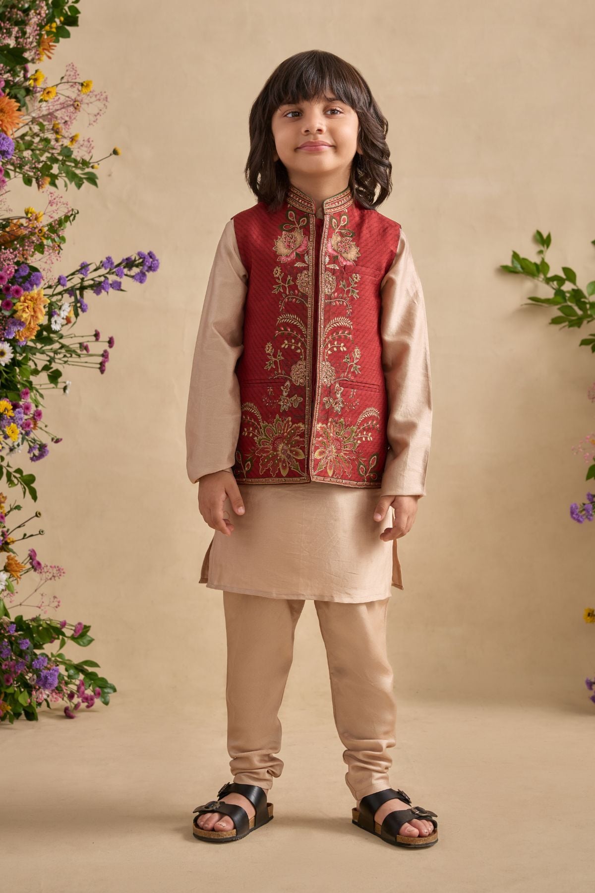 Beautifully crafted Ishvik Bandi set to make your kid giving style statement , incricate detailing along the placket makes it even more attractiv . Perfect outfit to ace that contemporary Indian look.