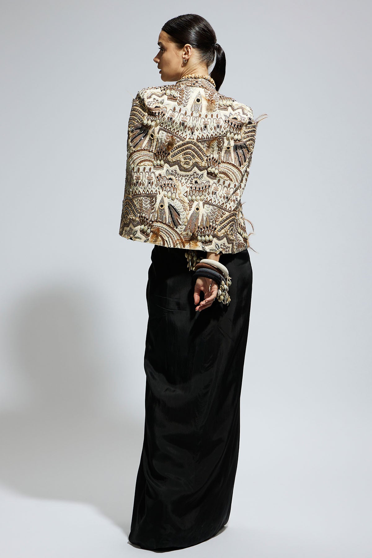 Ivory Abstract Feather Cape Jacket Paired with 3 D Scallop Bustier and Black High Slit Skirt