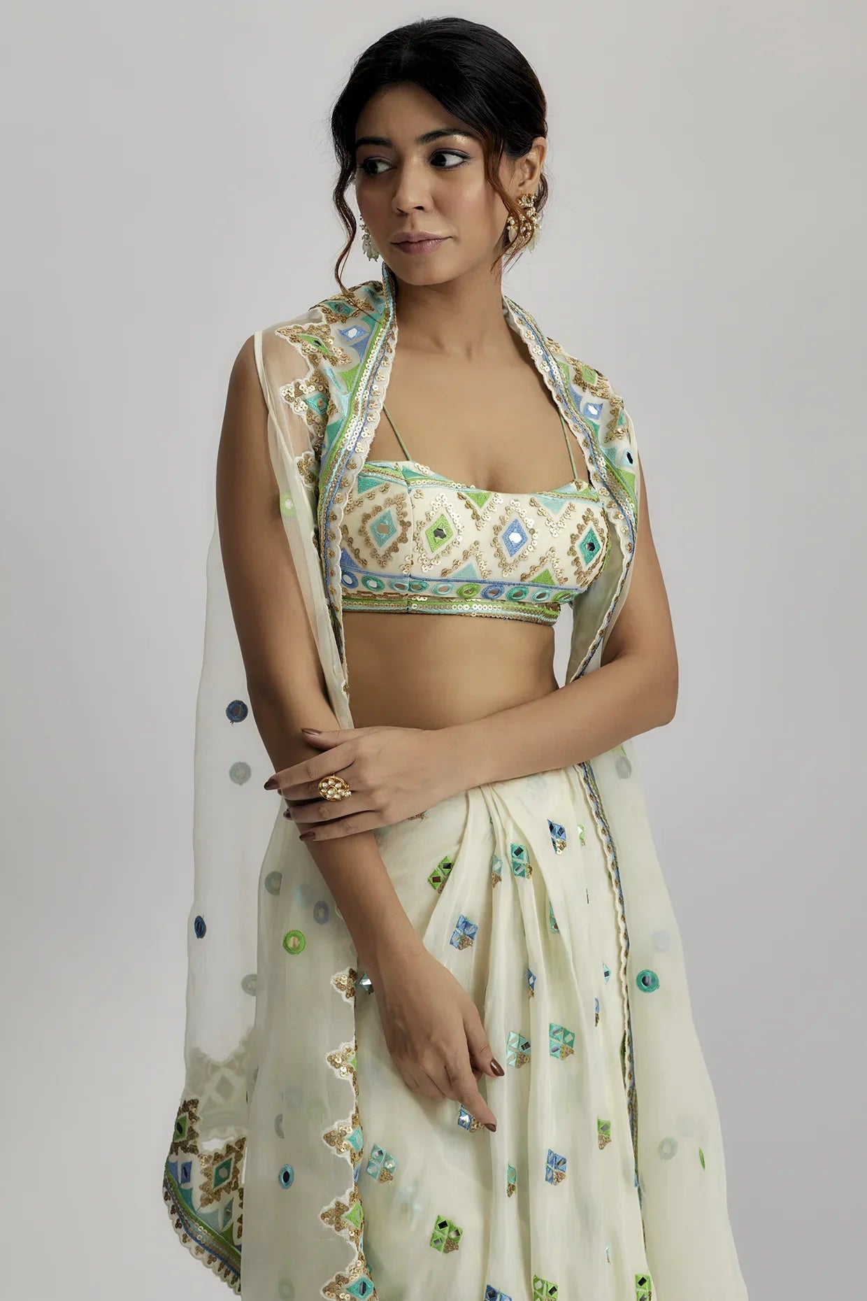 - Fabric Composition: Cape - Organza, Pants - Georgette, Blouse - Georgette