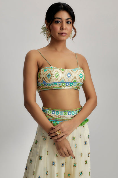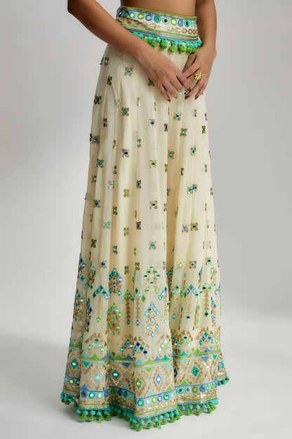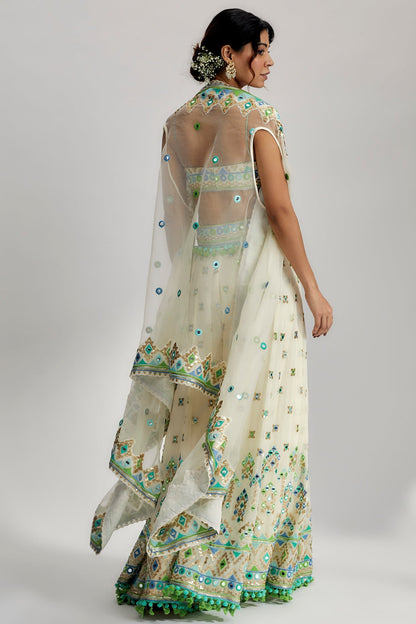 The Imrat Cape Set with Pants is a work of art that celebrates craftsmanship and beauty. This stunning ensemble, featuring a cape and flared pants, combines traditional elegance with contemporary flair. Crafted with exquisite attention to detail with thread and sequins embroidery, this outfit is sure to make you the center of attention at any glamorous wedding ceremony.